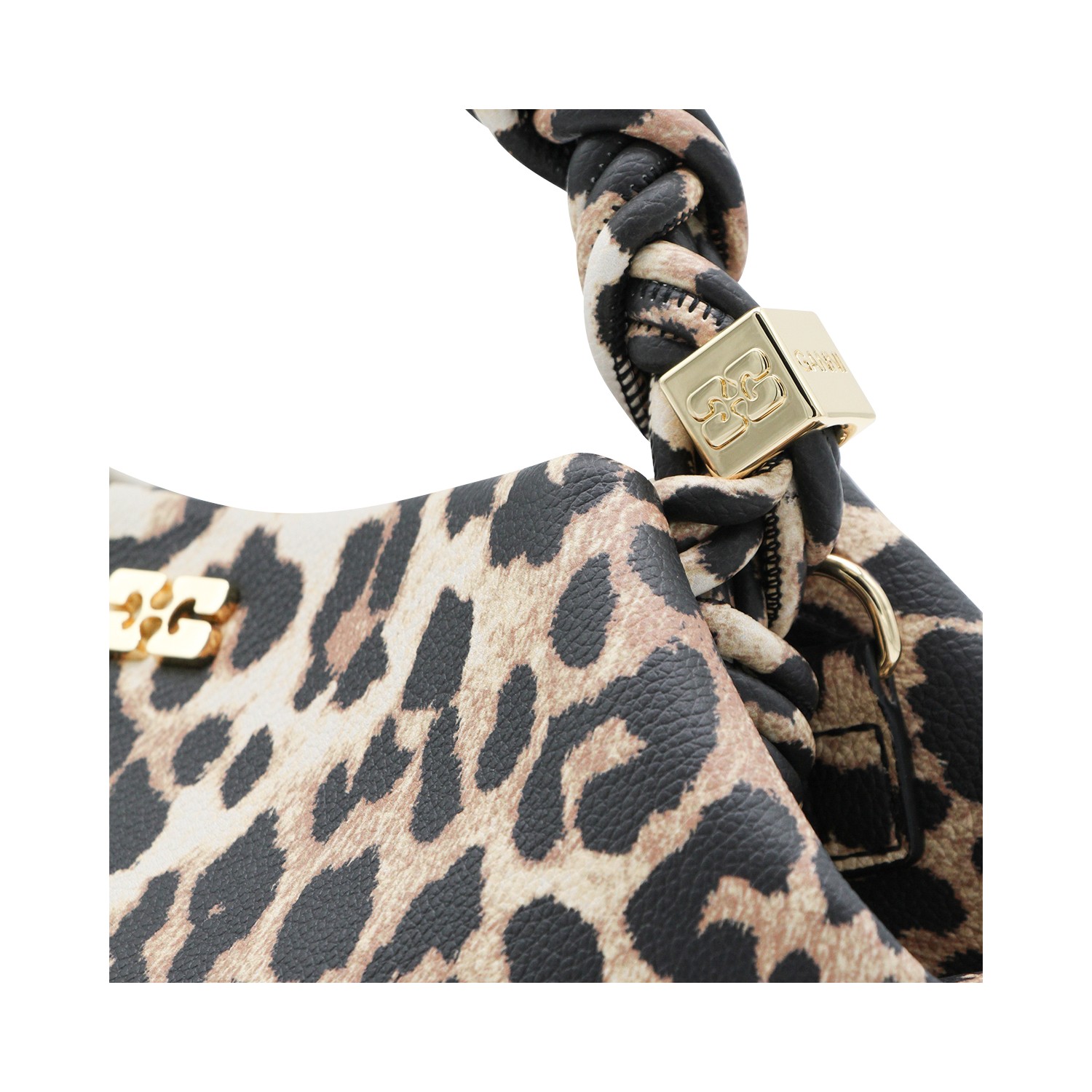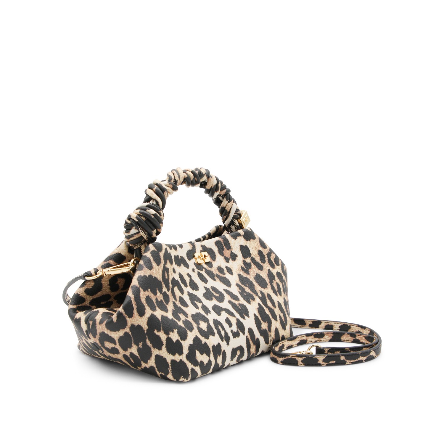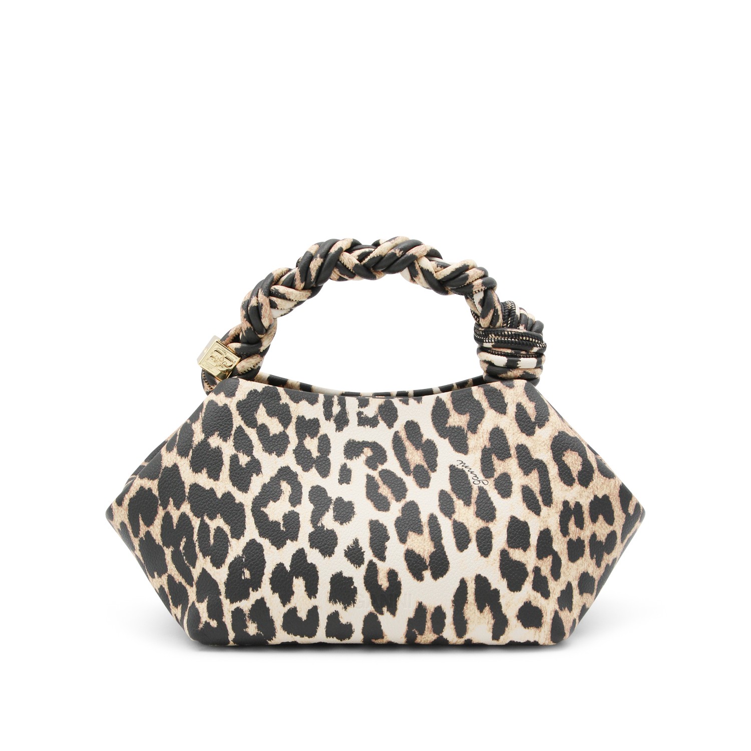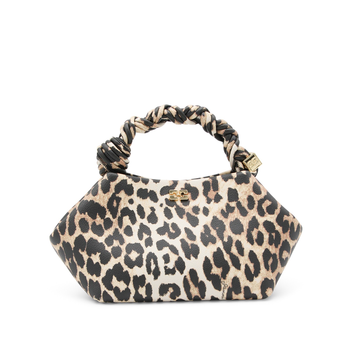 Leopard top handle bag from Ganni featuring top handle, main compartment, button fastening, removable strap and frontal logo.