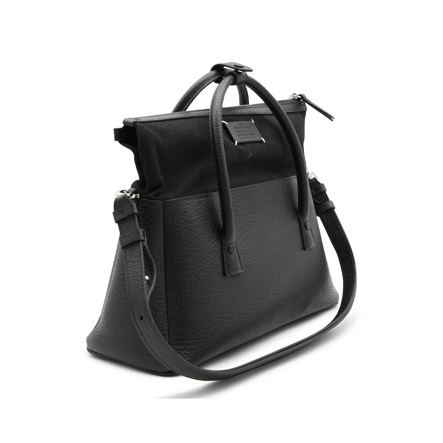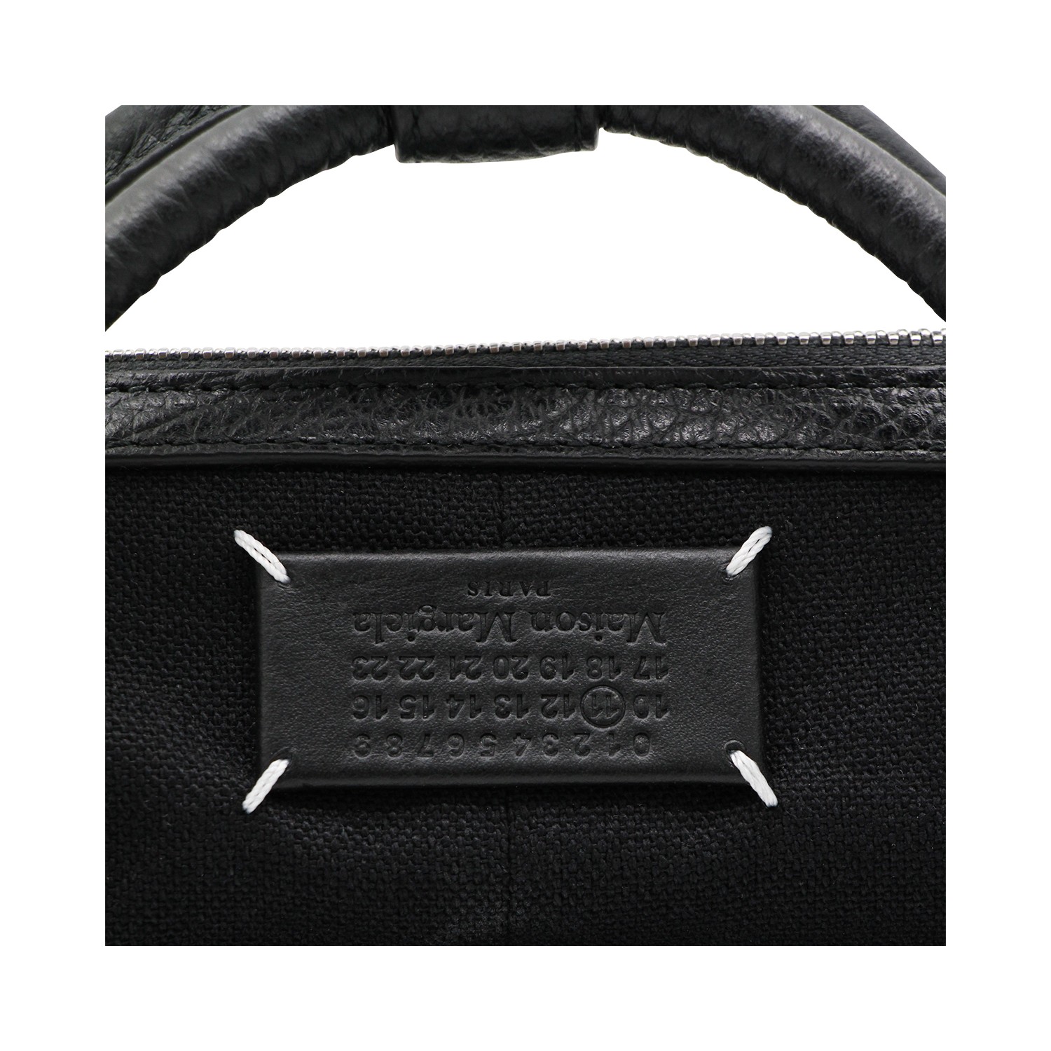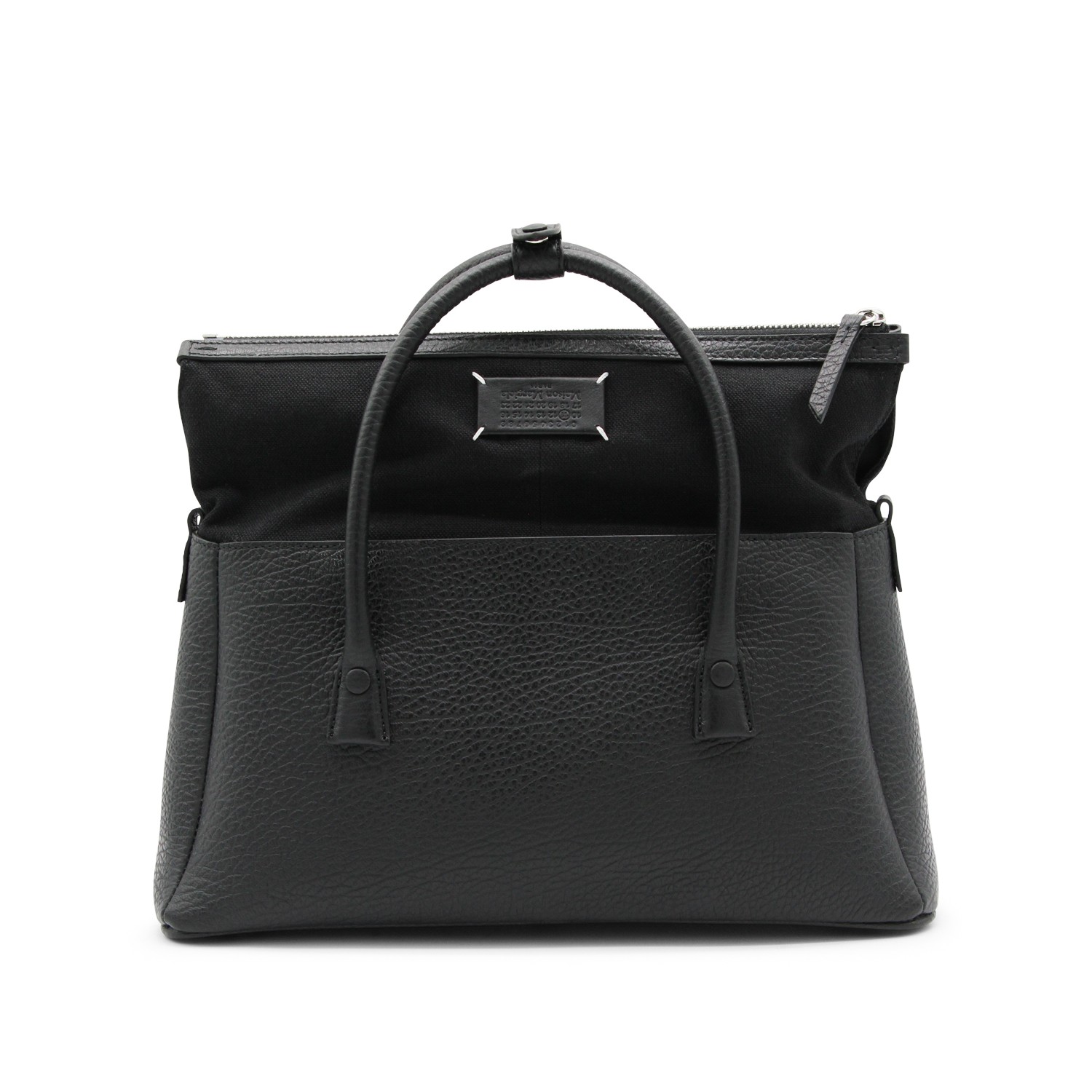 Black leather top handle bag from Maison Margiela featuring top handles, zip fastening, main compartment and frontal logo patch.