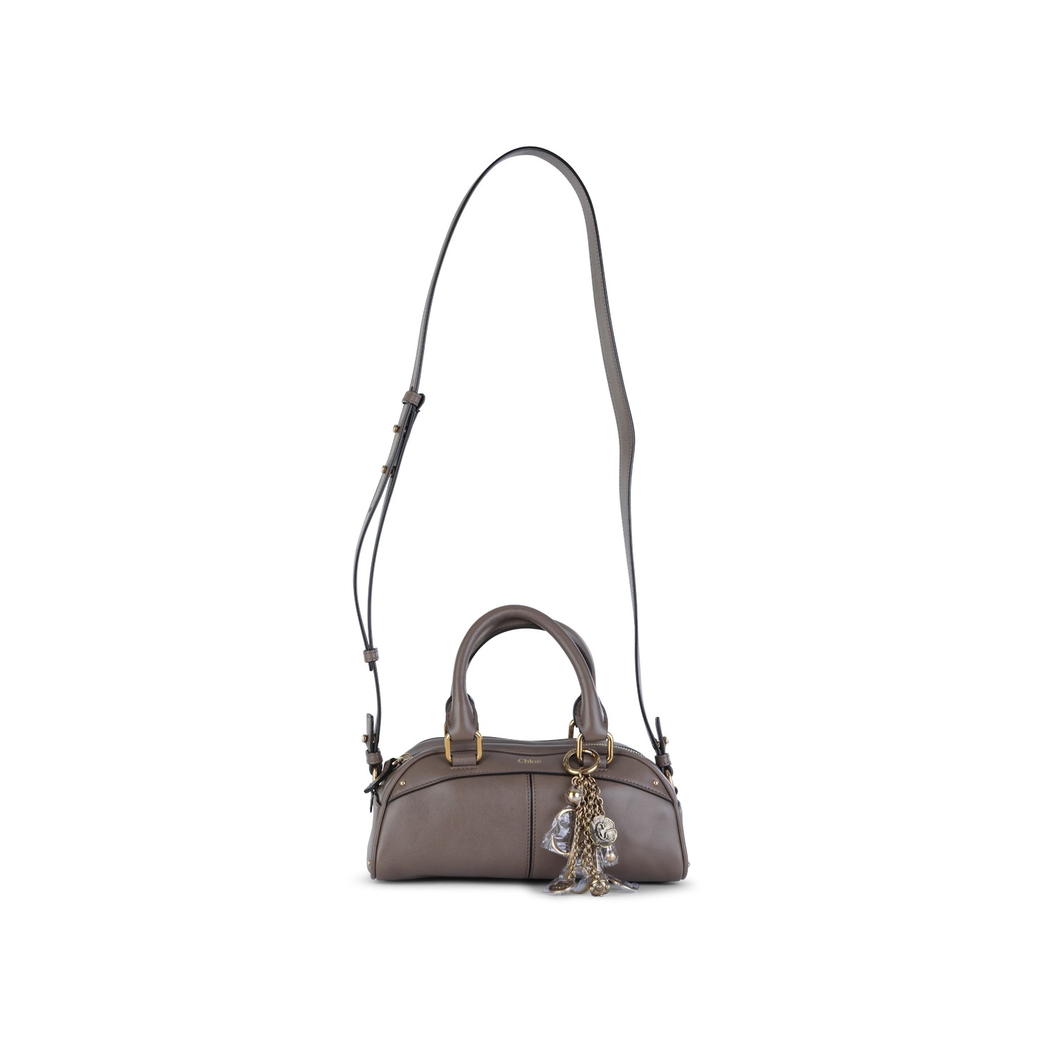 Grey leather ChloBowling top handle bag from Chlofeaturing top handles, adjustable strap, main compartment, zip fastening, charms and gold tone hardware.