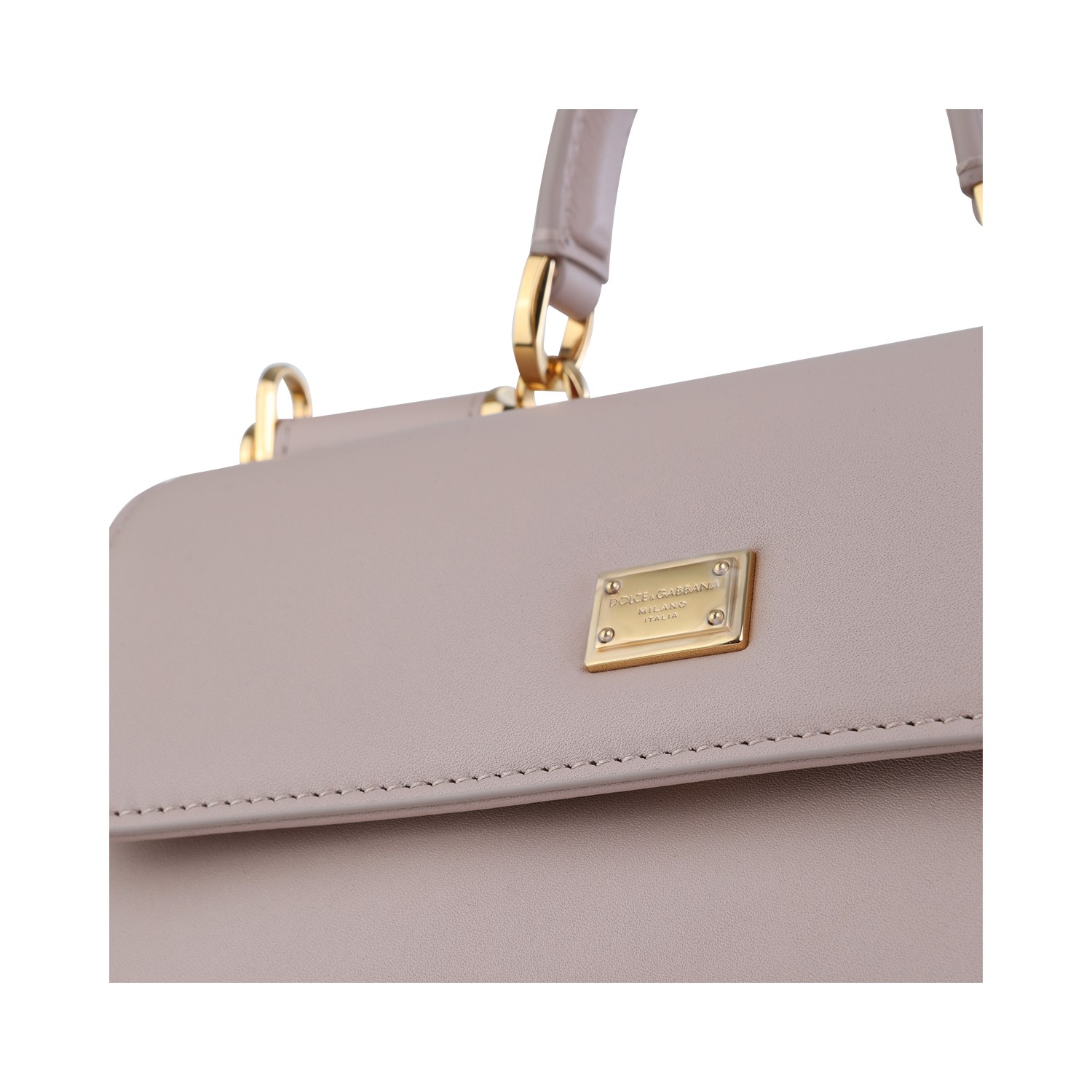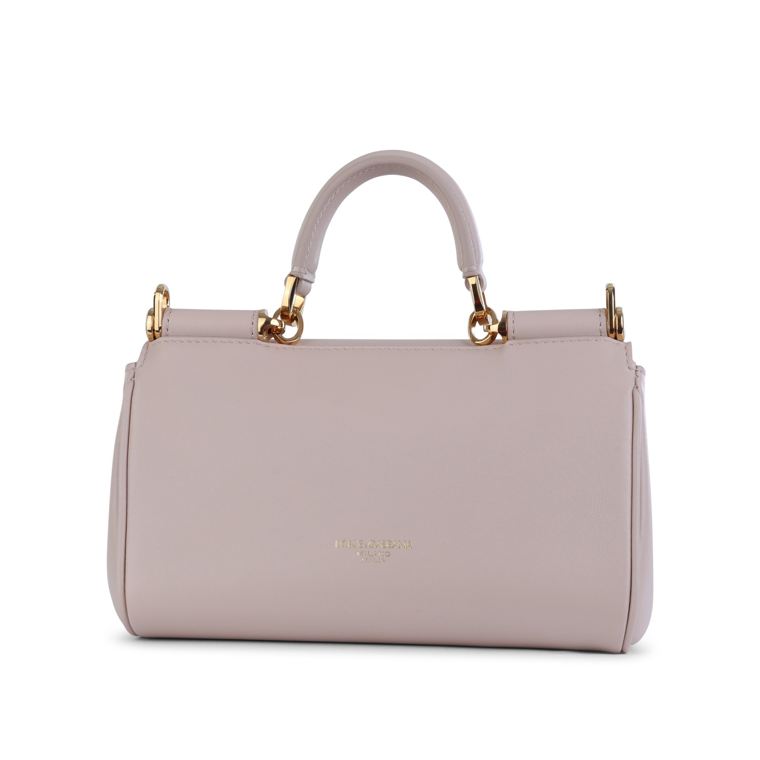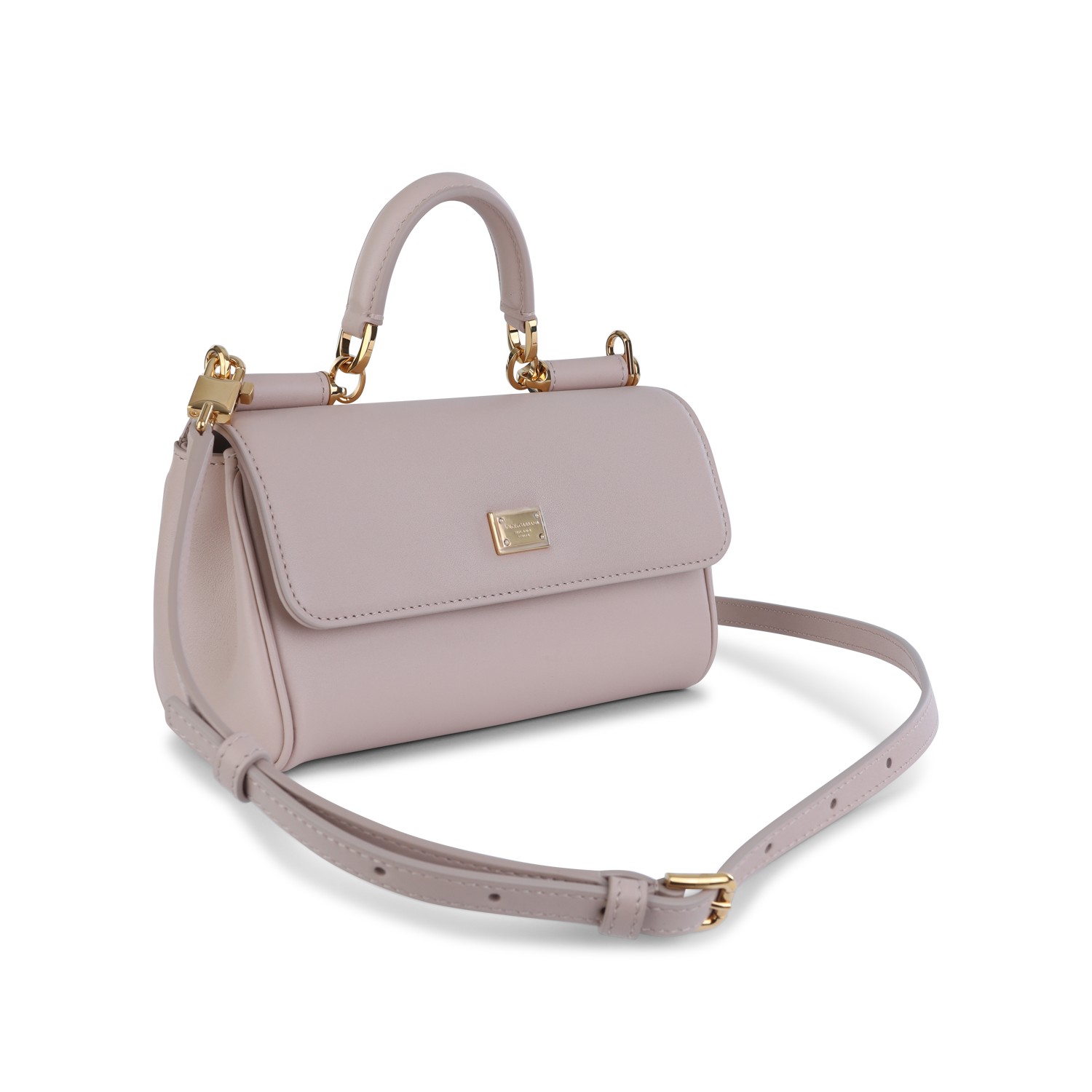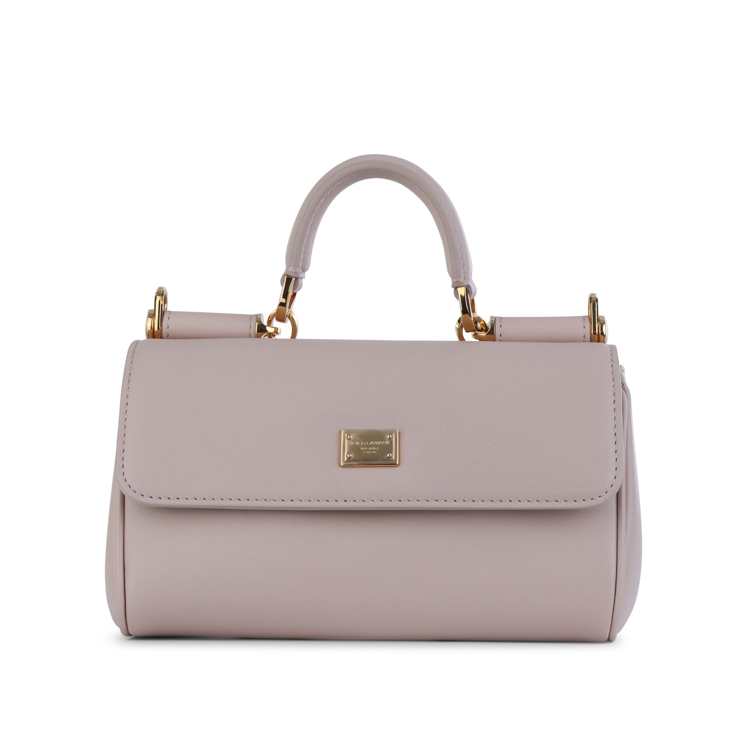Nude leather My Sicily small top handle bag from Dolce & Gabbana featuring top handle, gold tone metal hardware, adjustable and removable shoulder strap, tuck-in closure, main compartment and internal zip pocket.