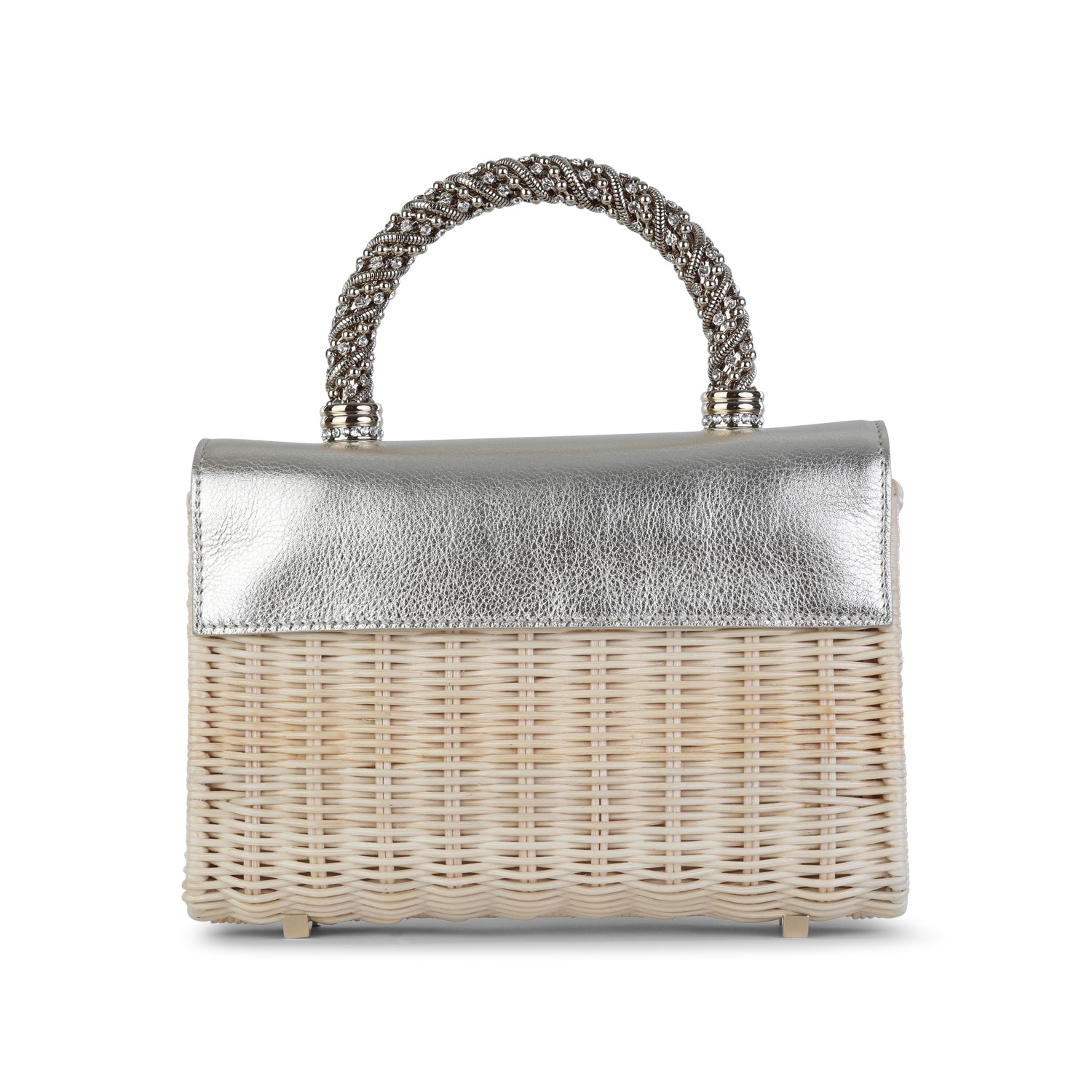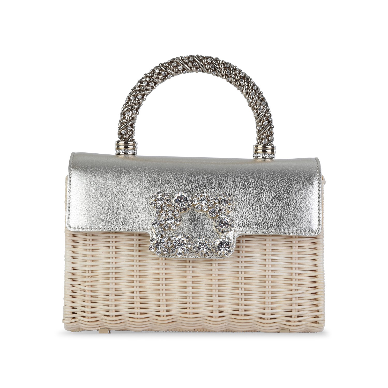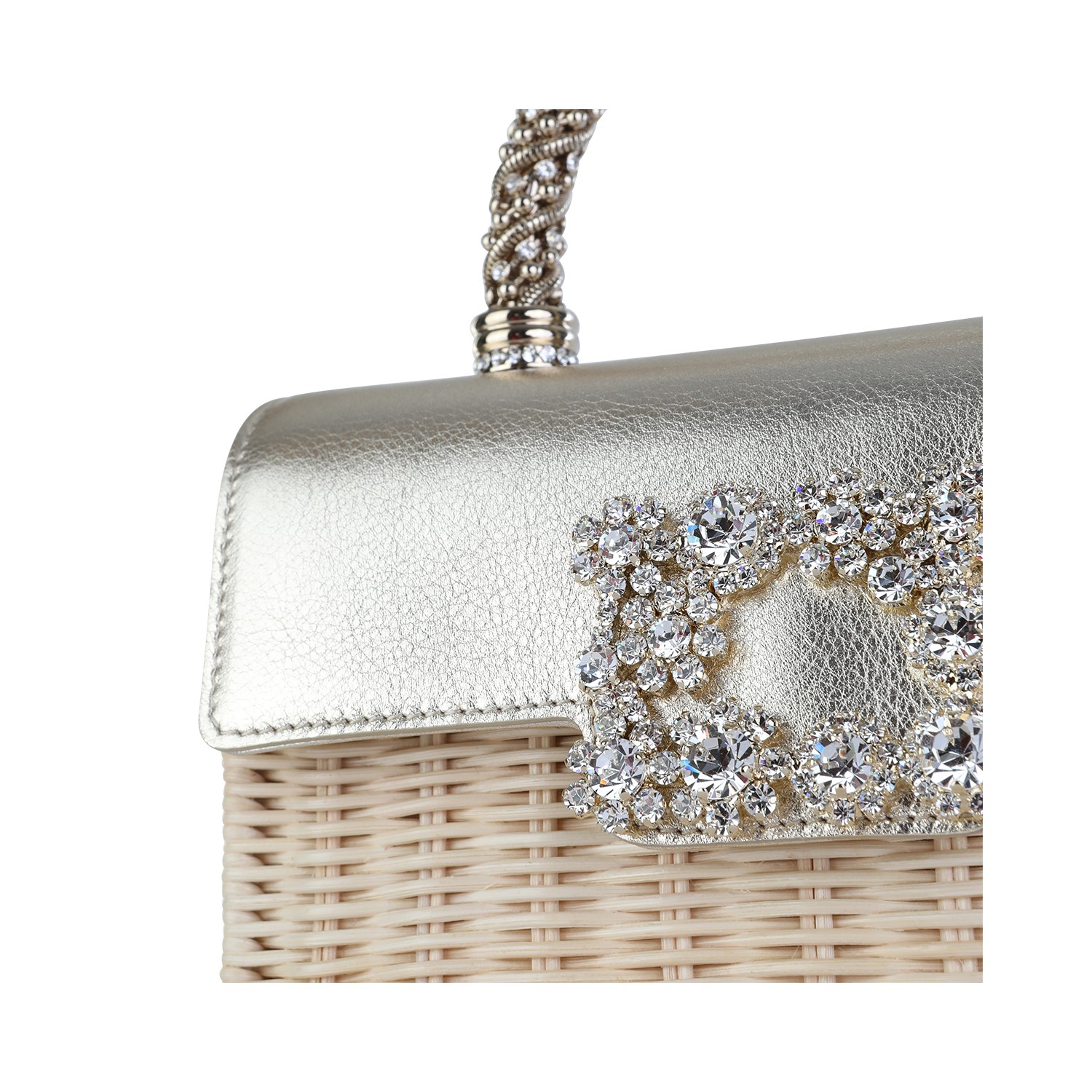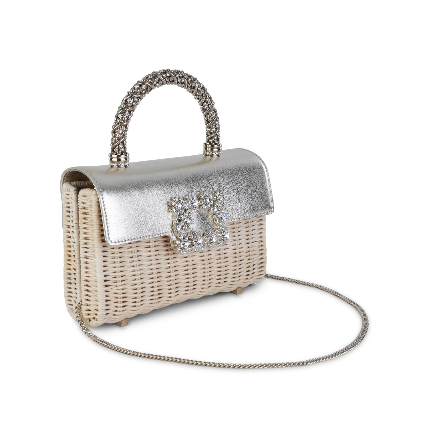 Light gold leather top handle bag from Roger Vivier featuring rigid top handle, rhinestones, crystal details, magnetic flap closure, chain shoulder strap and main compartment.