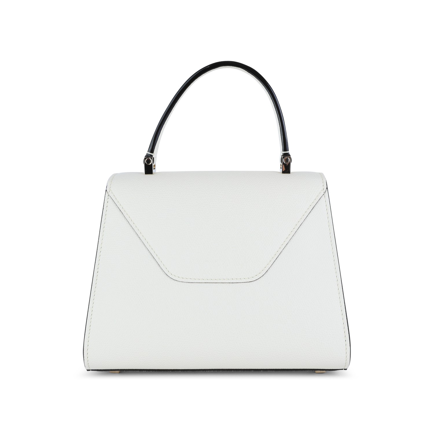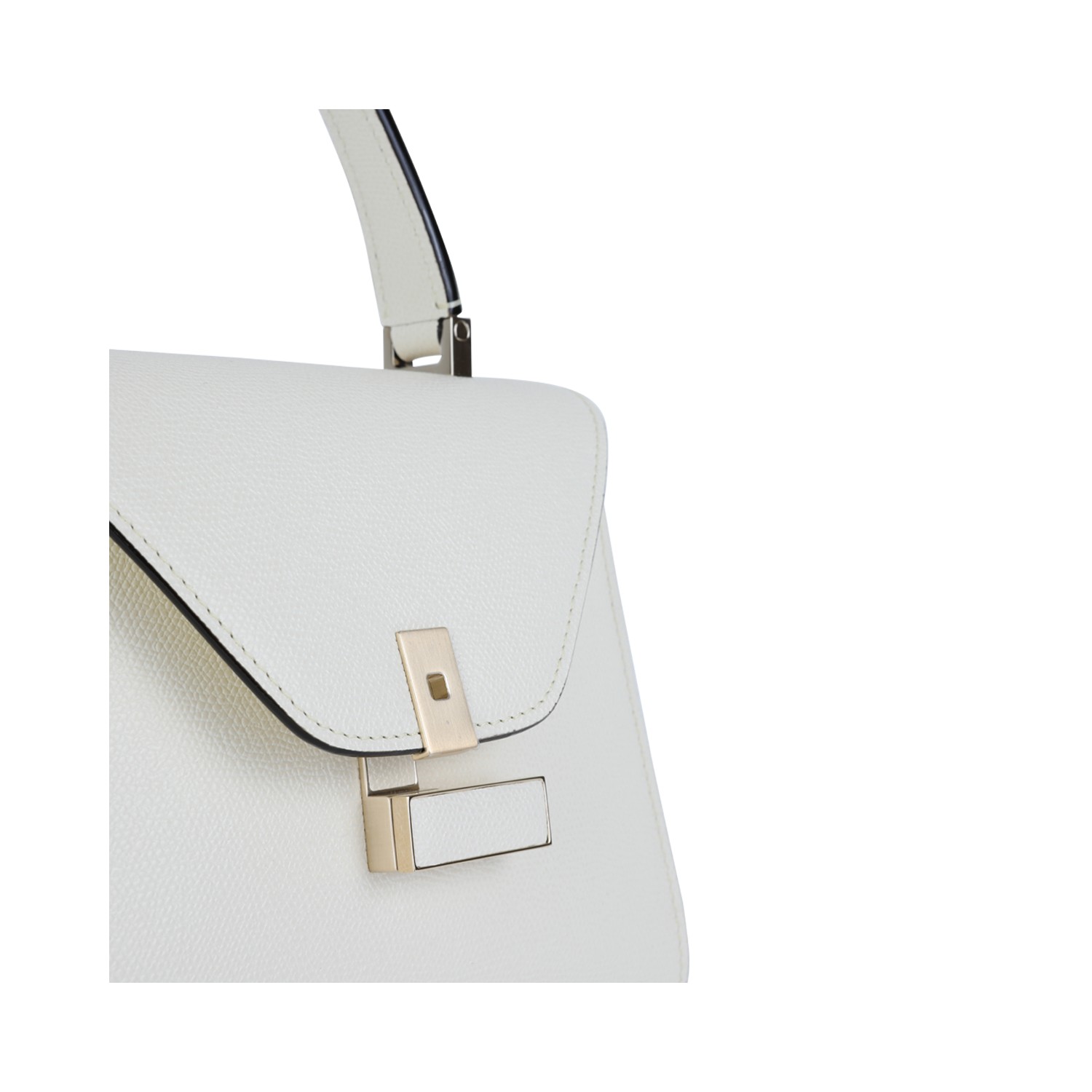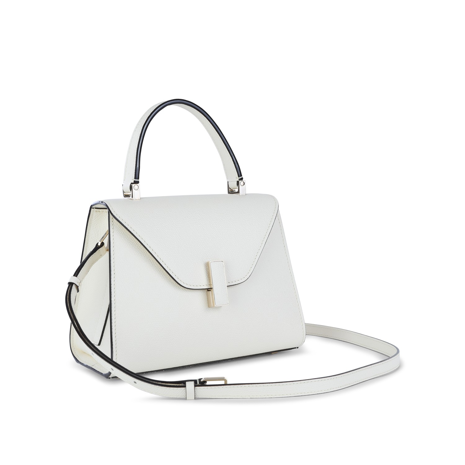 White leather Iside mini top handle bag from Valextra featuring frontal magnetic closure, top handle, removable shoulder strap, main compartment and internal pocket.