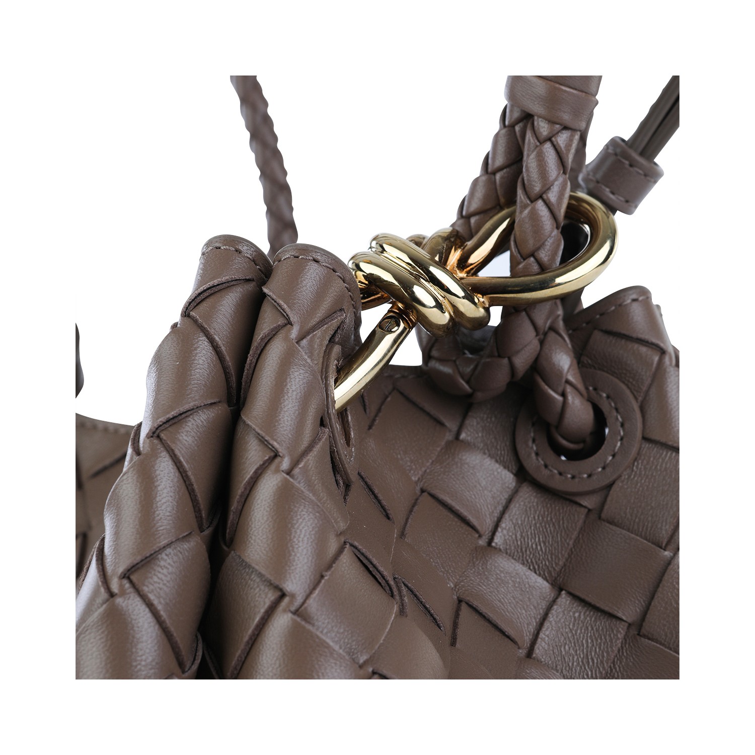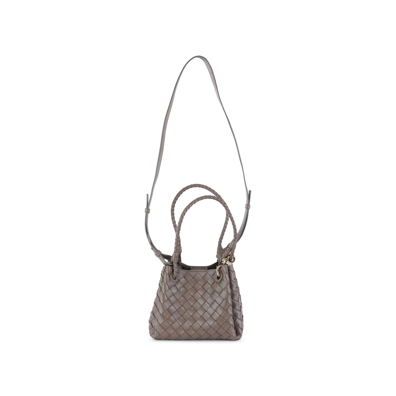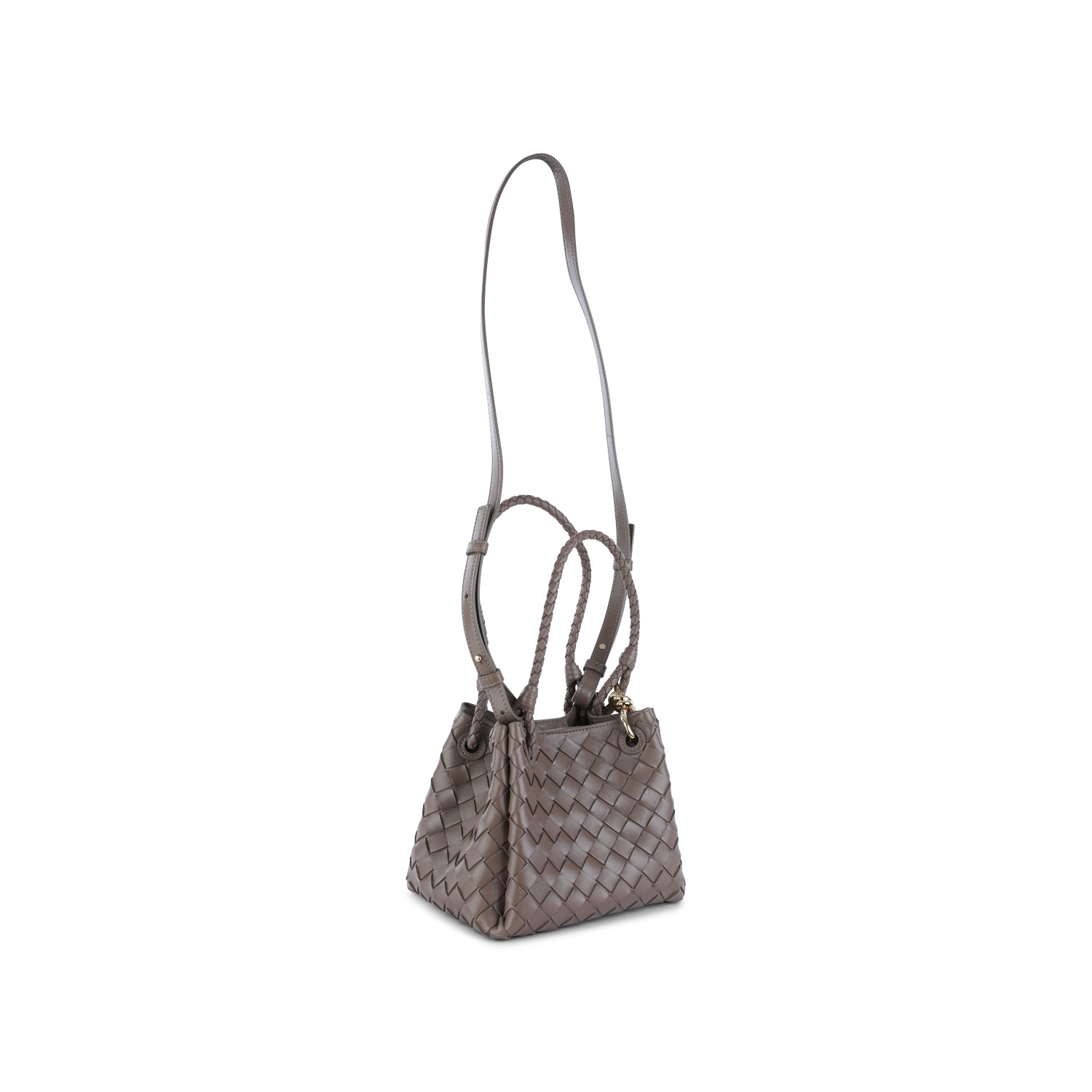 Grey leather Parachute small shoulder bag from Bottega Veneta featuring top handles, removable shoulder strap, Intreccio motif, knot detail, magnetic closure and main compartment.