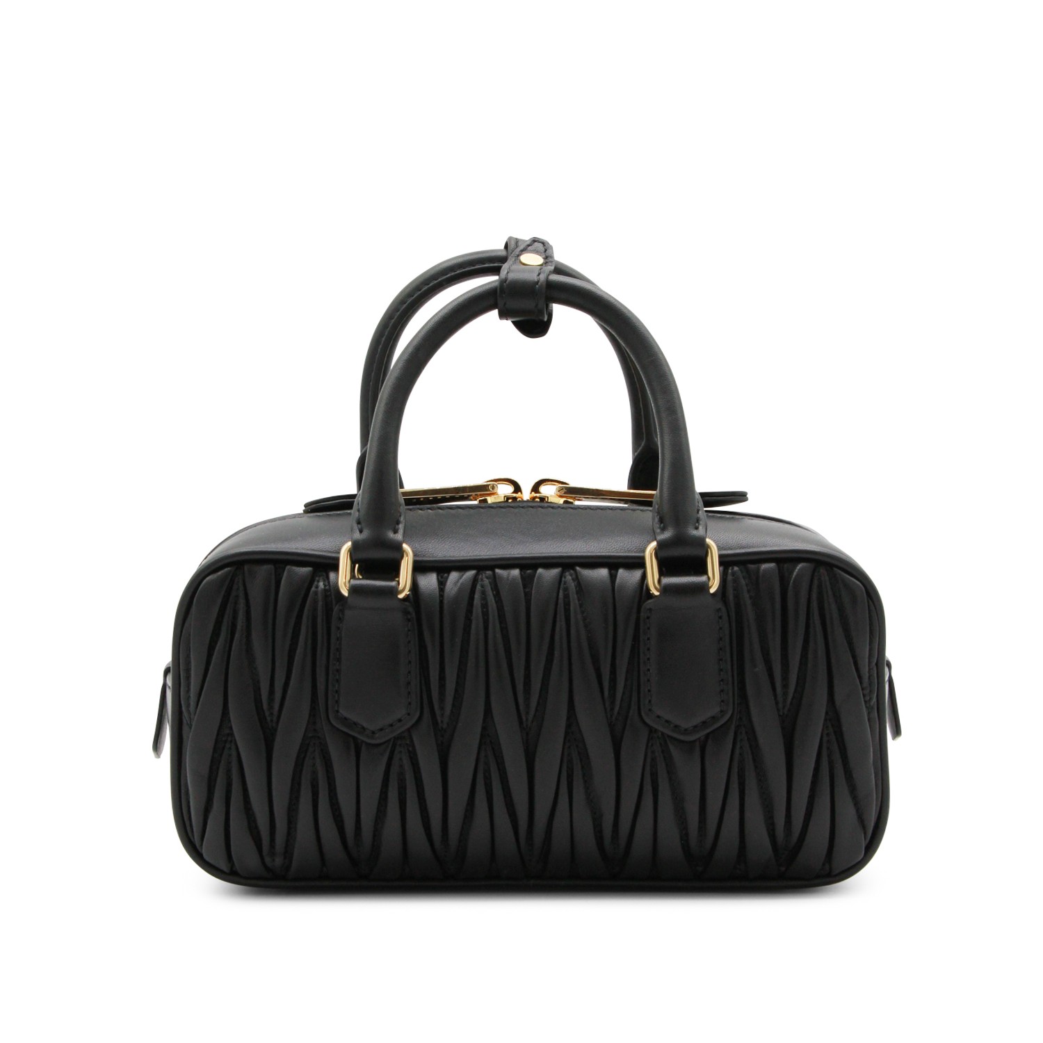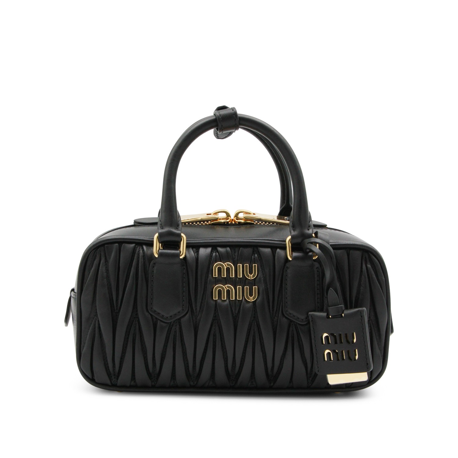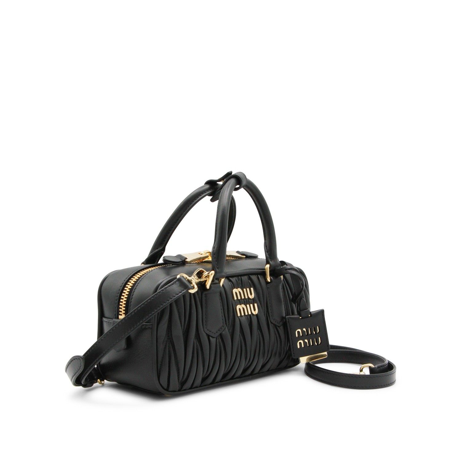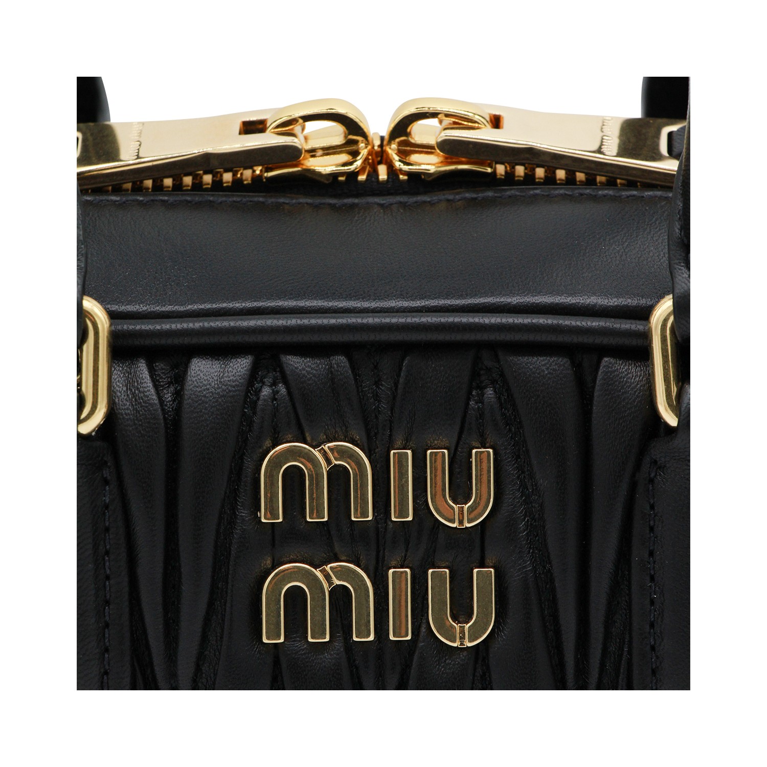 Black leather top handle bag from Miu Miu featuring top handles, removable strap, zip fastening, frontal logo and gold tone hardware.