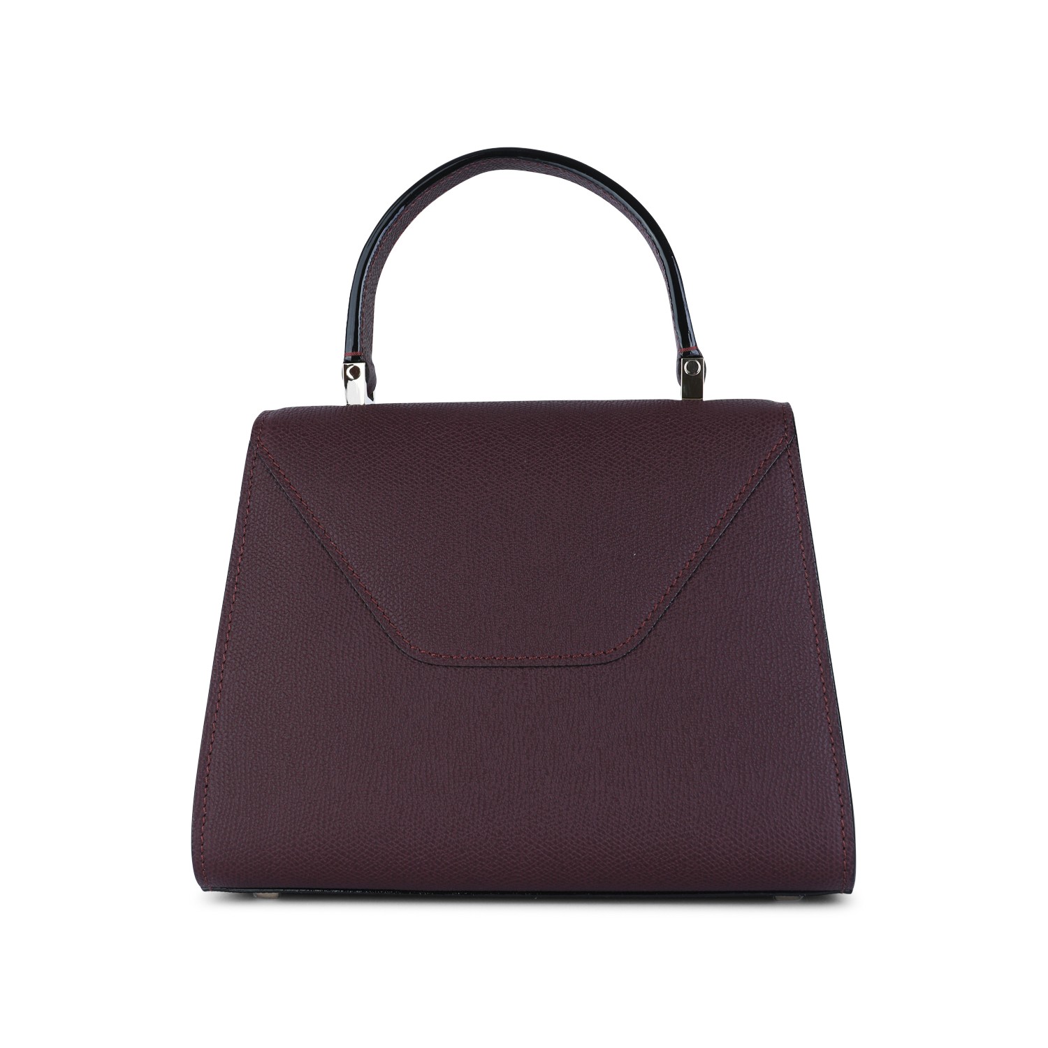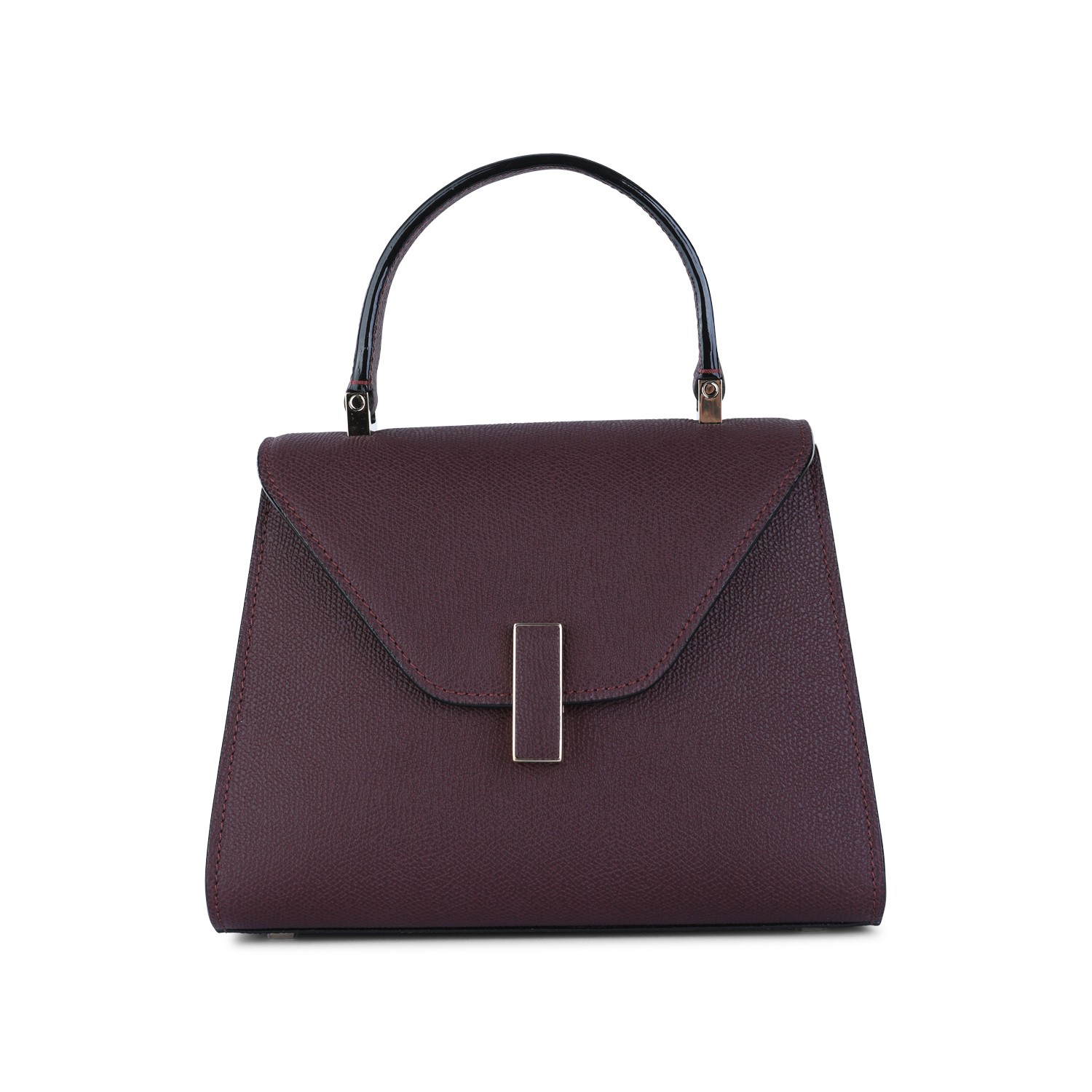 Dark purple leather Iside Mini top handle bag from Valextra featuring top handle, foldovertop with twist-lock closure, adjustable and removable shoulder strap and main comparment.