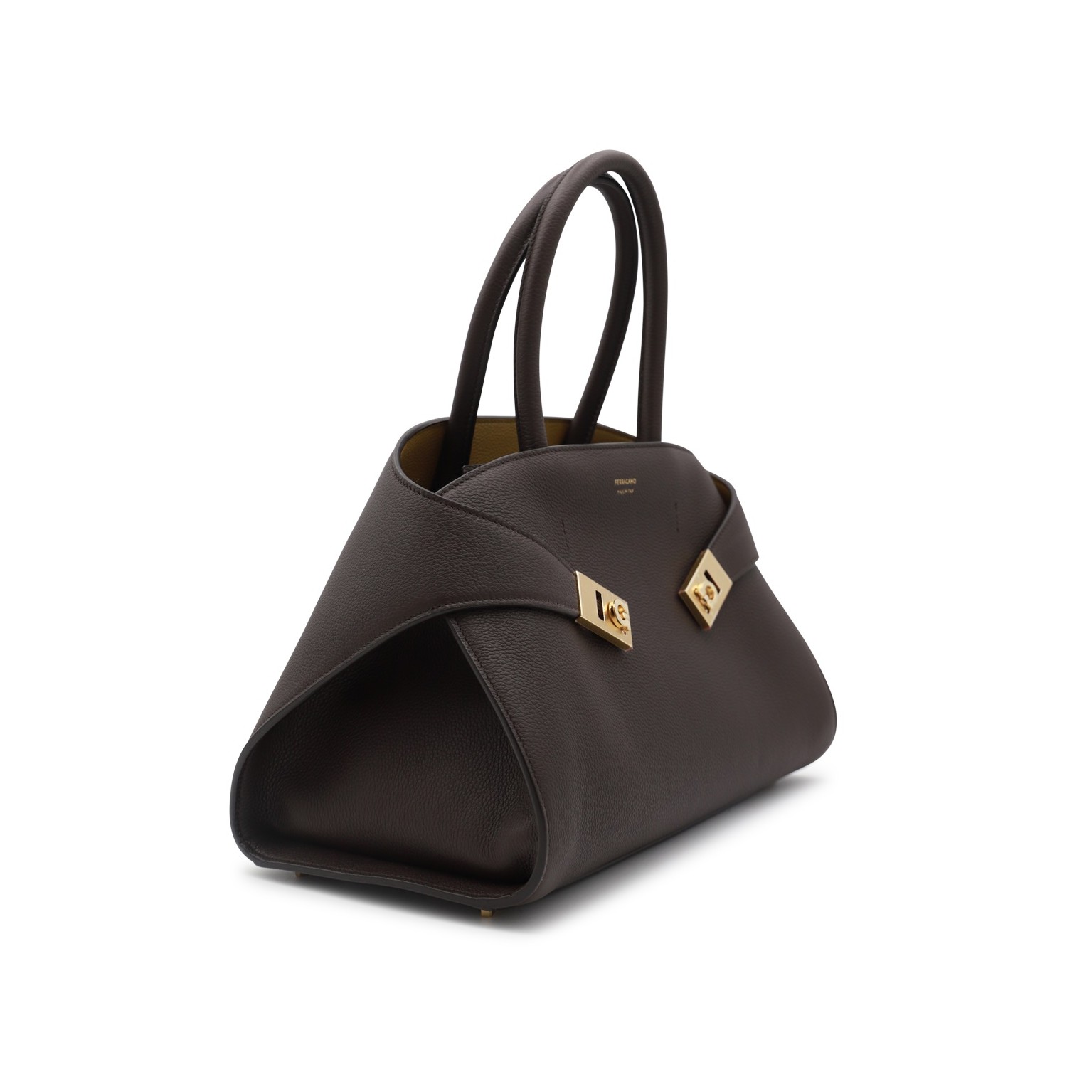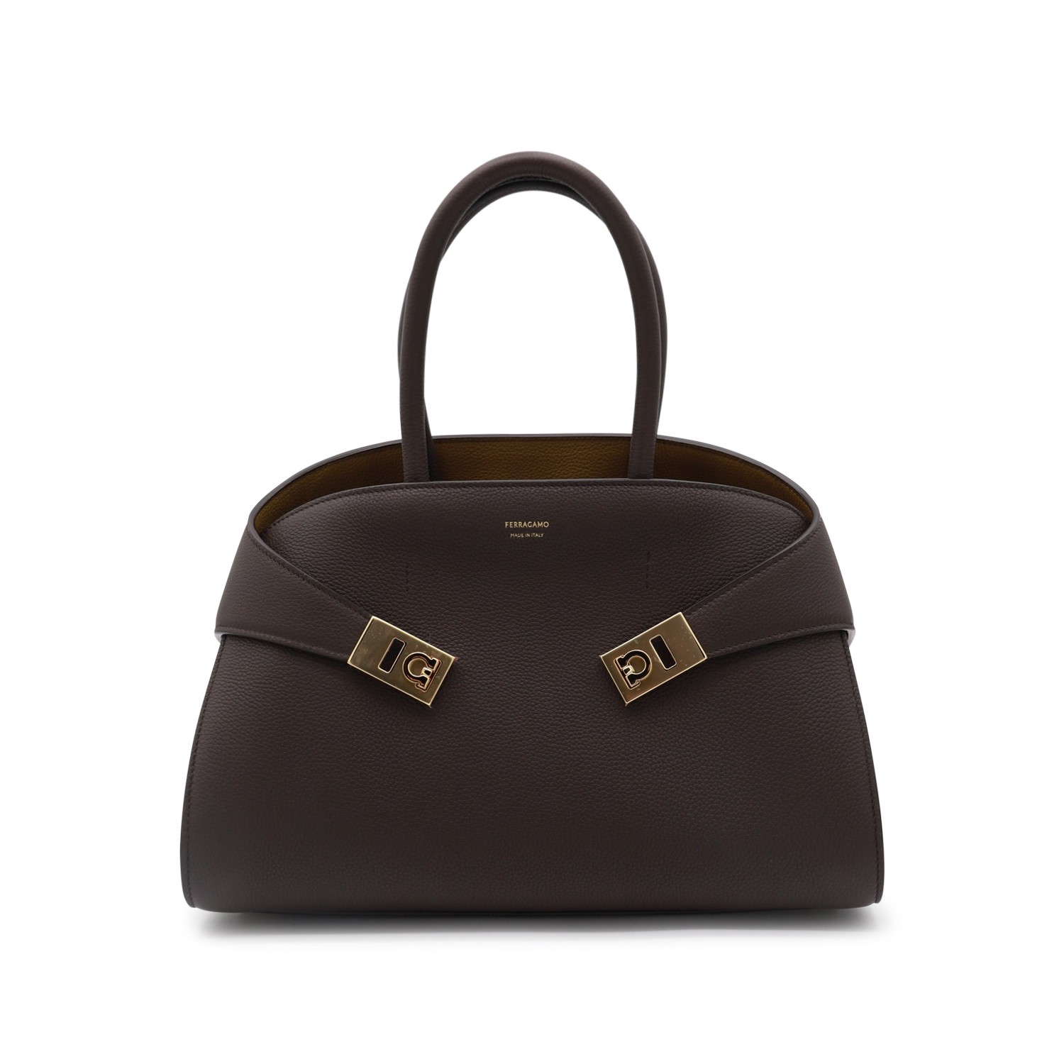Dark brown leather Hug S top handle bag from Ferragamo featuring handles, frontal logo print, buckle details, main compartment and inside pockets.