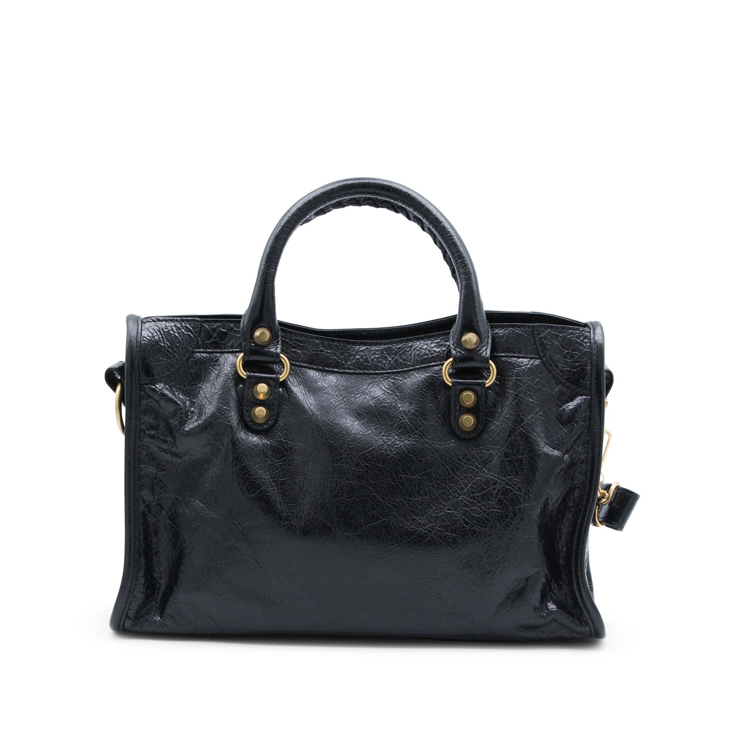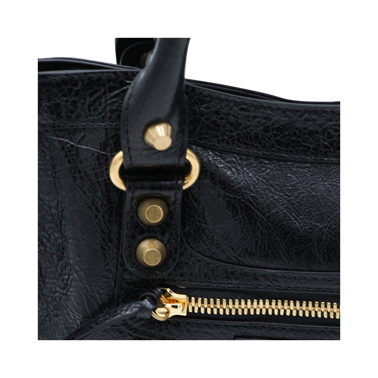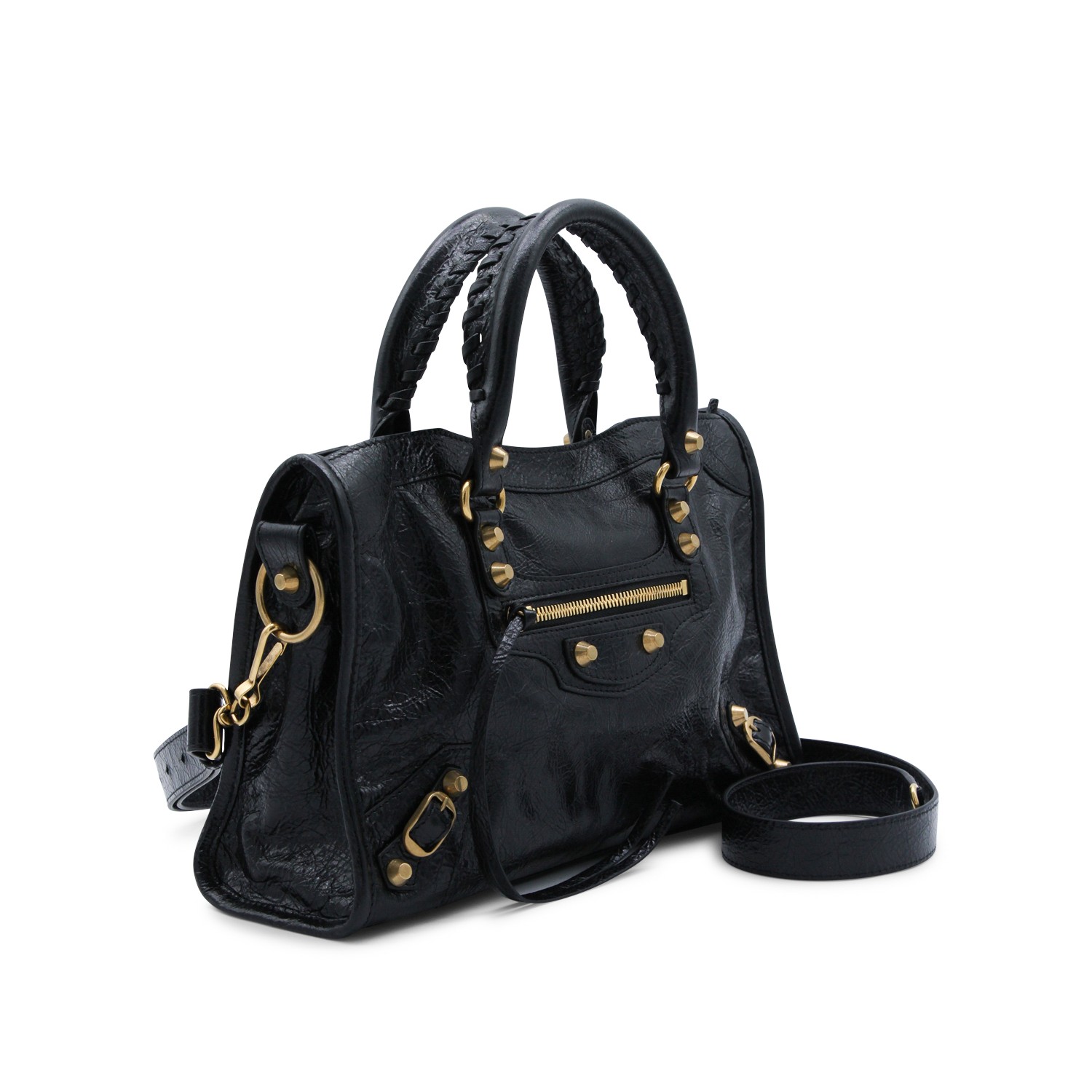 Black leather City S top handle bag from Balenciaga featuring top handles, zip fastening, gold tone hardware, buckle details, adjustable and removable shoulder strap, main compartment and pockets.