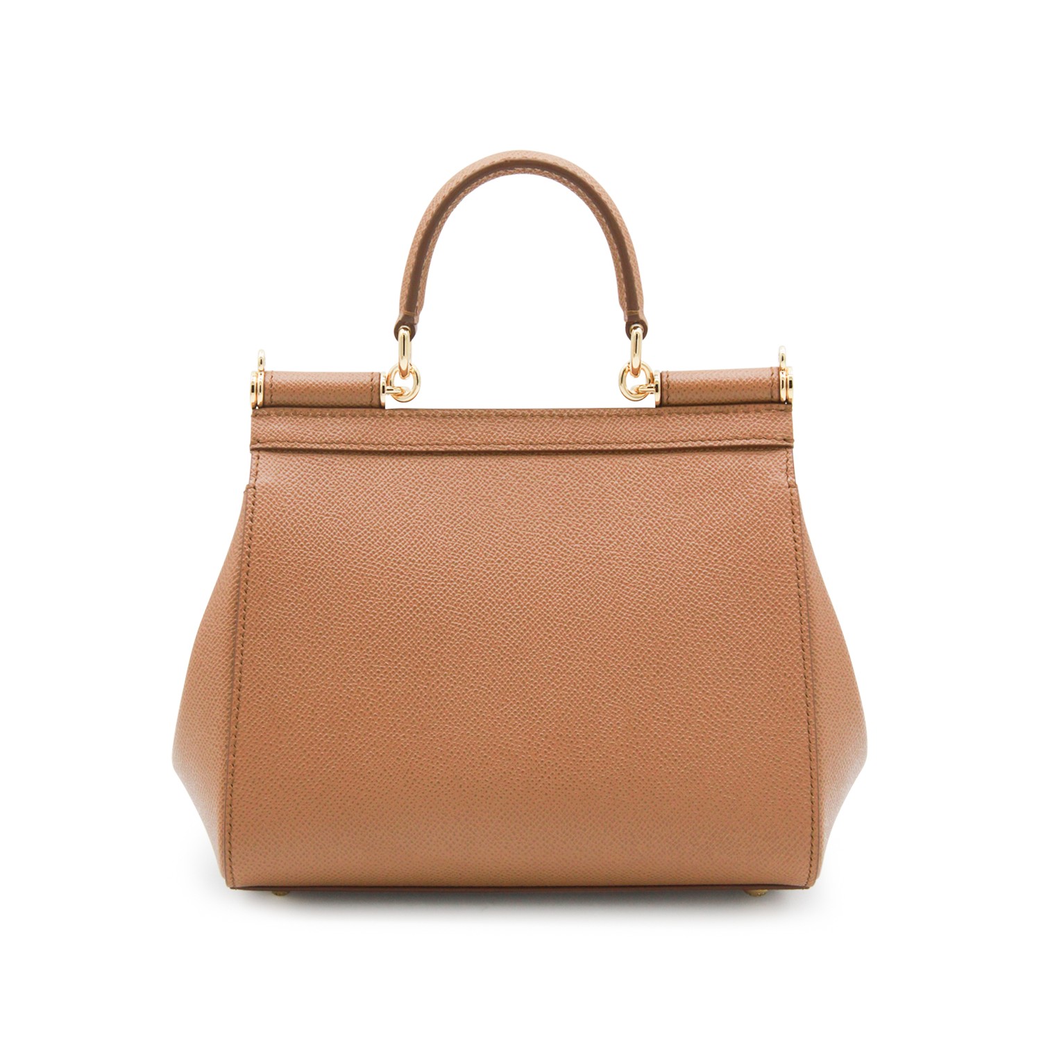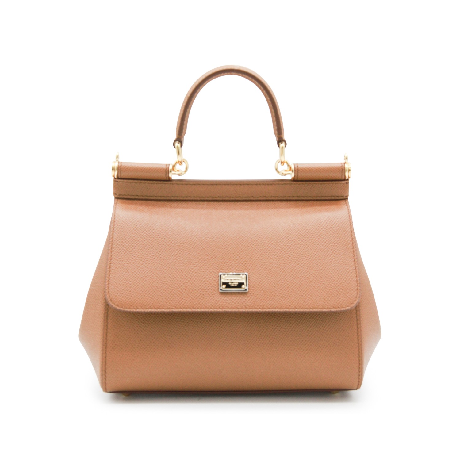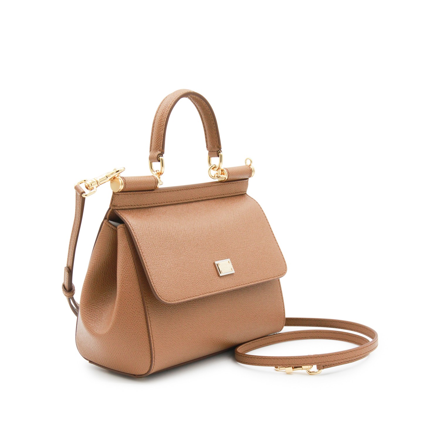 Brown leather Sicily top handle bag from Dolce & Gabbana featuring gold-tone hardware, top round handle, foldover top with magnetic closure, logo plaque, adjustable removable shoulder strap and main compartment.