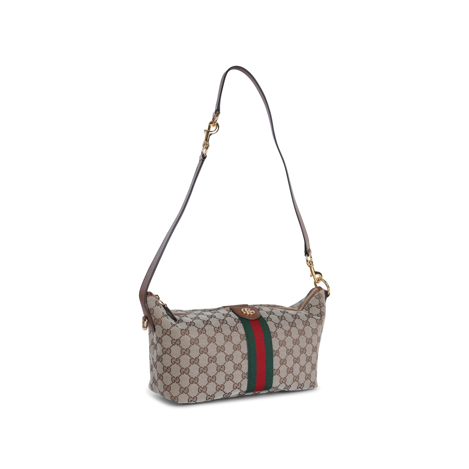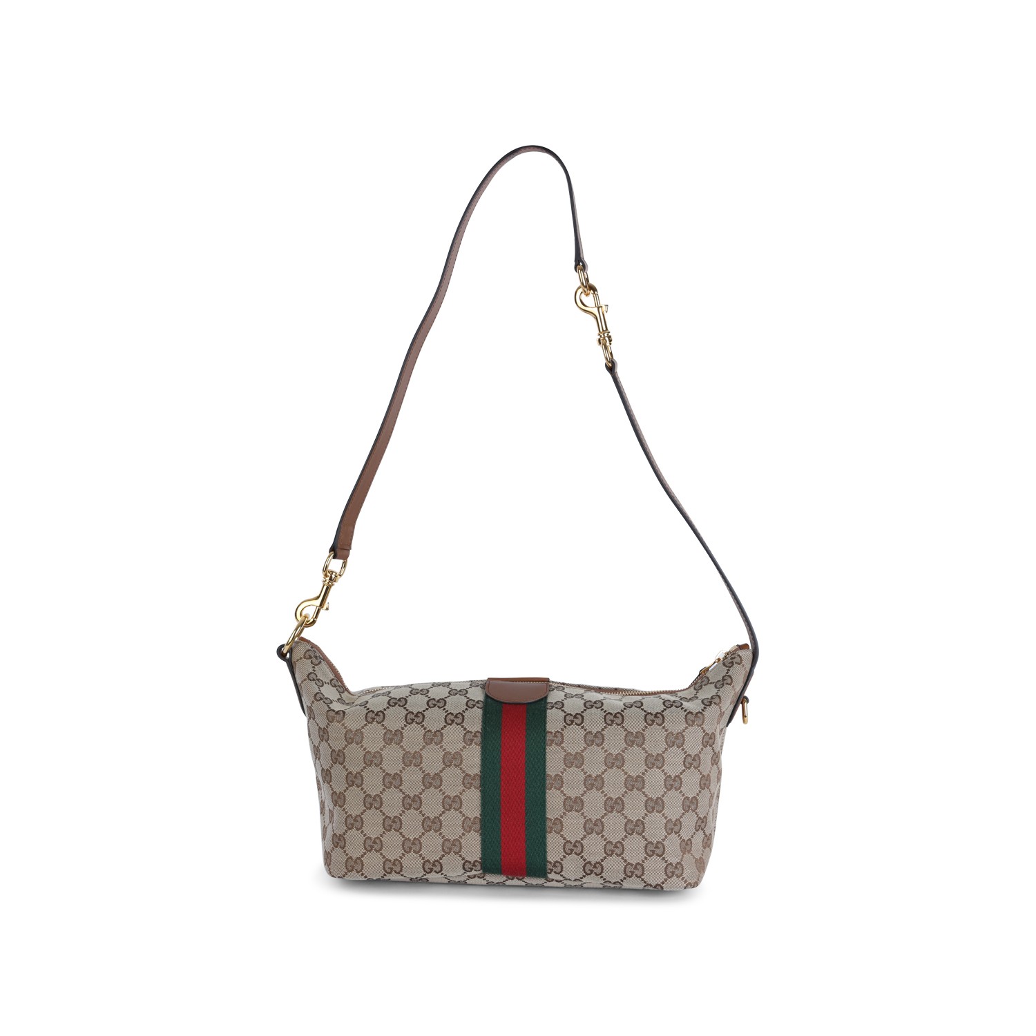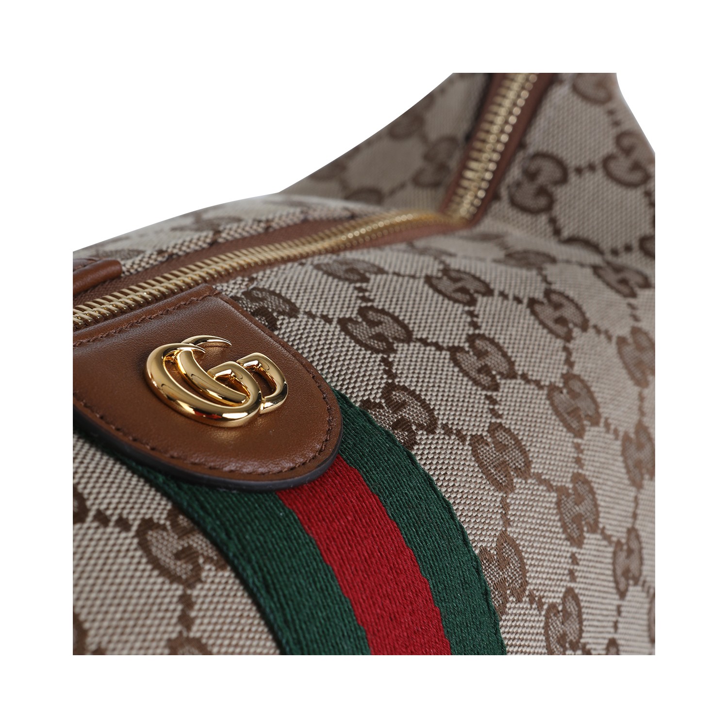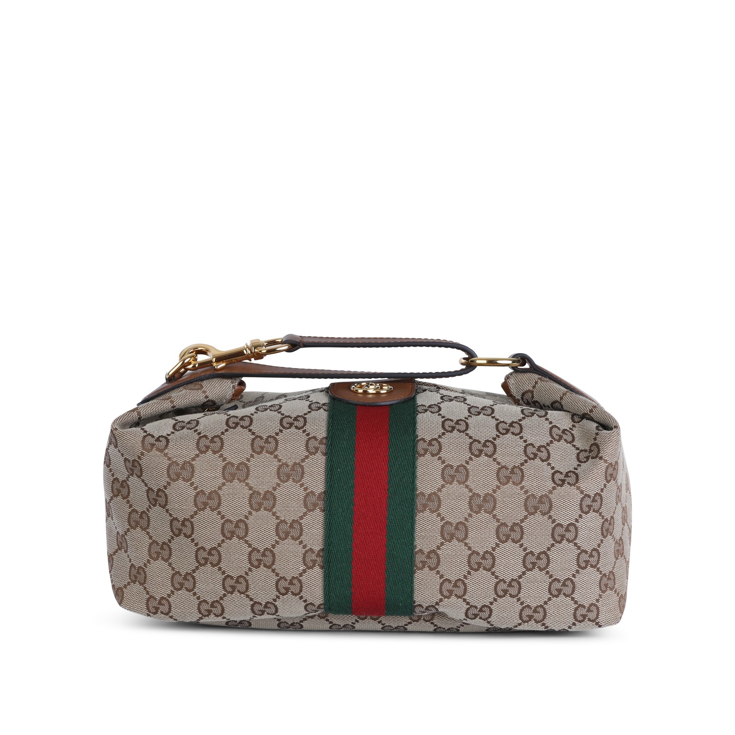 Beige Vanity top handle bag from Gucci featuring gold tone hardware, GG gold logo, zip fastening, adjustable and removable shoulder strap, top handle and all over iconic stamp.