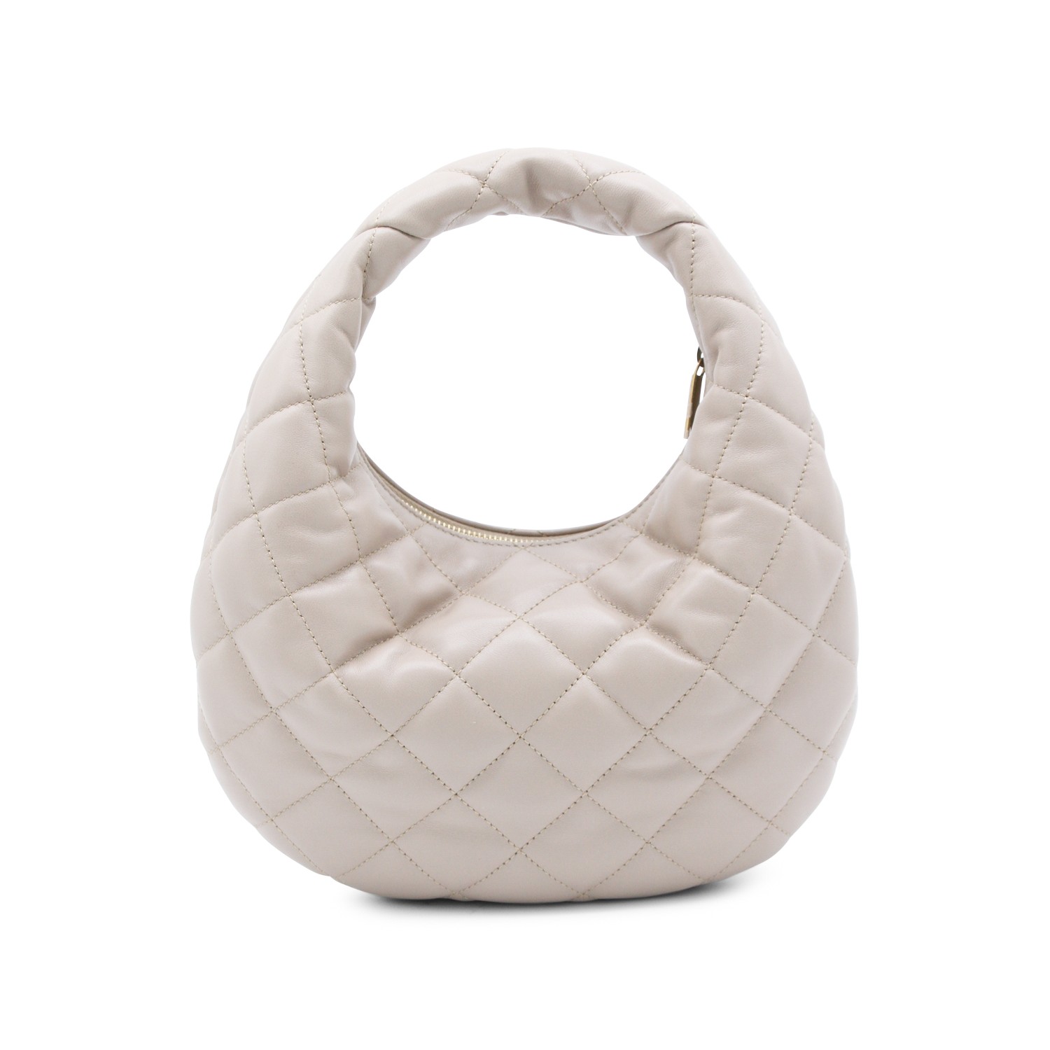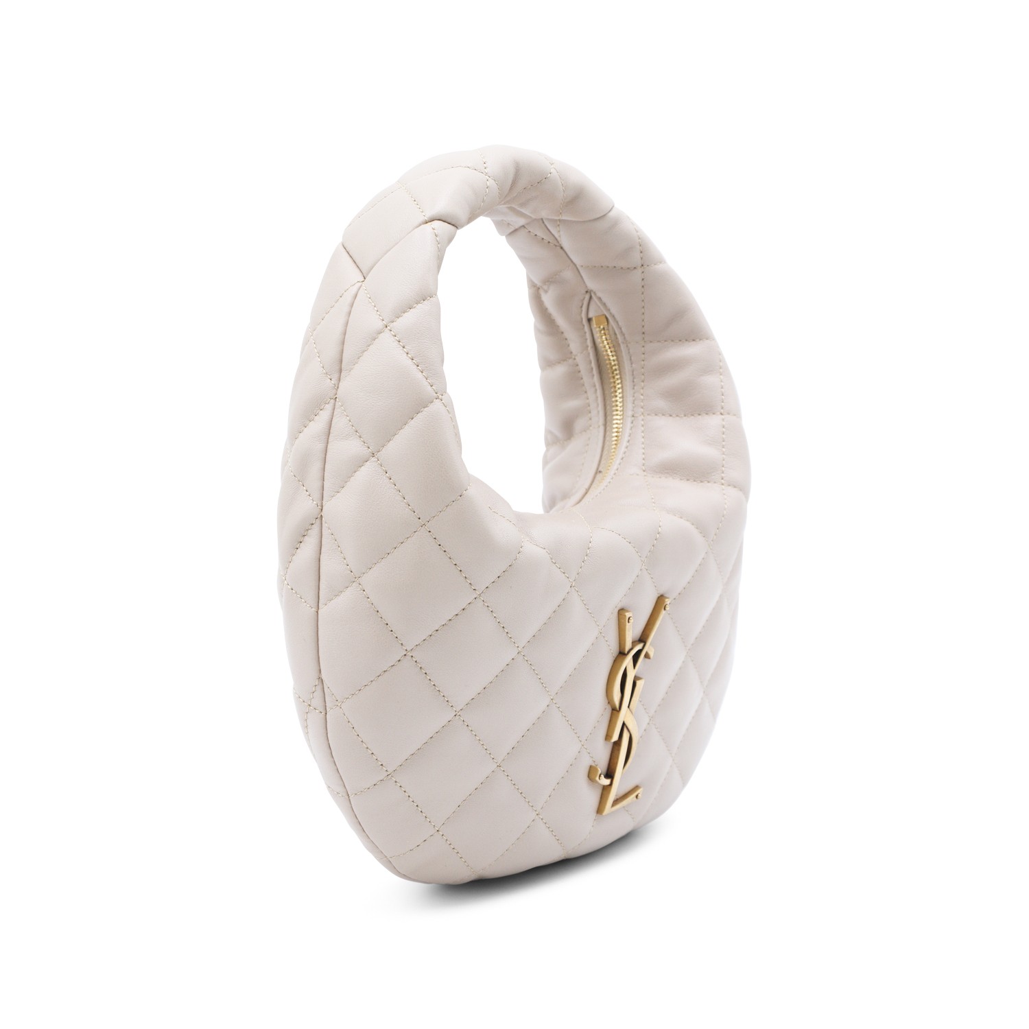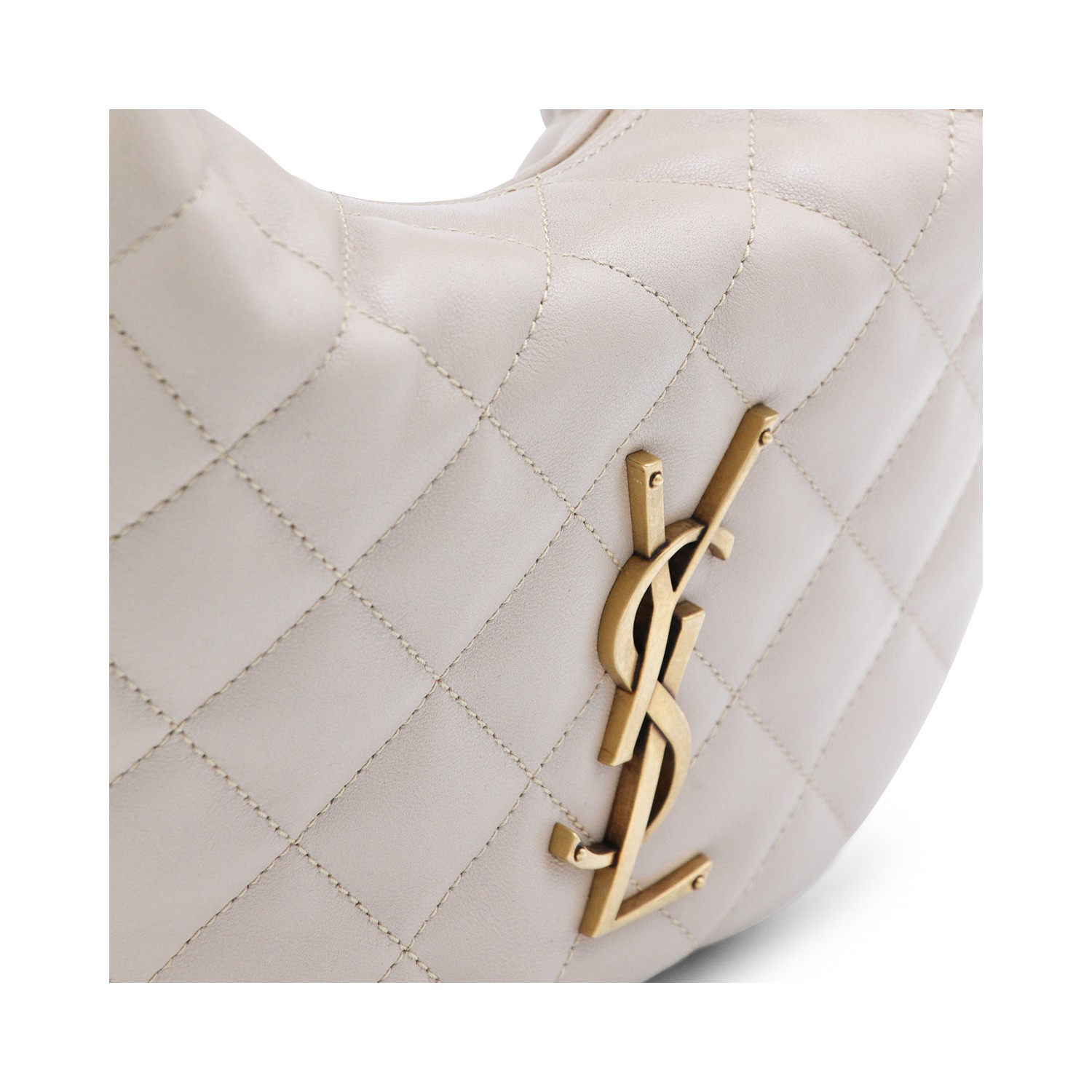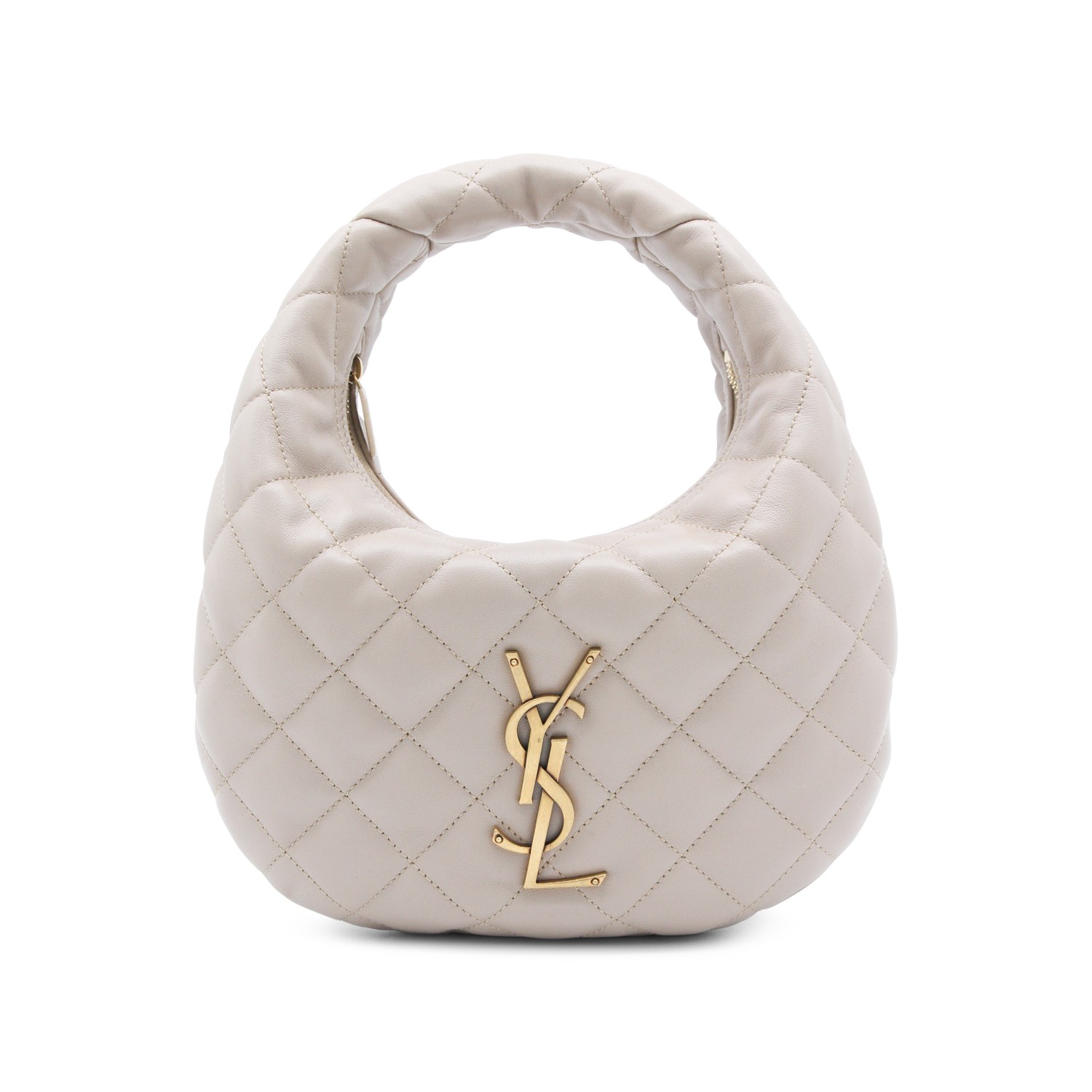Dark beige leather Icarino top handle bag from Saint Laurent featuring quilted pattern, gold tone hardware, zip closure, metal logo and main compartment.