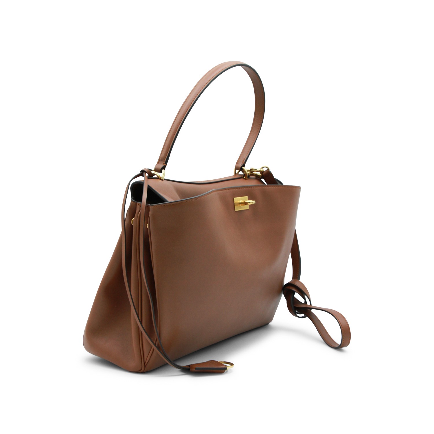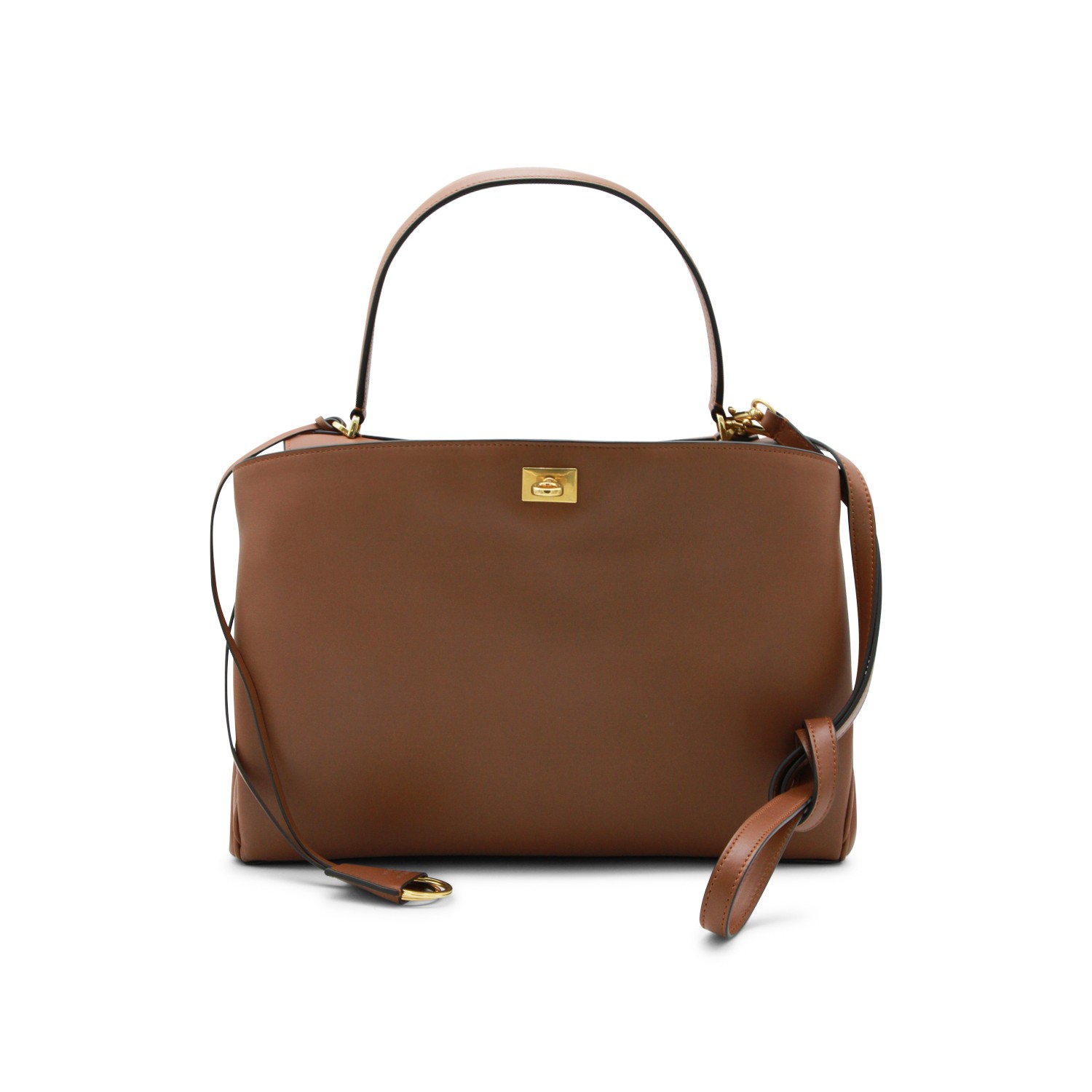 Brown Rodeo M leather top handle bag from Balenciaga featuring top handle, upper fastening with zip, gold tone hardware, inside pocket and strap.