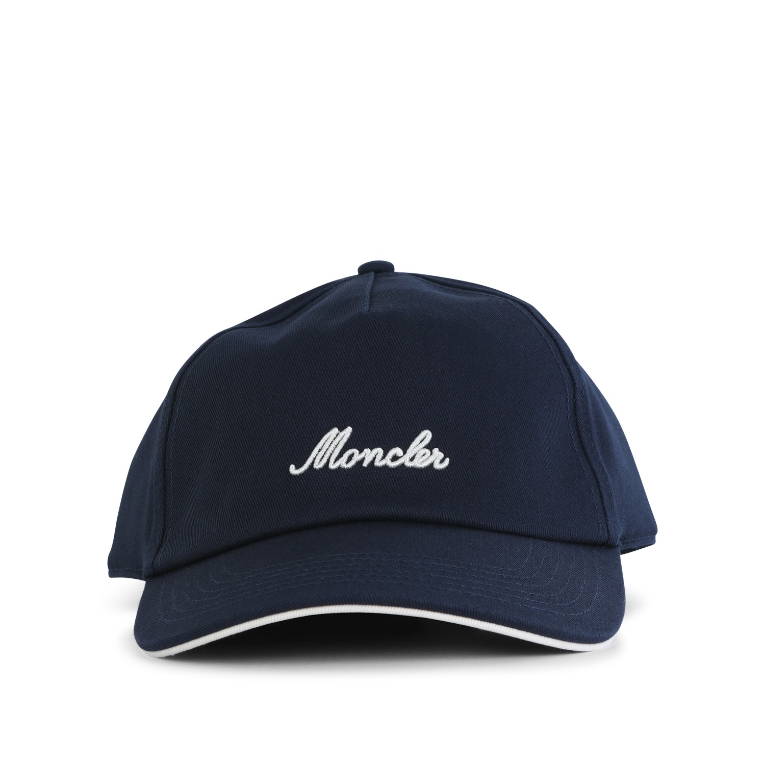 Navy cotton baseball cap from Moncler featuring curved peak, frontal embroidered logo and adjustable size.