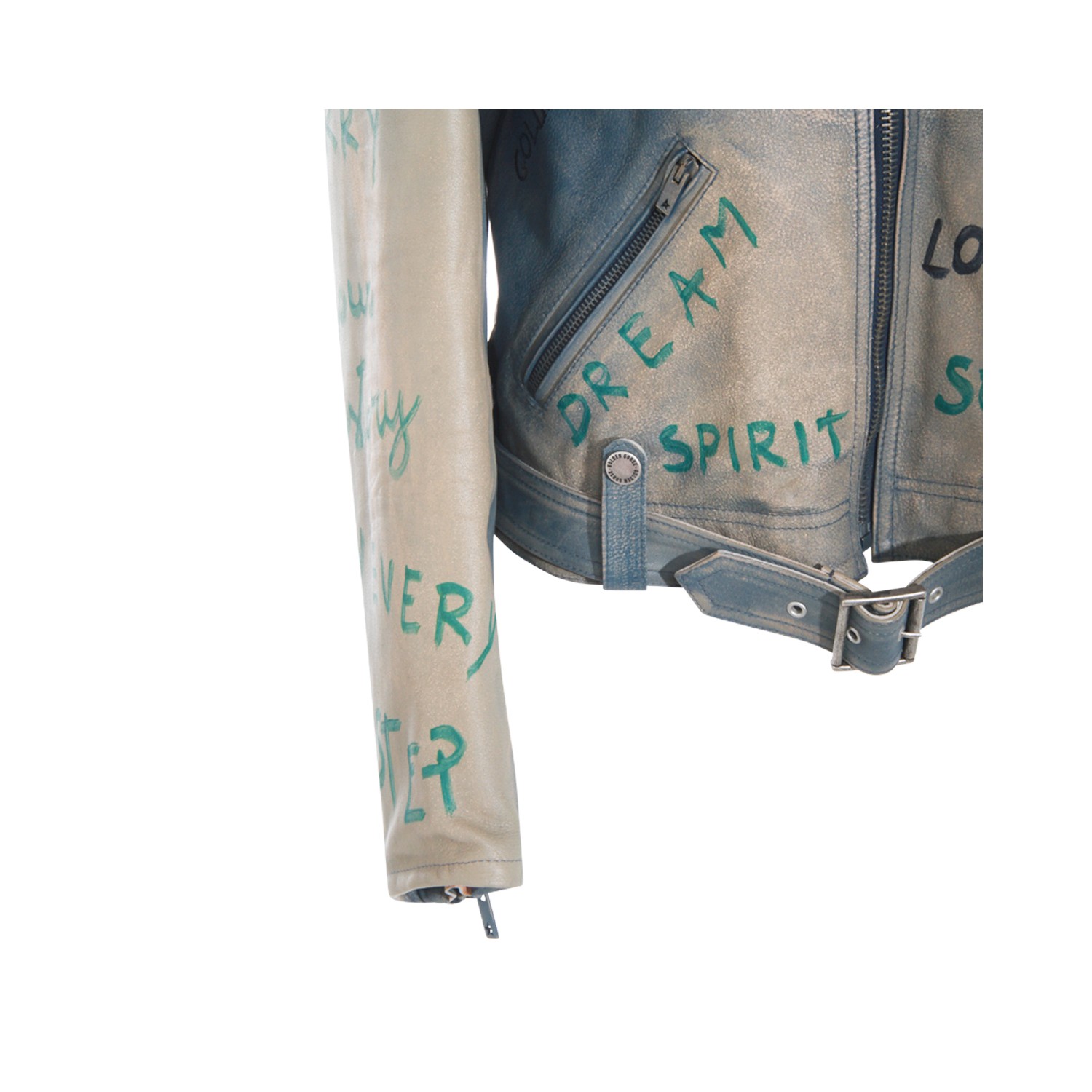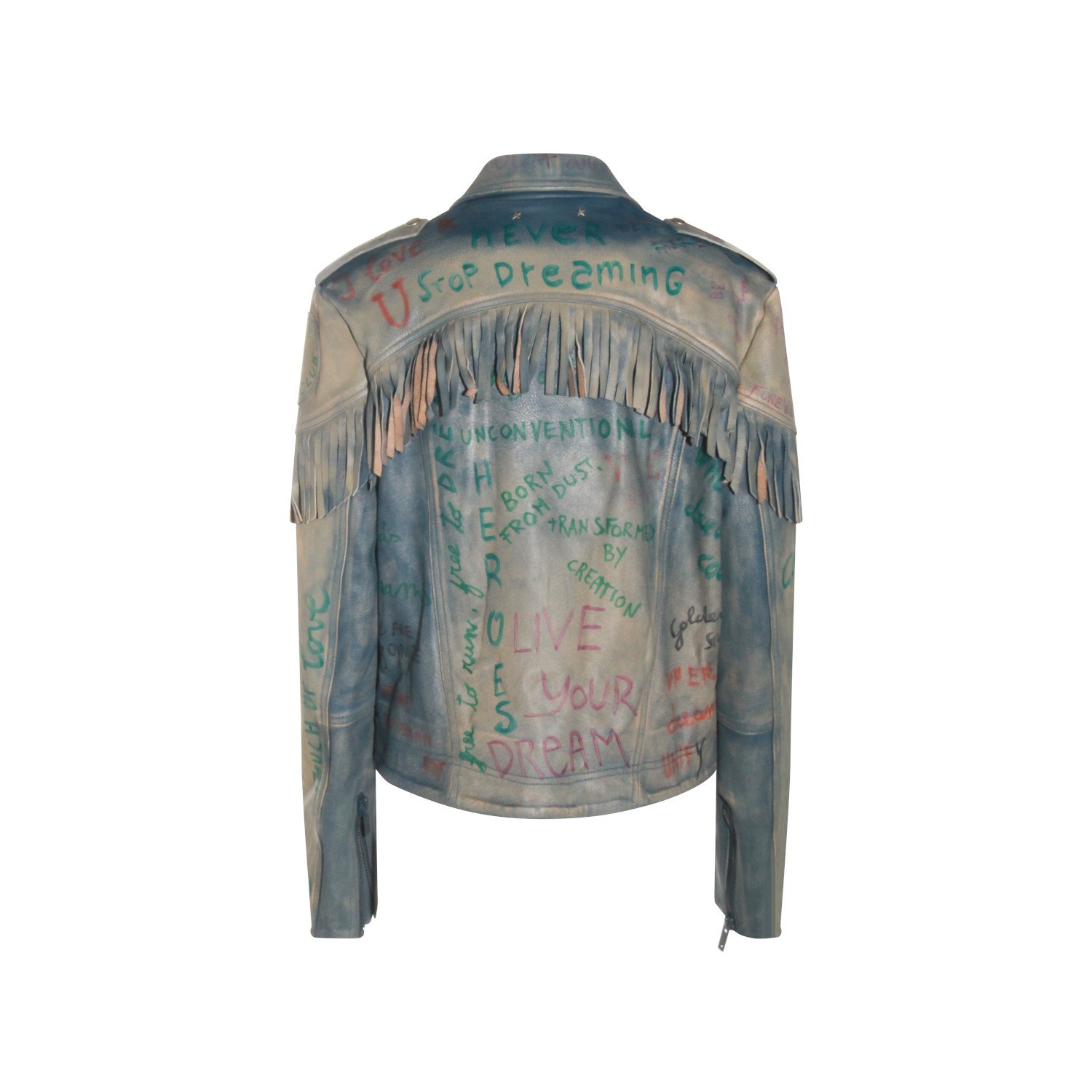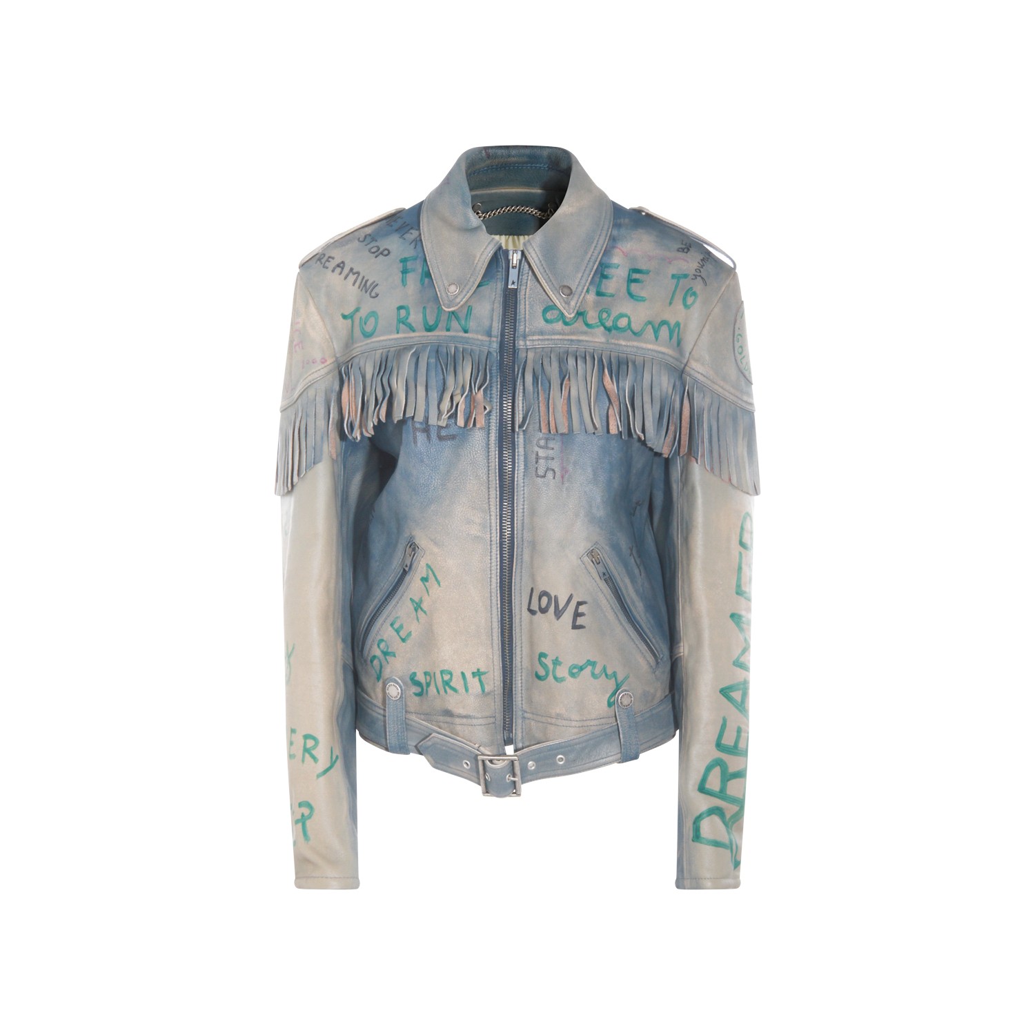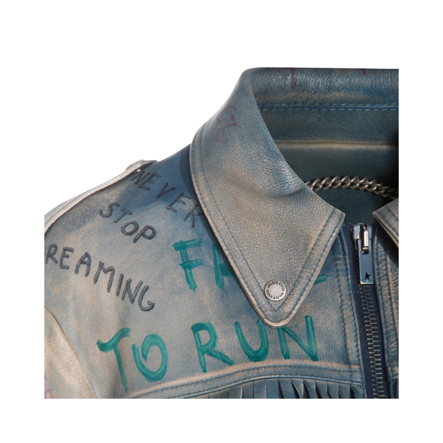 Light blue leather jacket from Golden Goose featuring classic collar, long sleeves, fringes, zip fastening, pockets and regular vestibility.