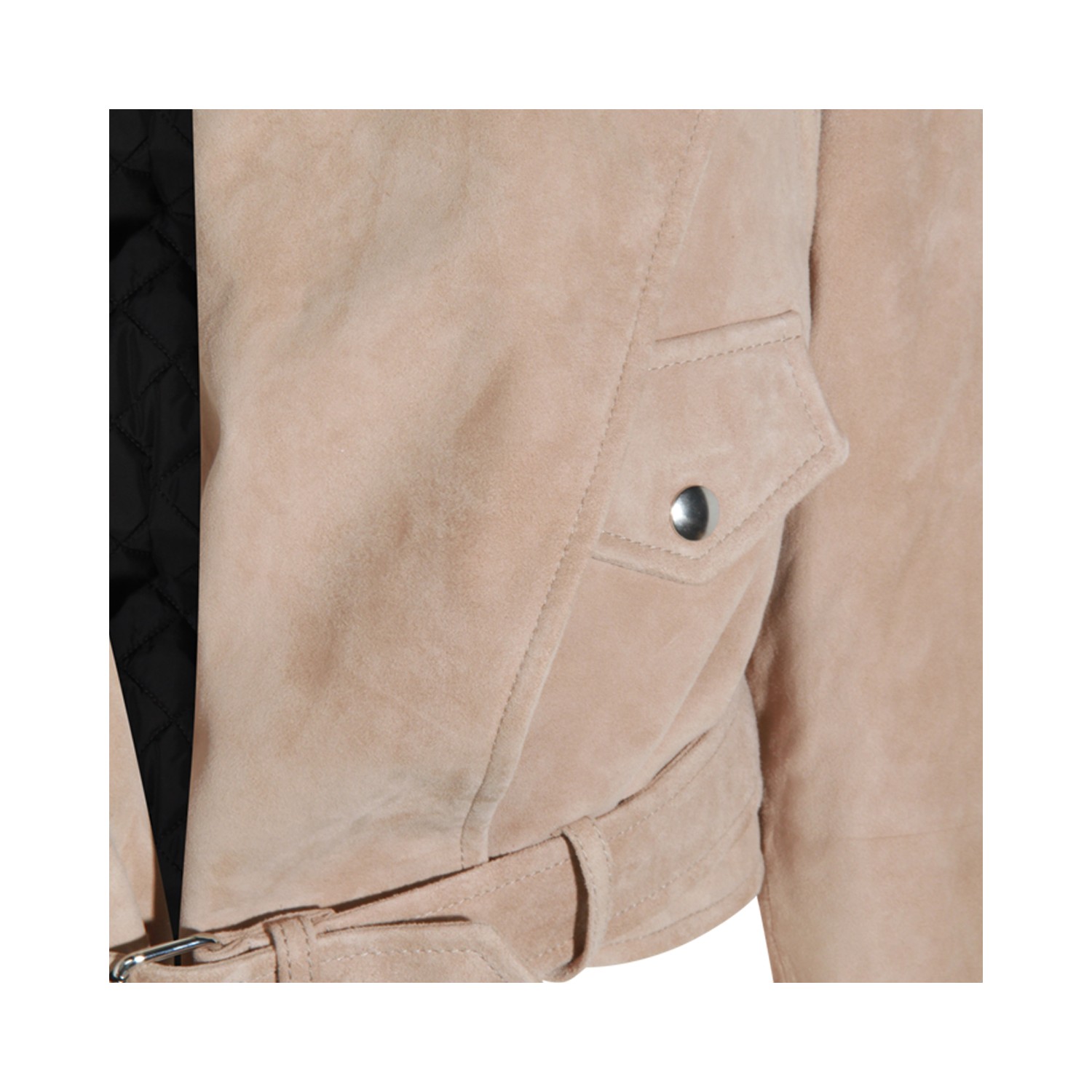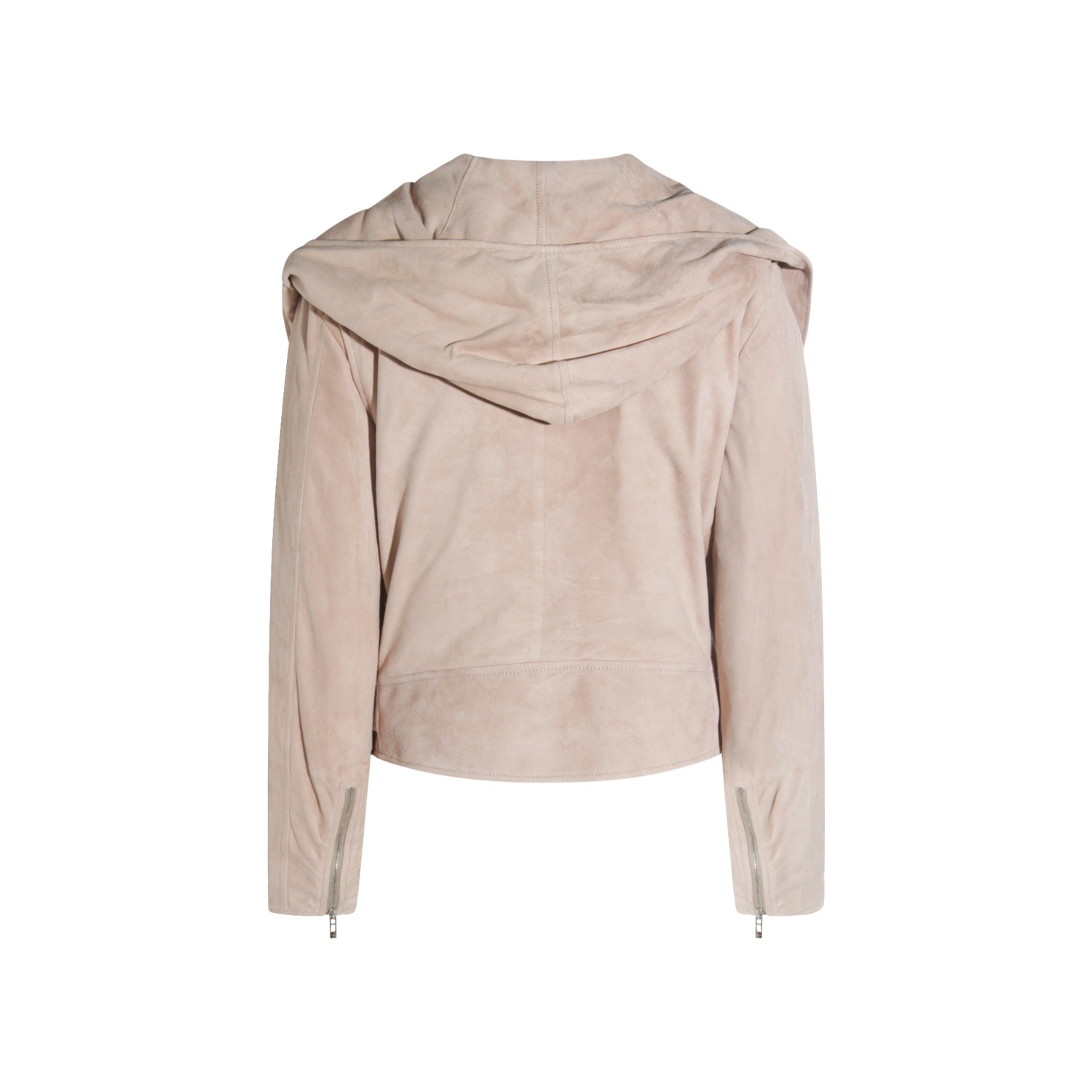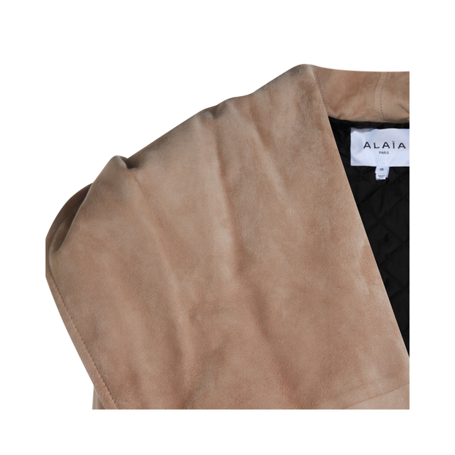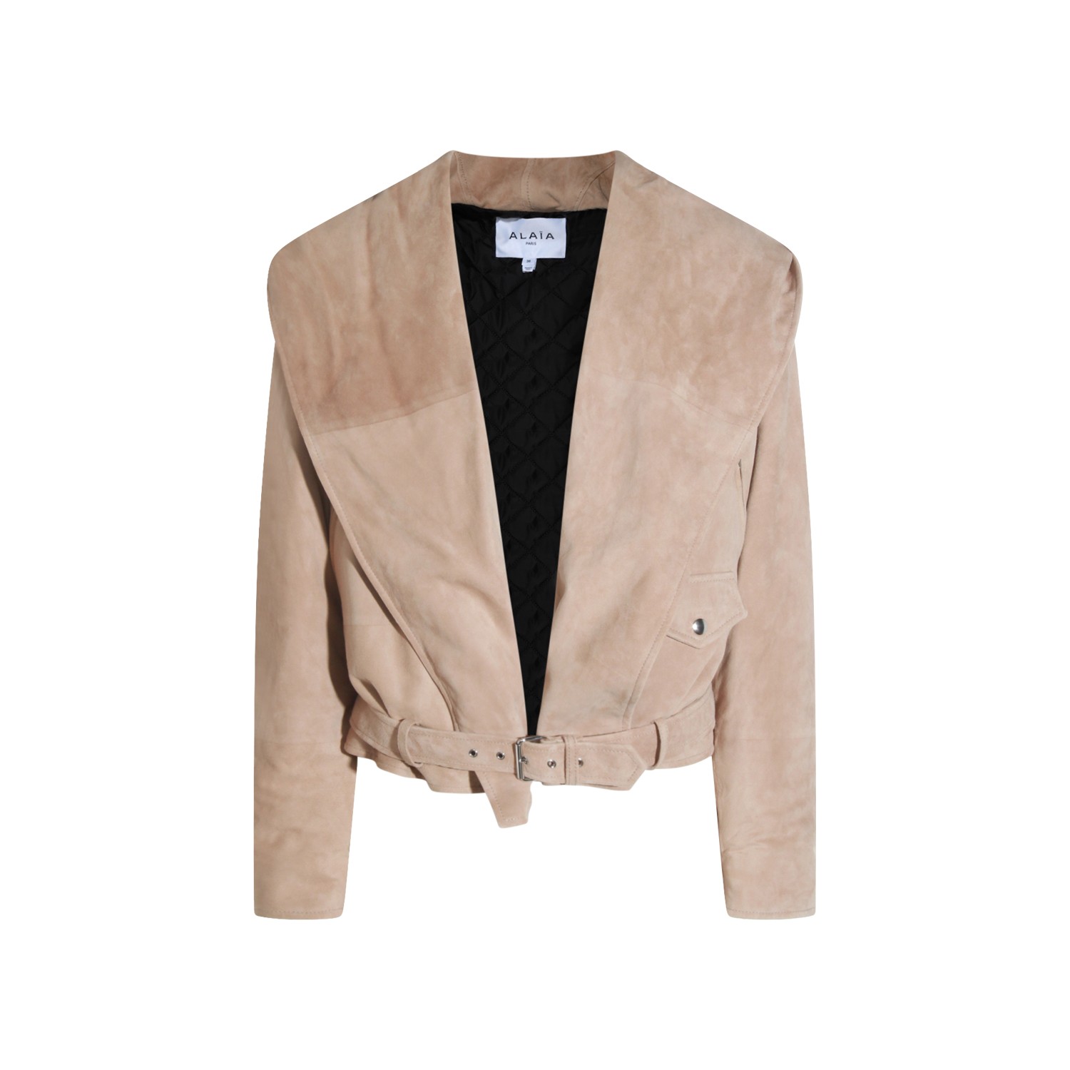 Beige leather jacket from Alaia featuring hood, long sleeves, suede, matchy belt and pockets.