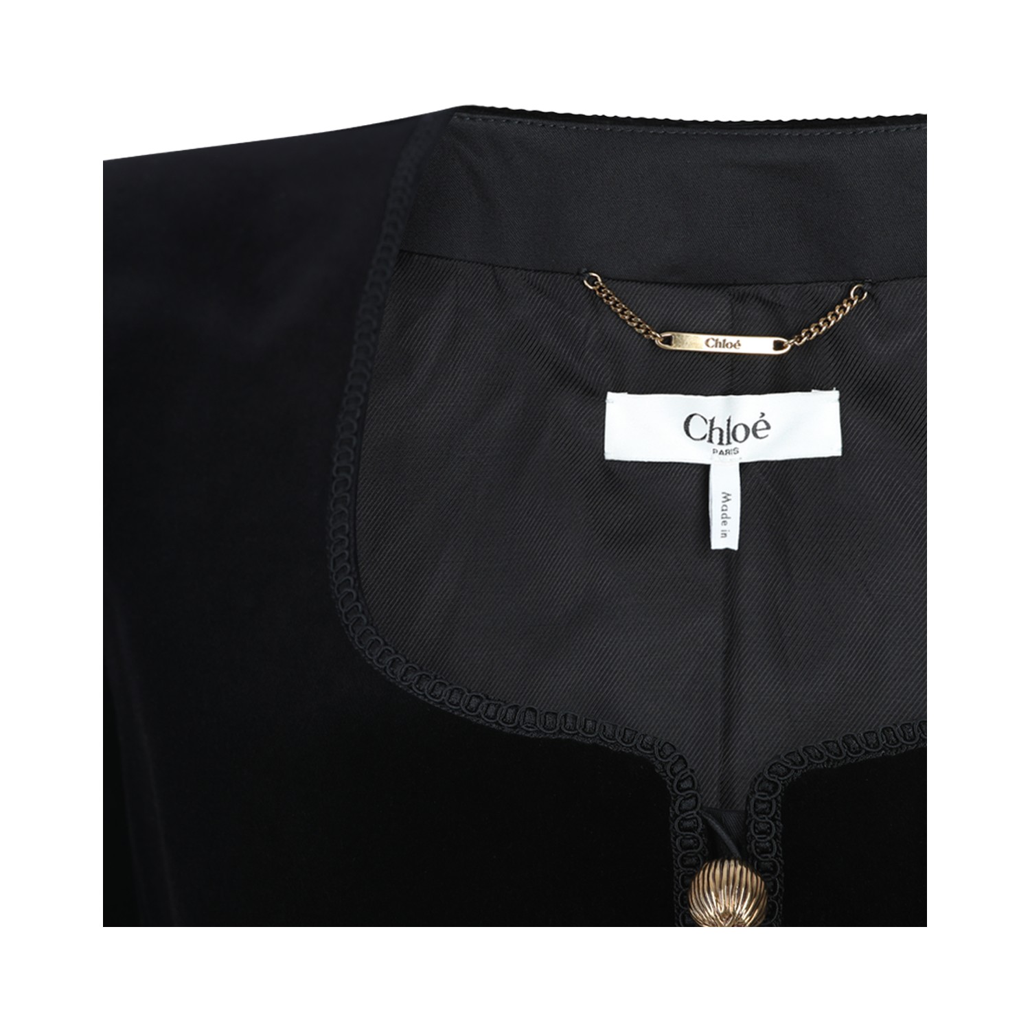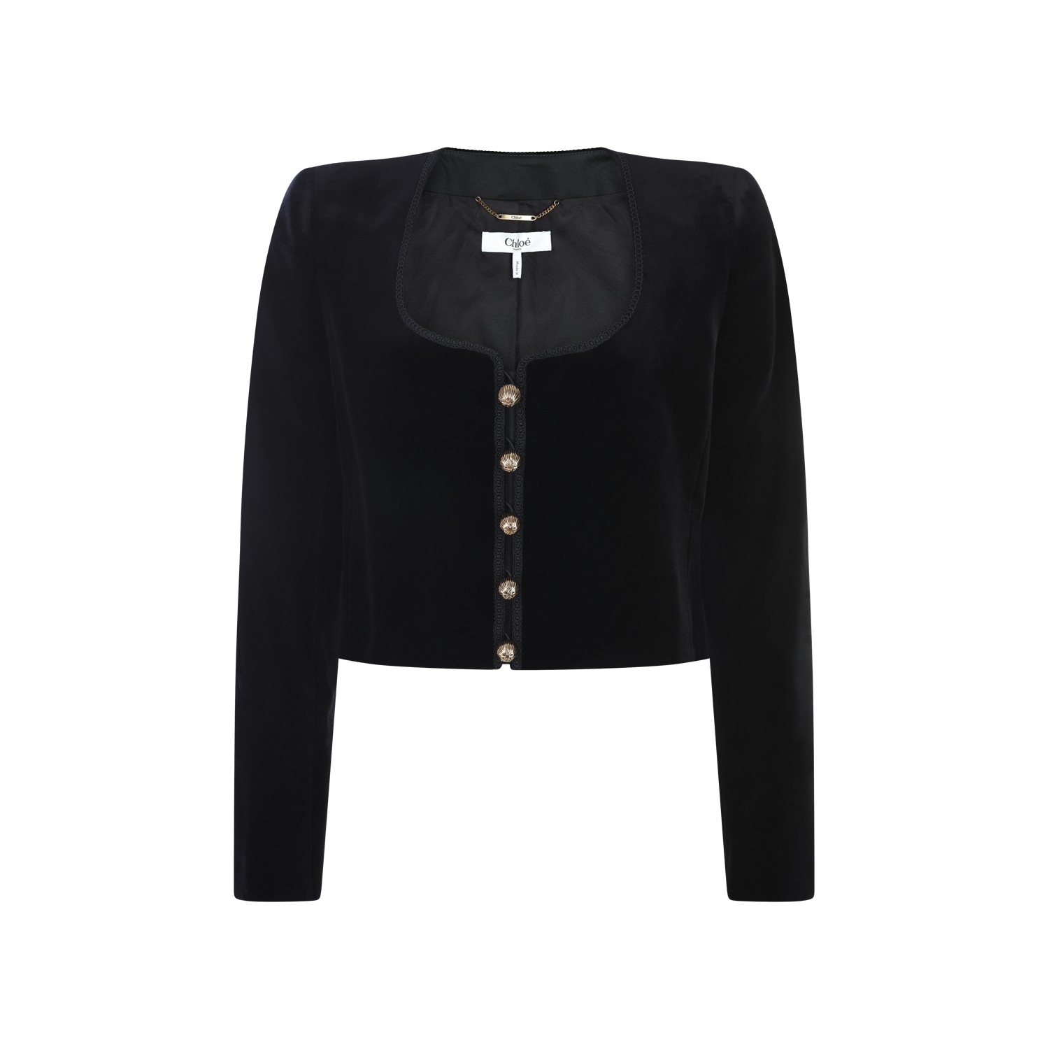 Black cotton casual jacket from Chlofeaturing square collar, long sleeves, buttons fastening and macramdetails.