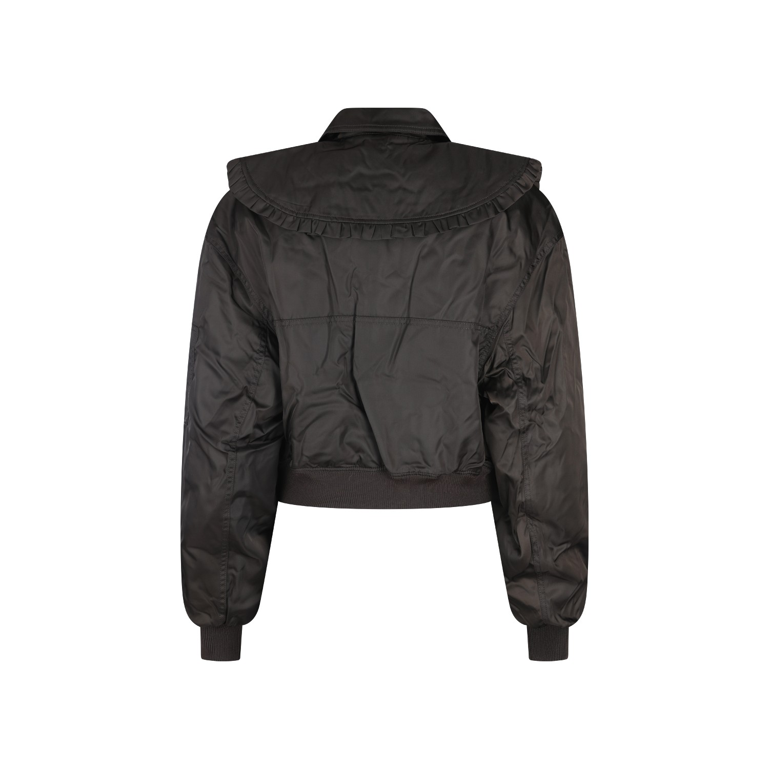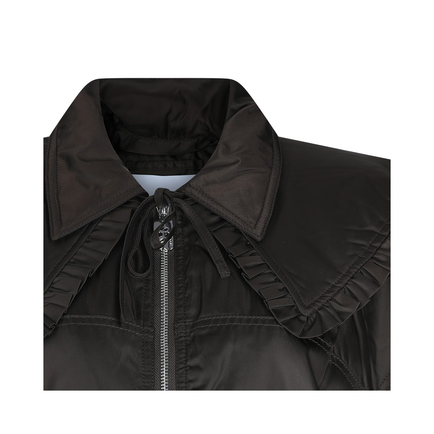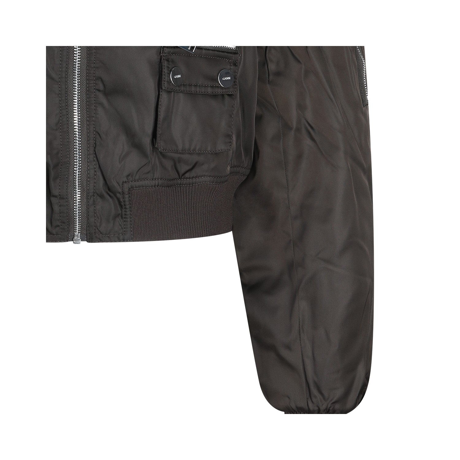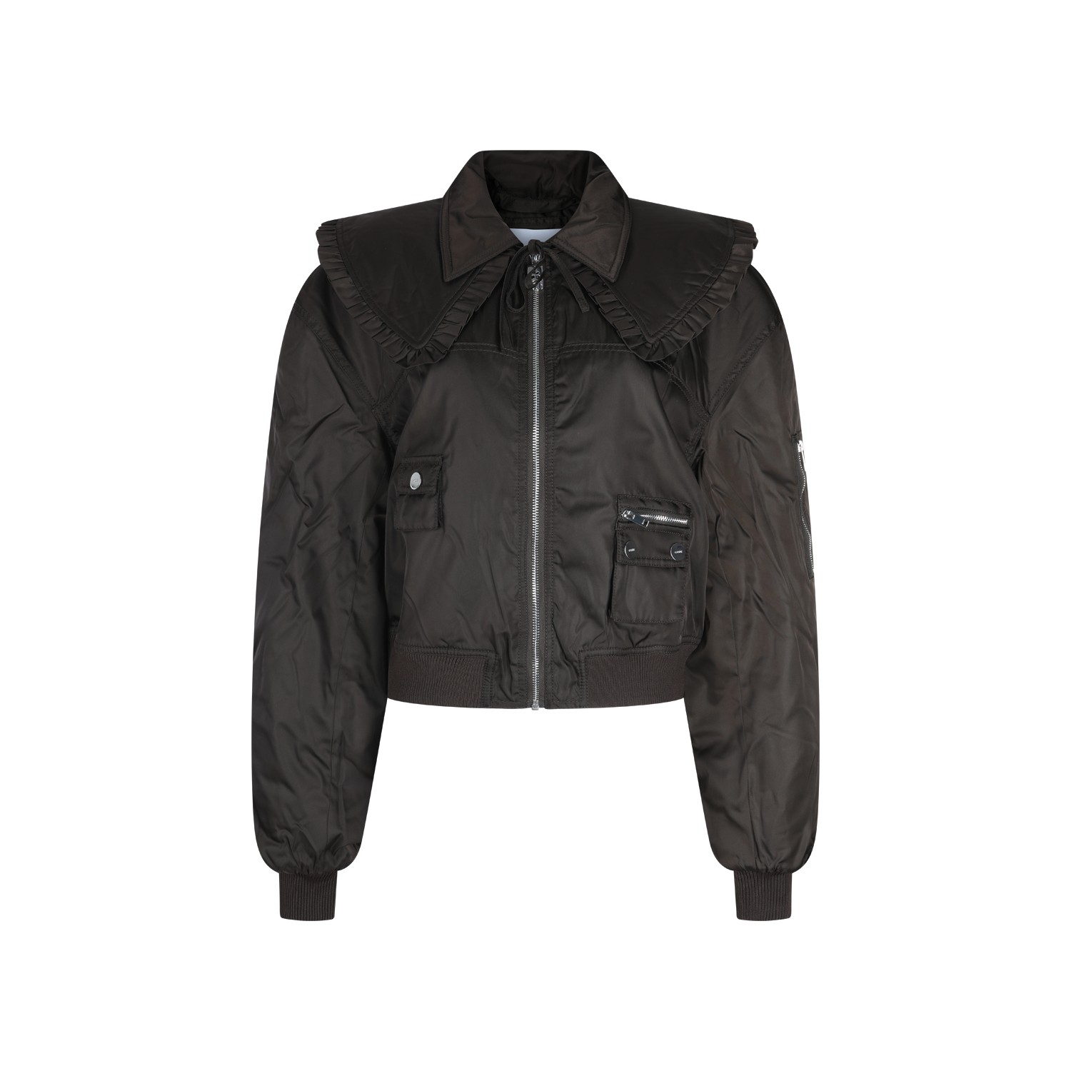 Dark brown casual jacket from Ganni featuring classic collar, extra removable collar, zipper closure, long sleeves, multiple pockets, ribbed edges, short length and regular fit.