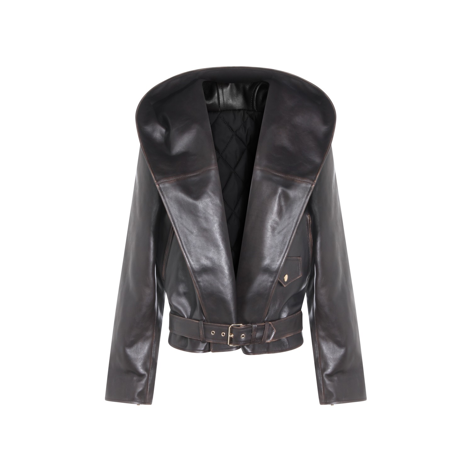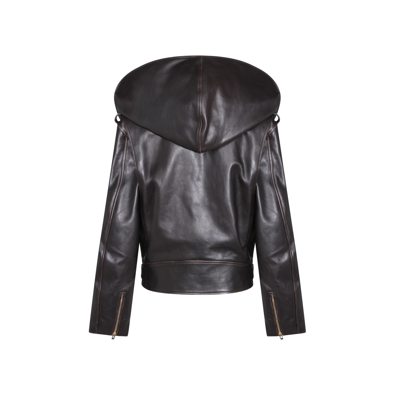 Dark brown leather jacket from Alaia featuring wide lapel collar, hood, long sleeves, belt closure and pockets.