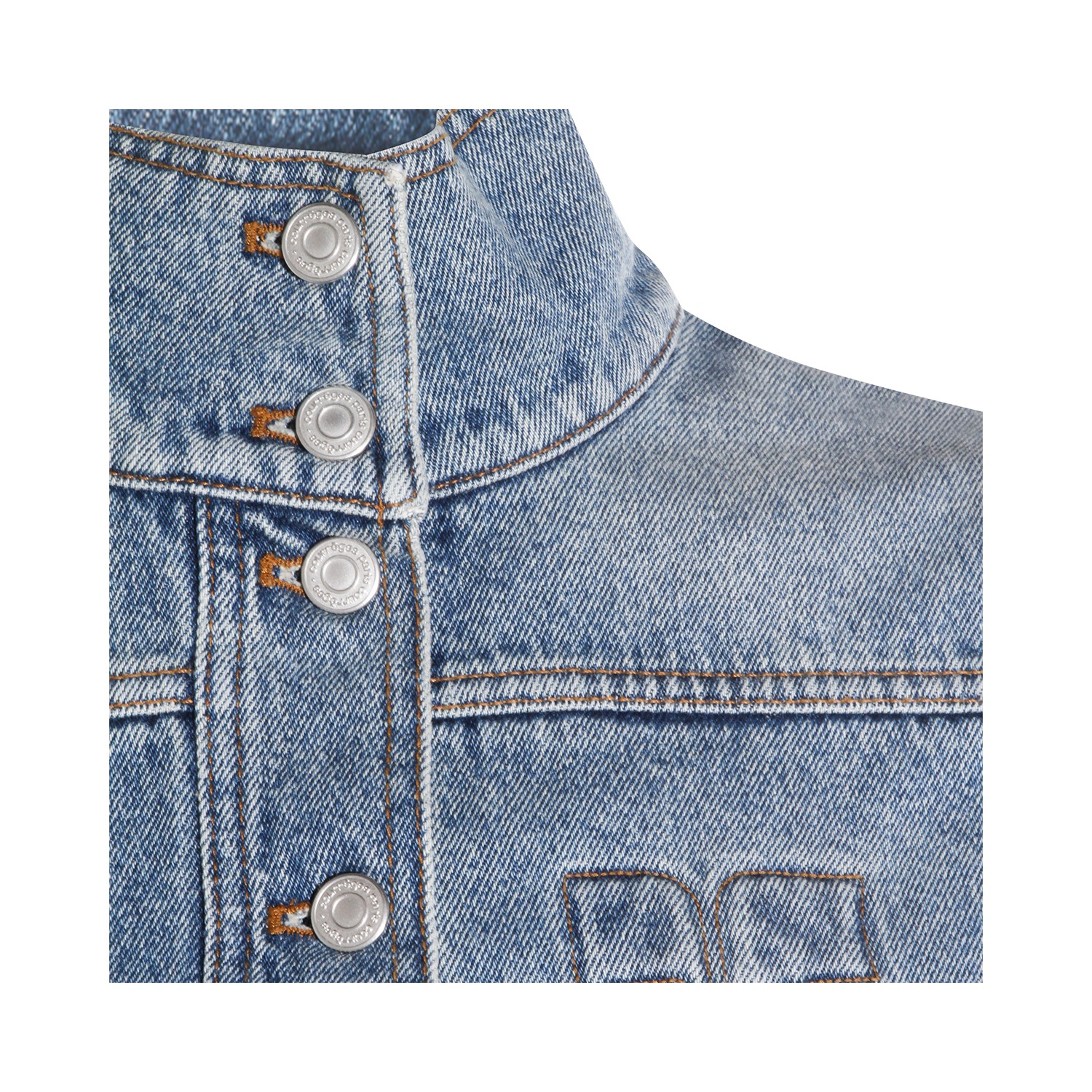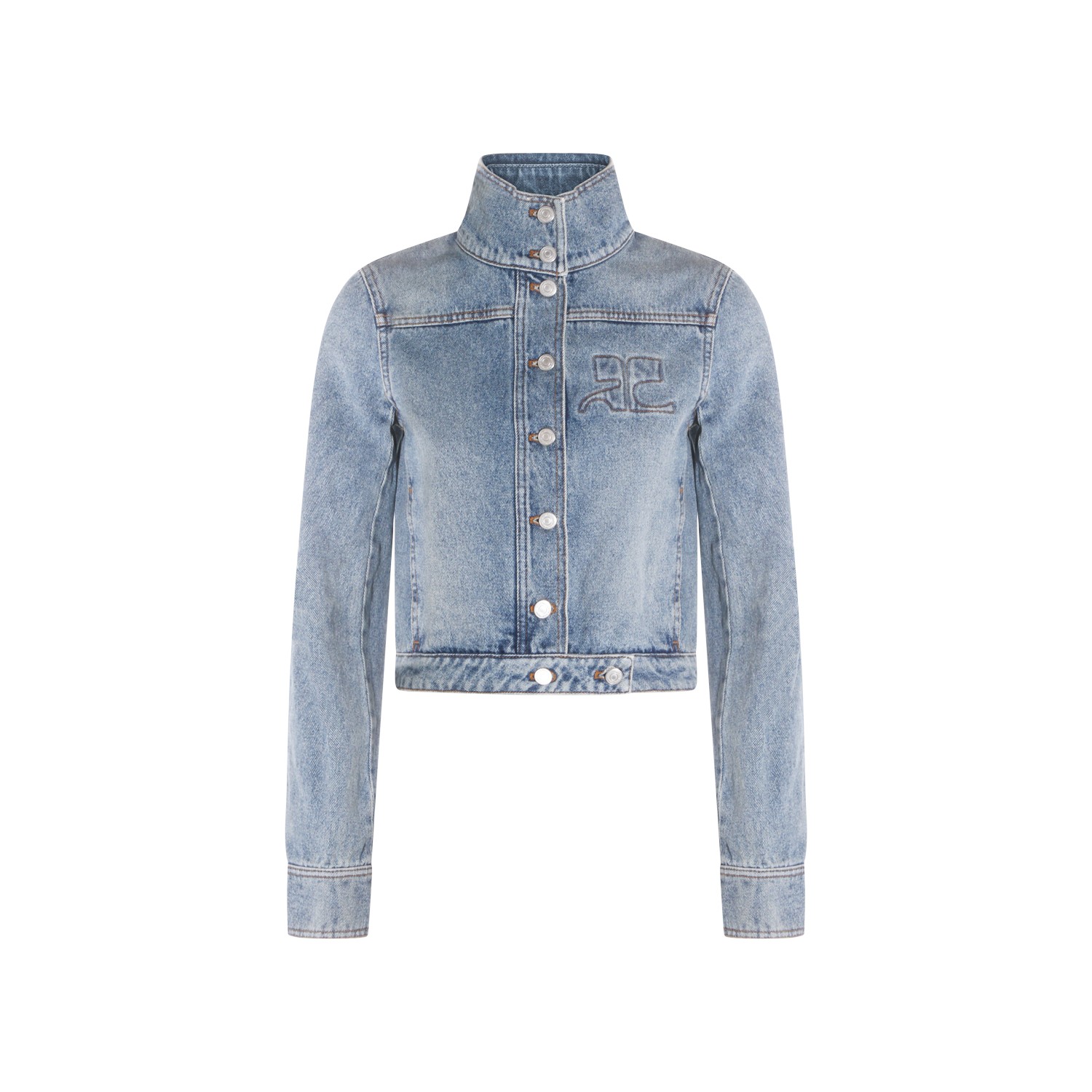 Blue cotton denim jacket from Courreges featuring high buttoned collar, long sleeves, frontal fastening, logo and regular fit.