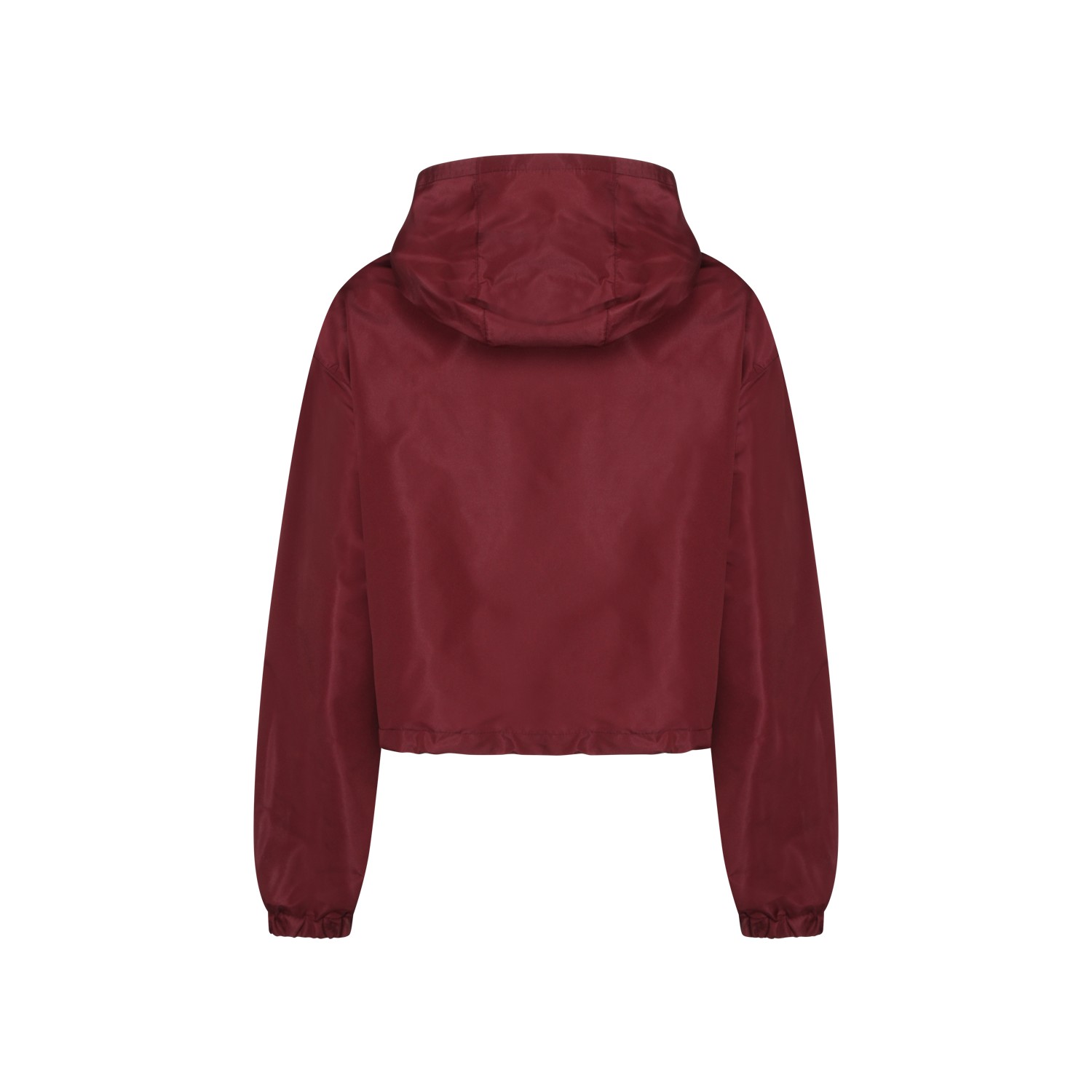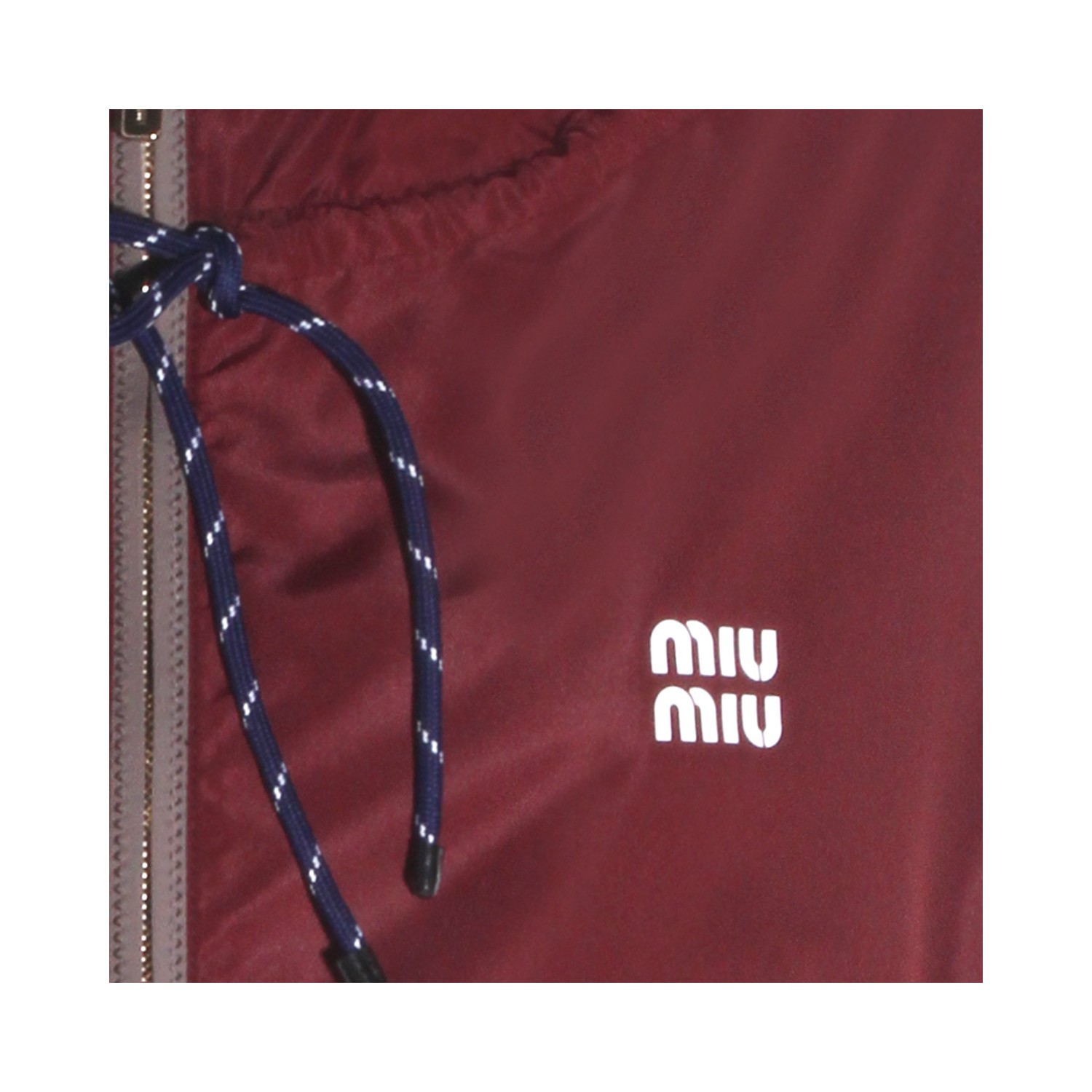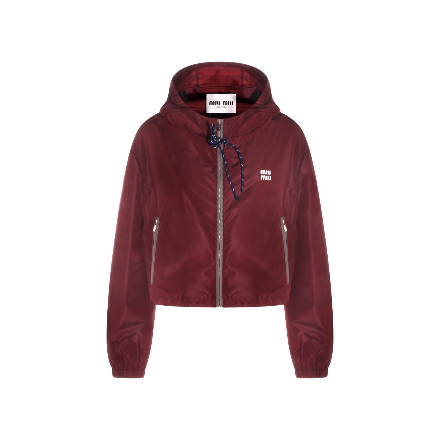 Bordeaux cotton casual jacket from Miu Miu featuring hooded collar, zip closure, long sleeves, elasticized cuffs, drawstring hem, frontal zip pockets, rubber logo and regular vestibility.