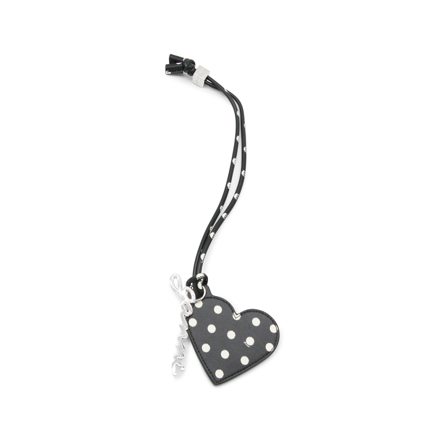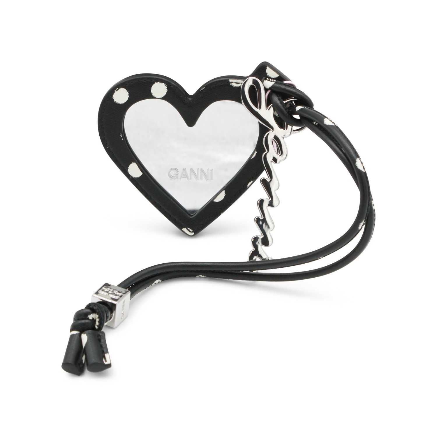 Black leather keyring from Ganni featuring silver tone hardware.