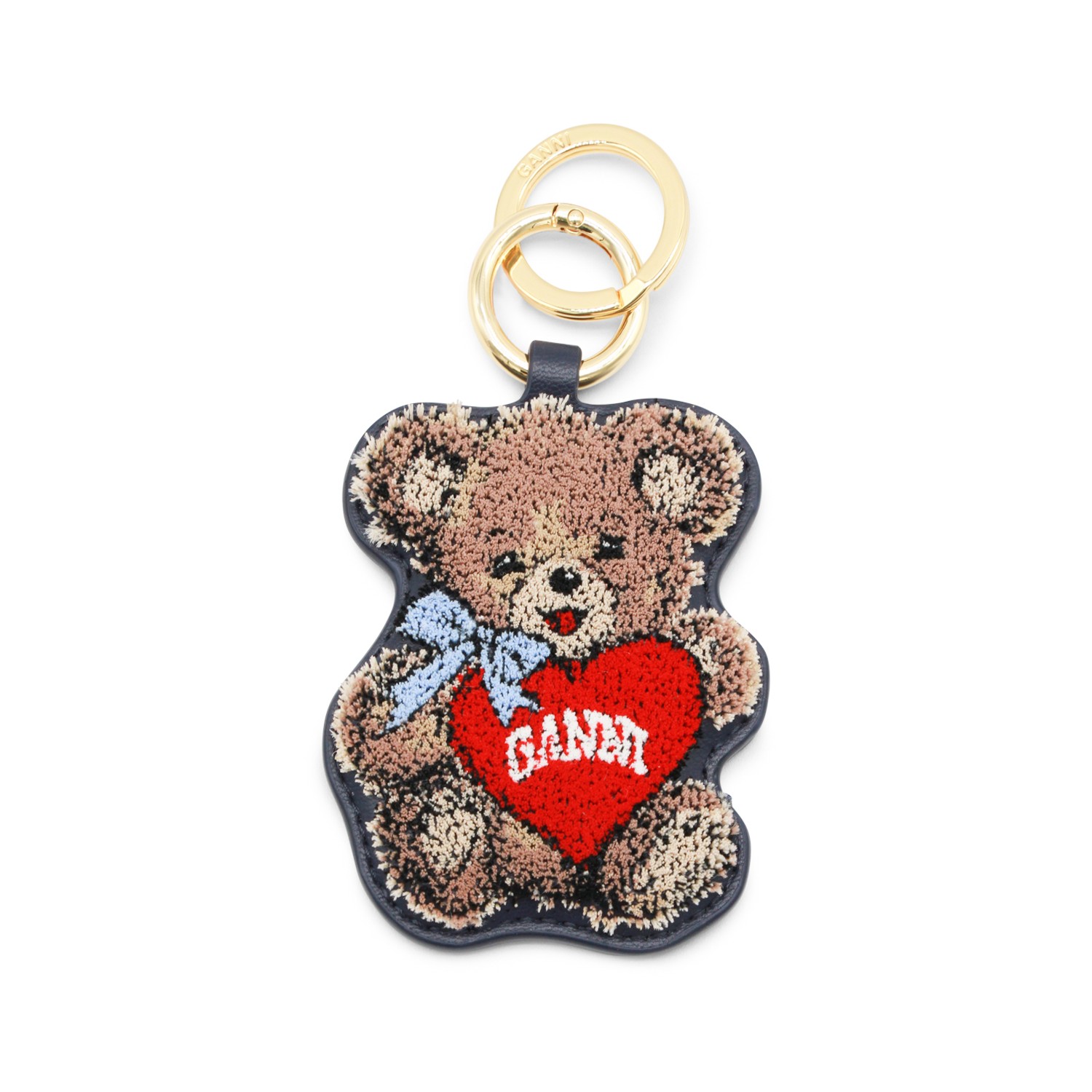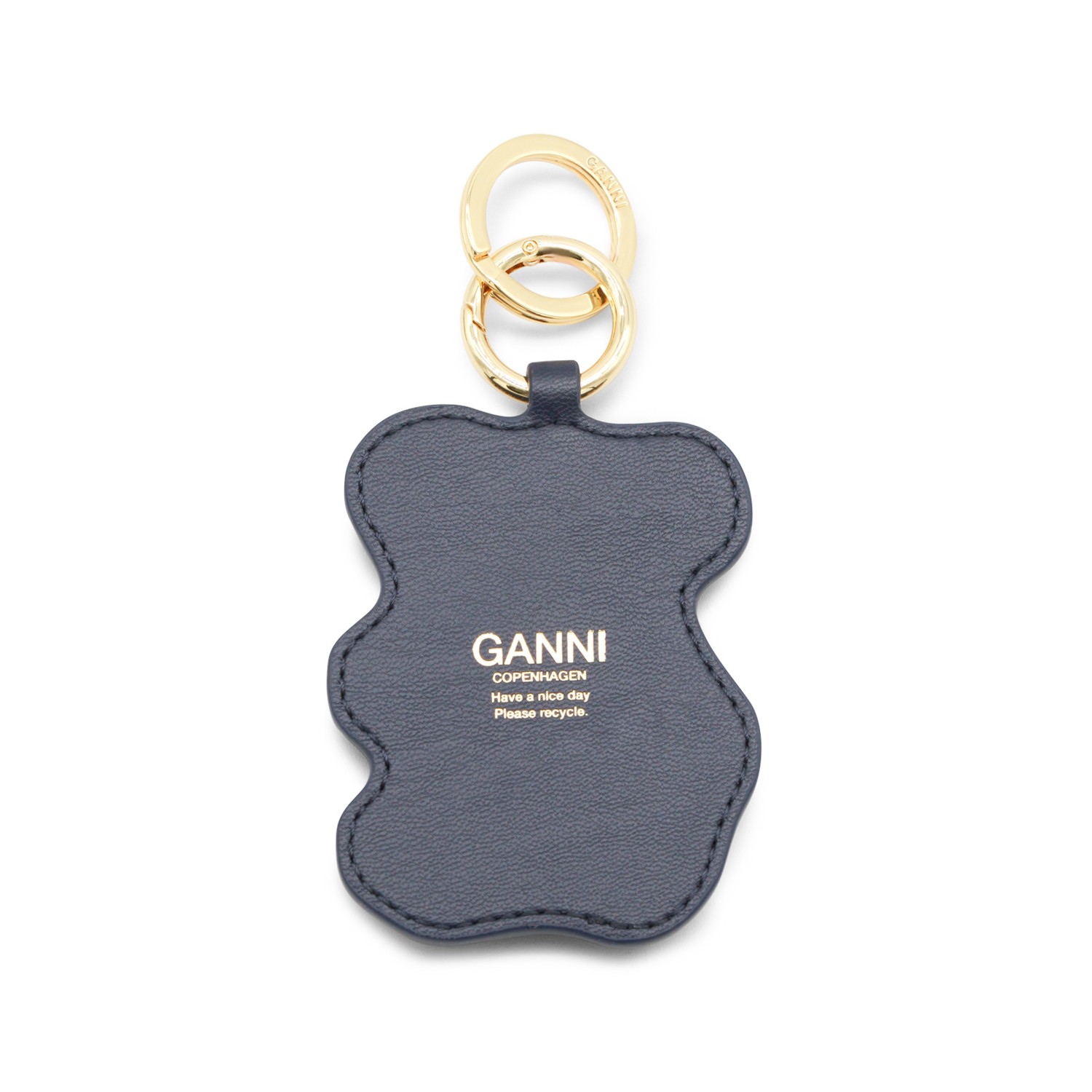 Black leather keyring from Ganni featuring gold tone hardware.