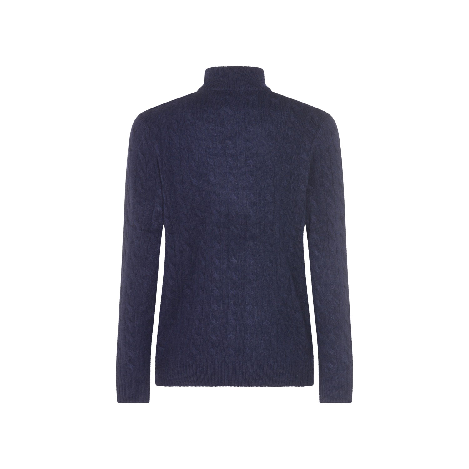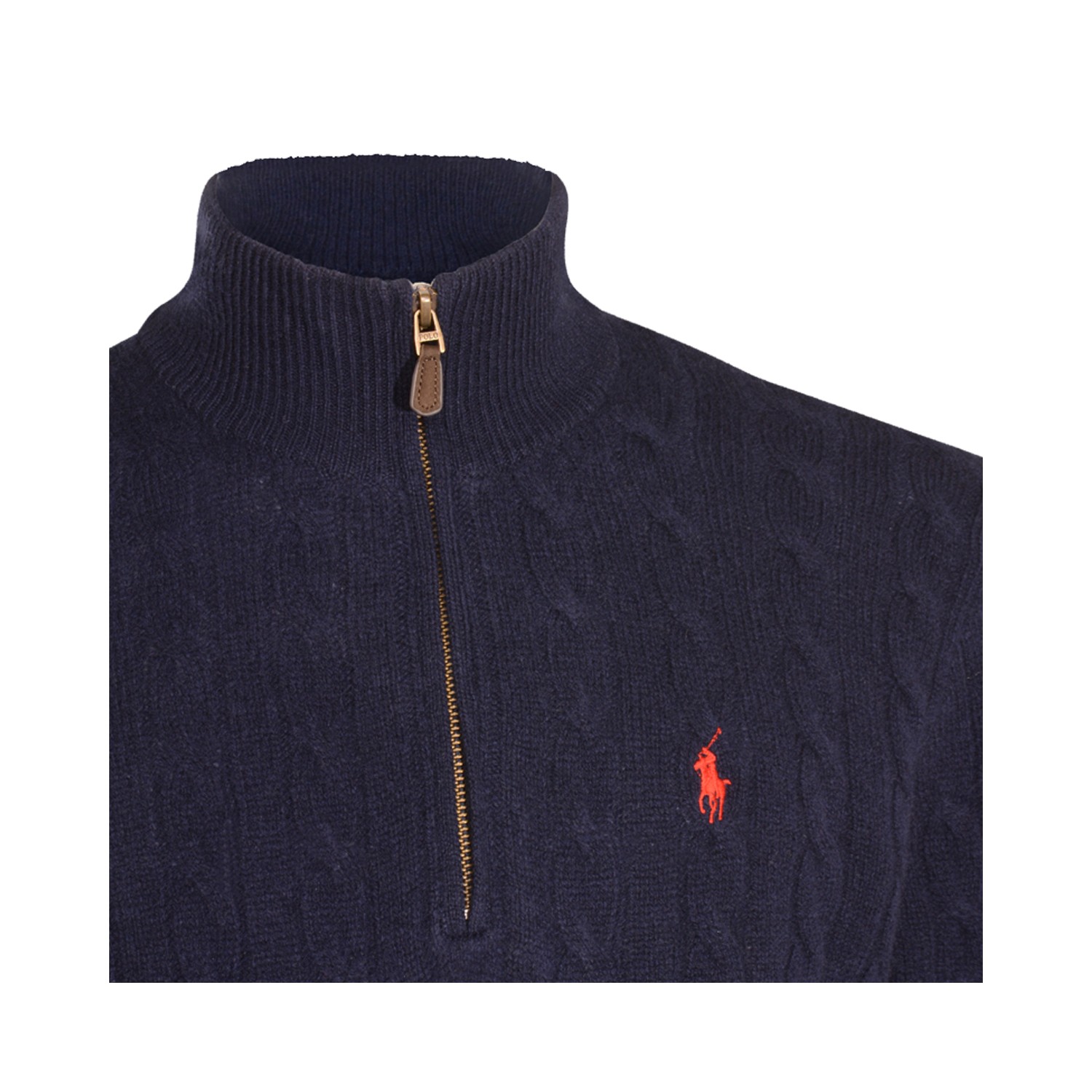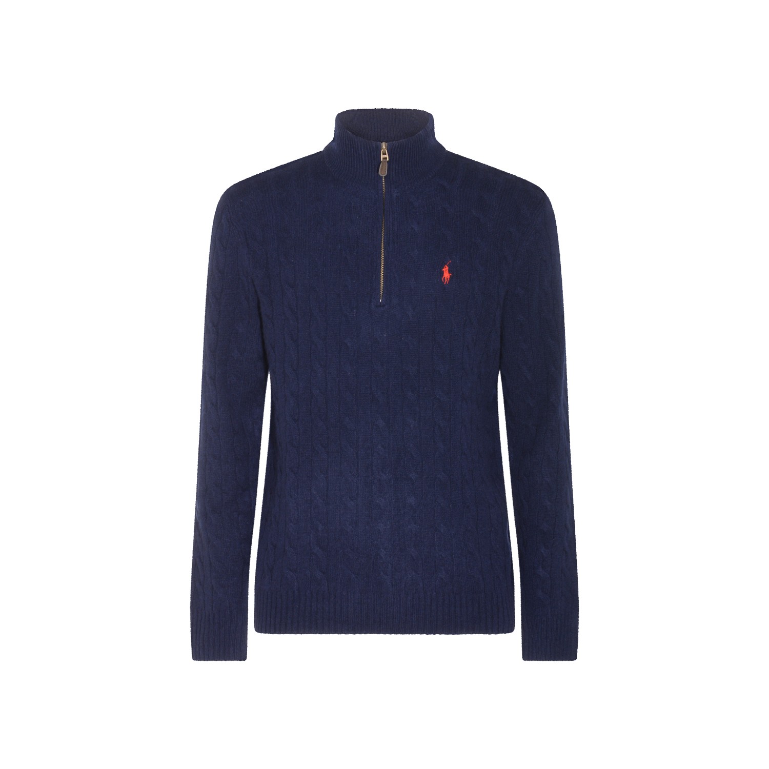 Dark blue wool knitwear from Polo Ralph Lauren featuring high collar, long sleeves, logo detail and zip fastening.