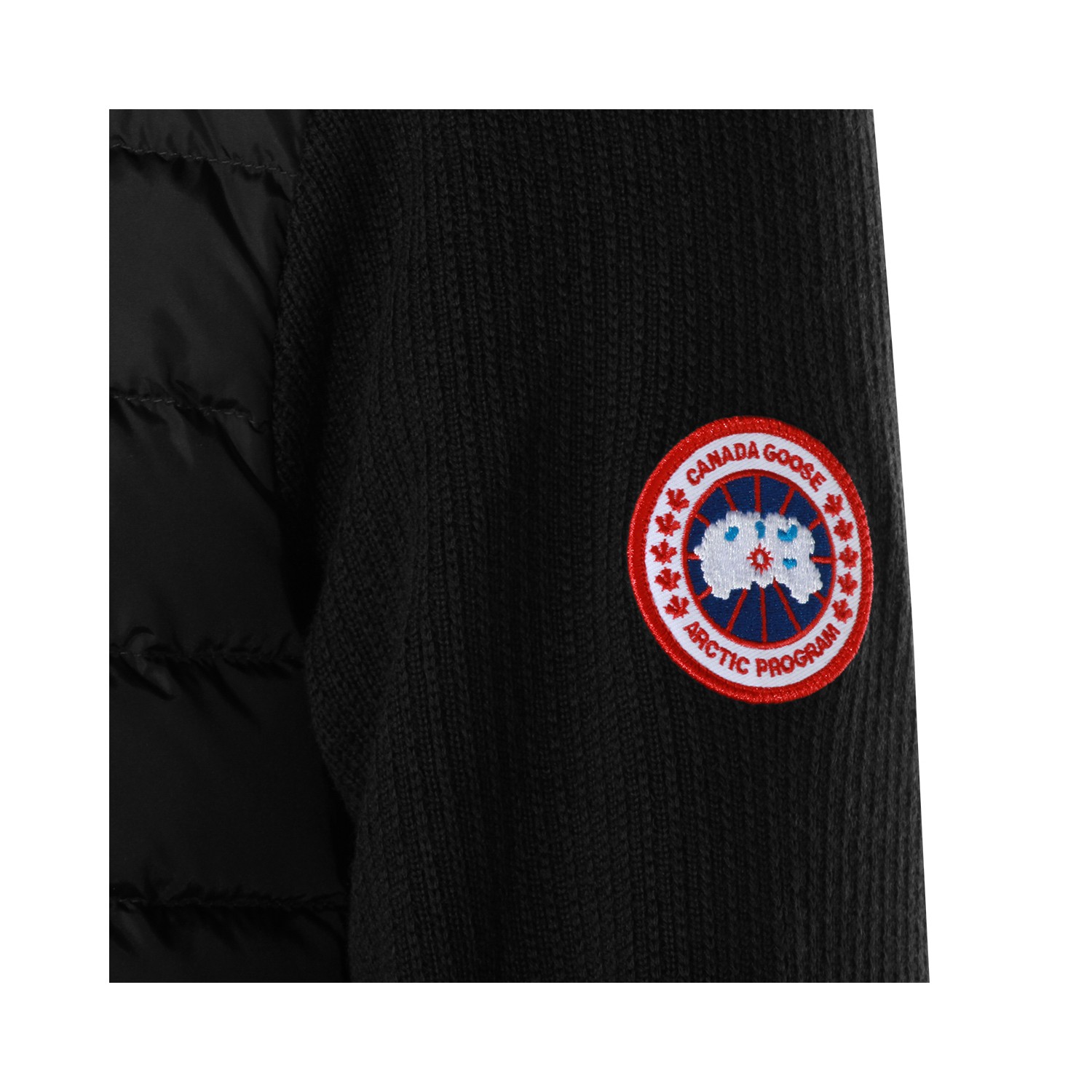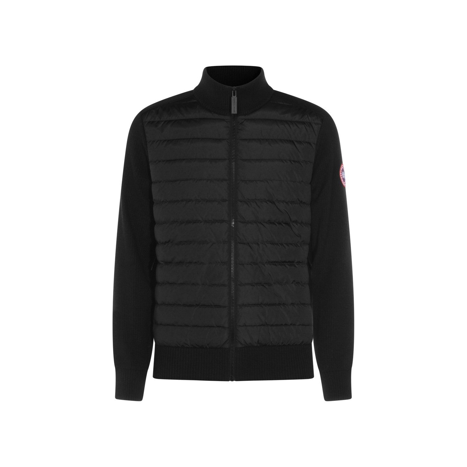 Black wool knitwear from Canada Goose featuring high collar, long sleeves, logo patch, ribbed cuffs and hem and regular vestibility.