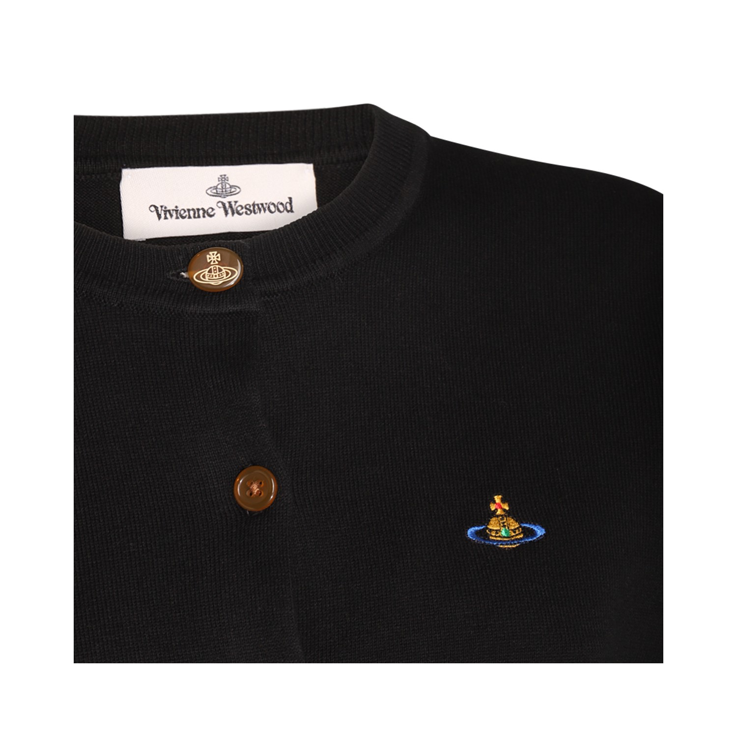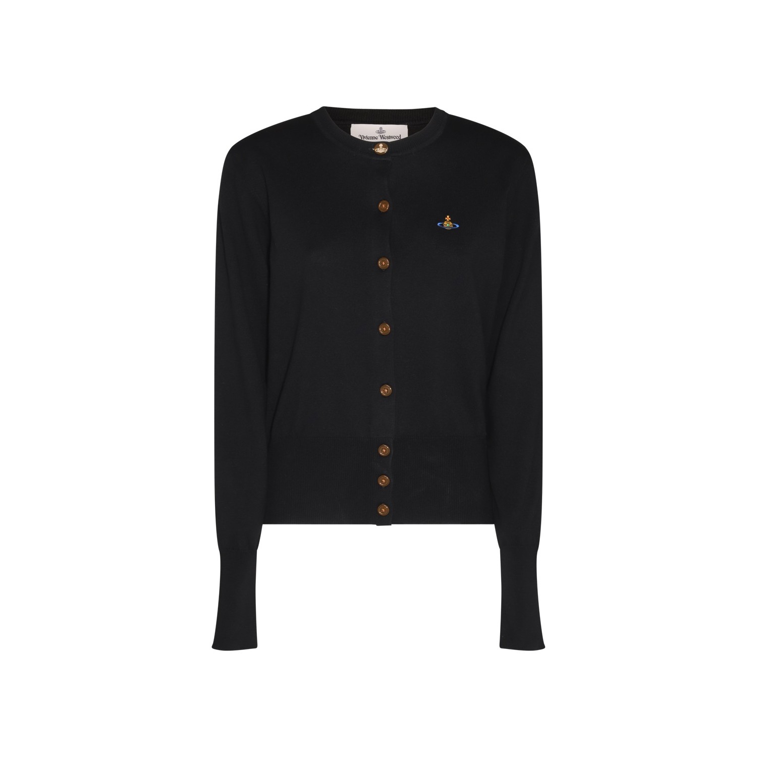 Black wool knitwear from Vivienne Westwood featuring long sleeves, buttons fastening, logo and spft vestibility.