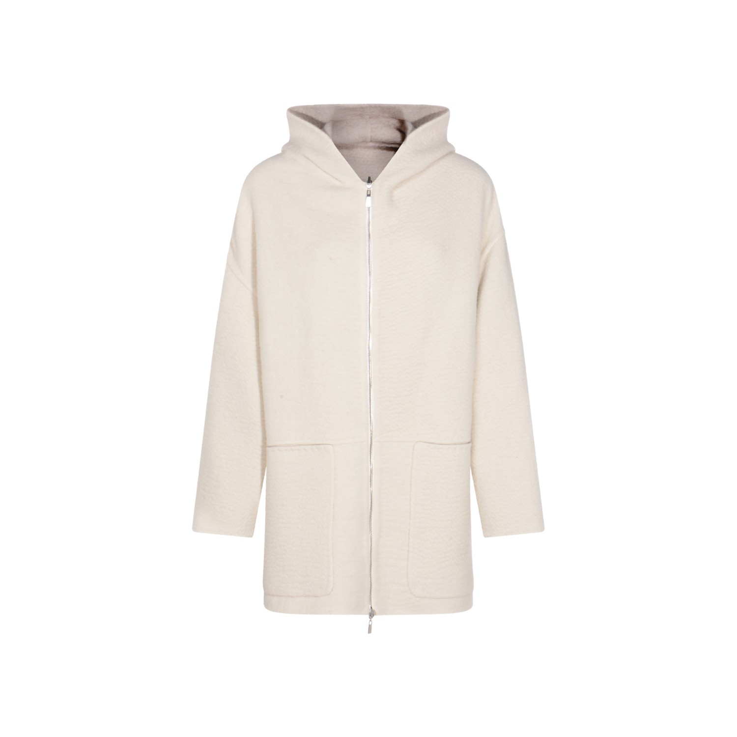 Beige wool knitwear from Malo featuring hood, long sleeves, zip fastening, pockets and midi lenght.
