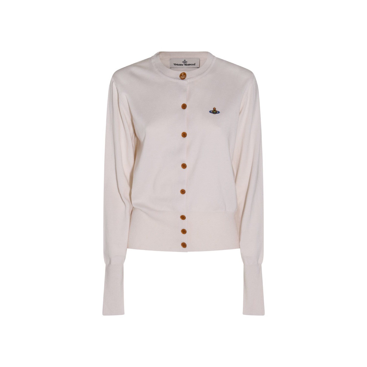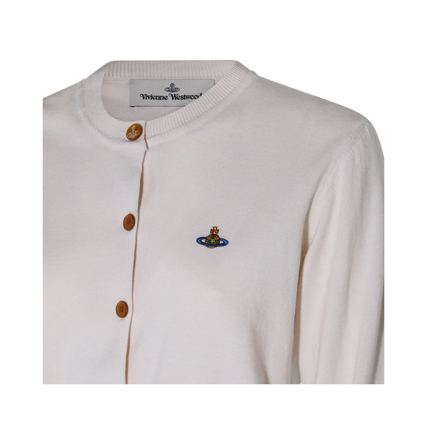 Grey melange wool knitwear from Vivienne Westwood featuring round collar, long sleeves, frontal buttons fastening, embroidered logo and regular vestibility.