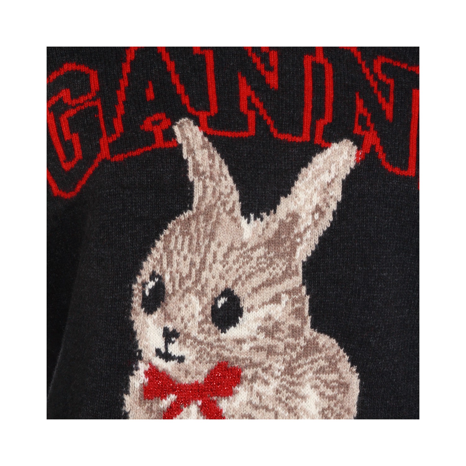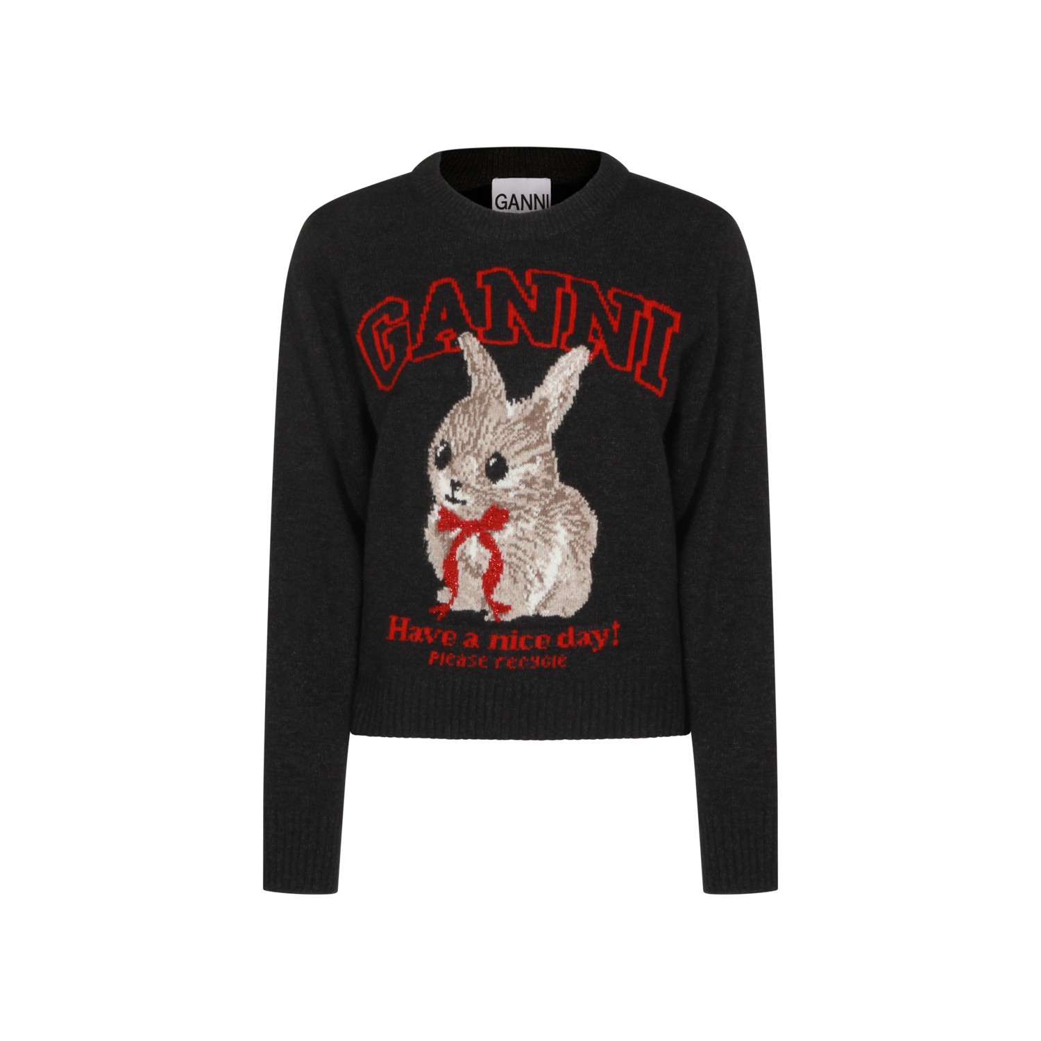 Black wool knitwear from Ganni featuring crew neck long sleeves, frontal print and regular vestibility.