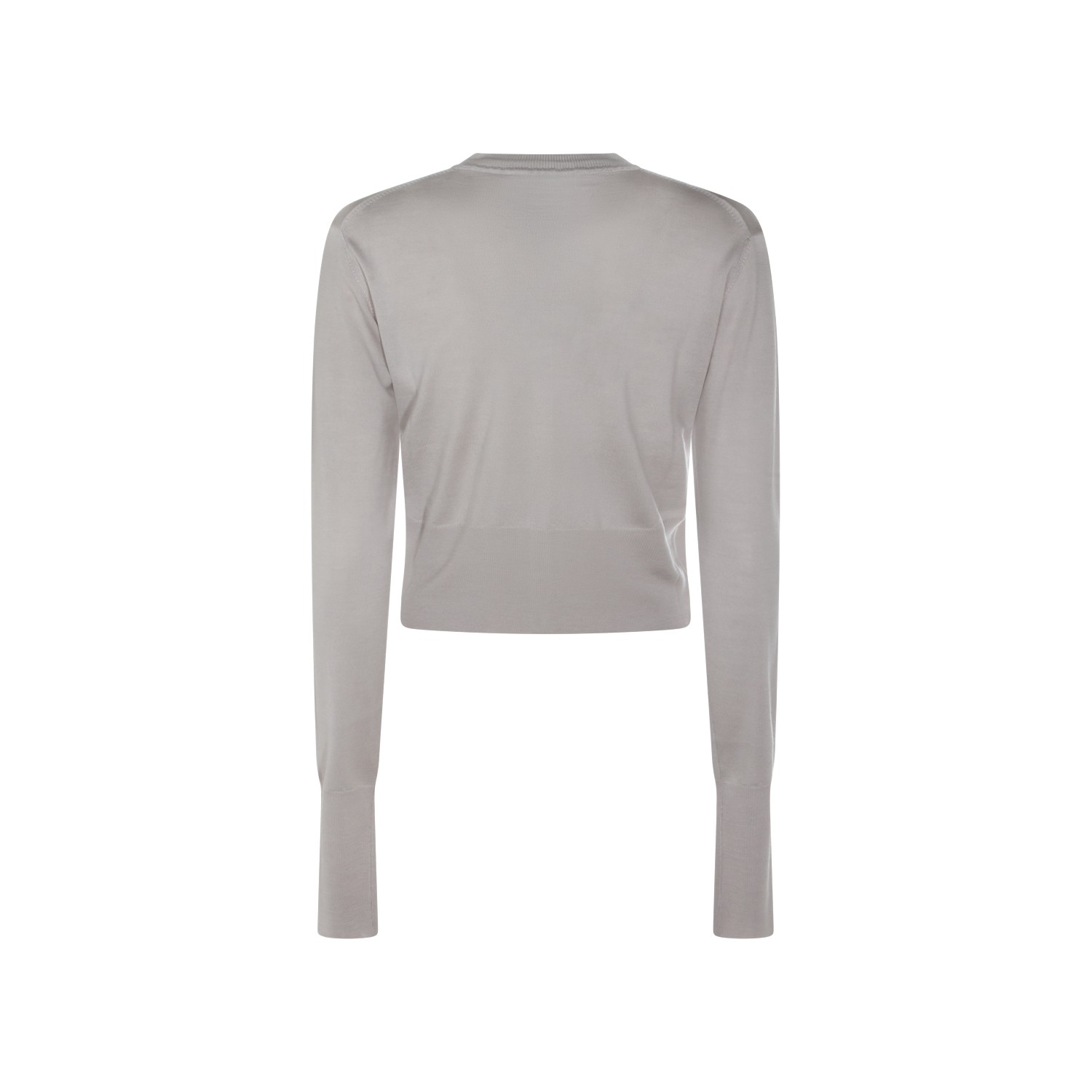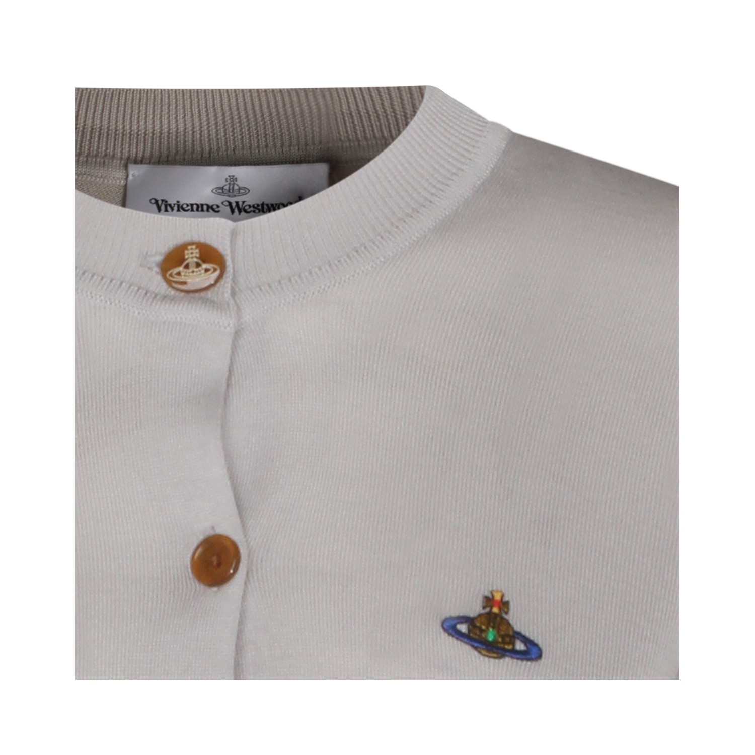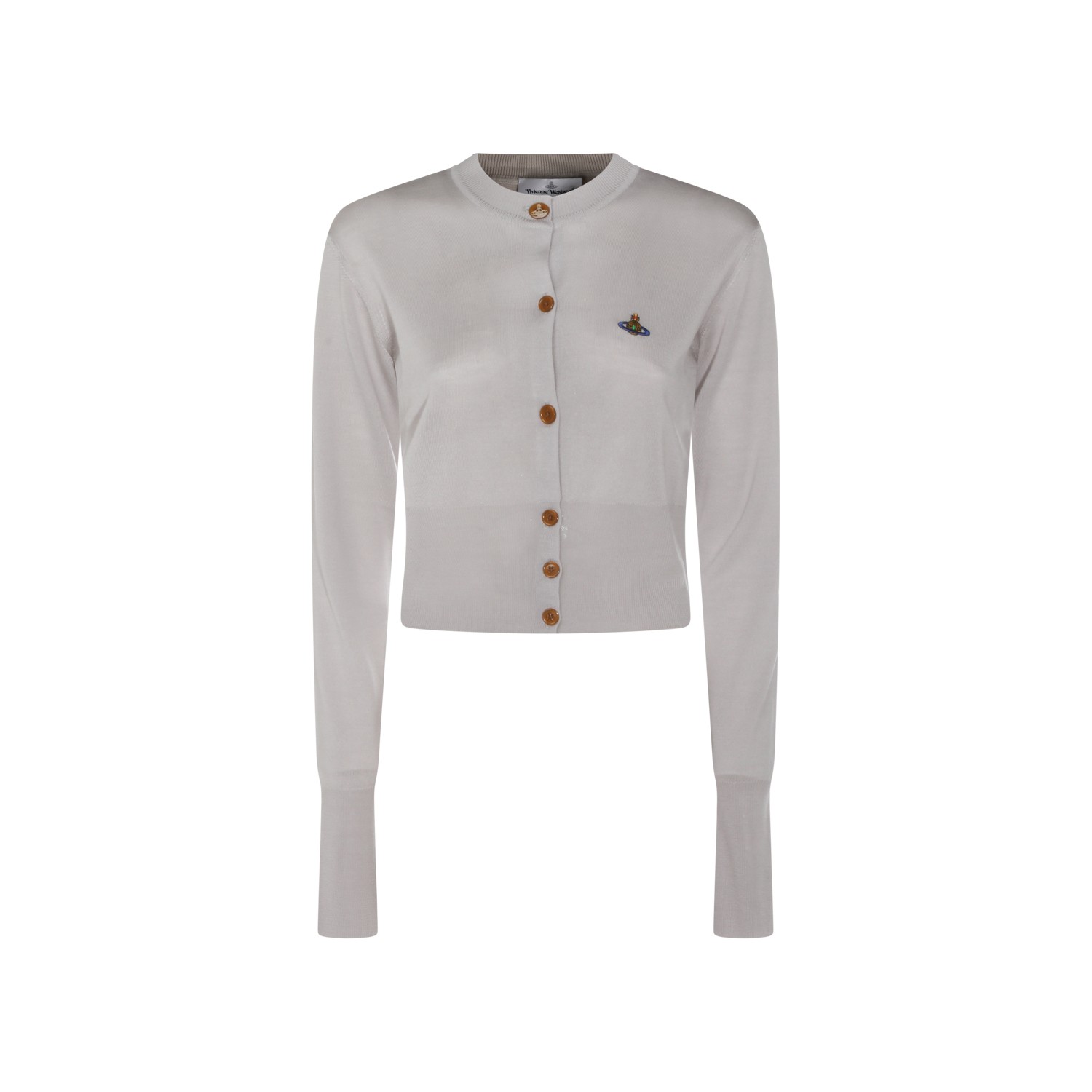 Light grey wool blend knitwear from Vivienne Westwood featuring crew neck, long sleeves, buttons fastening, logo and short length.