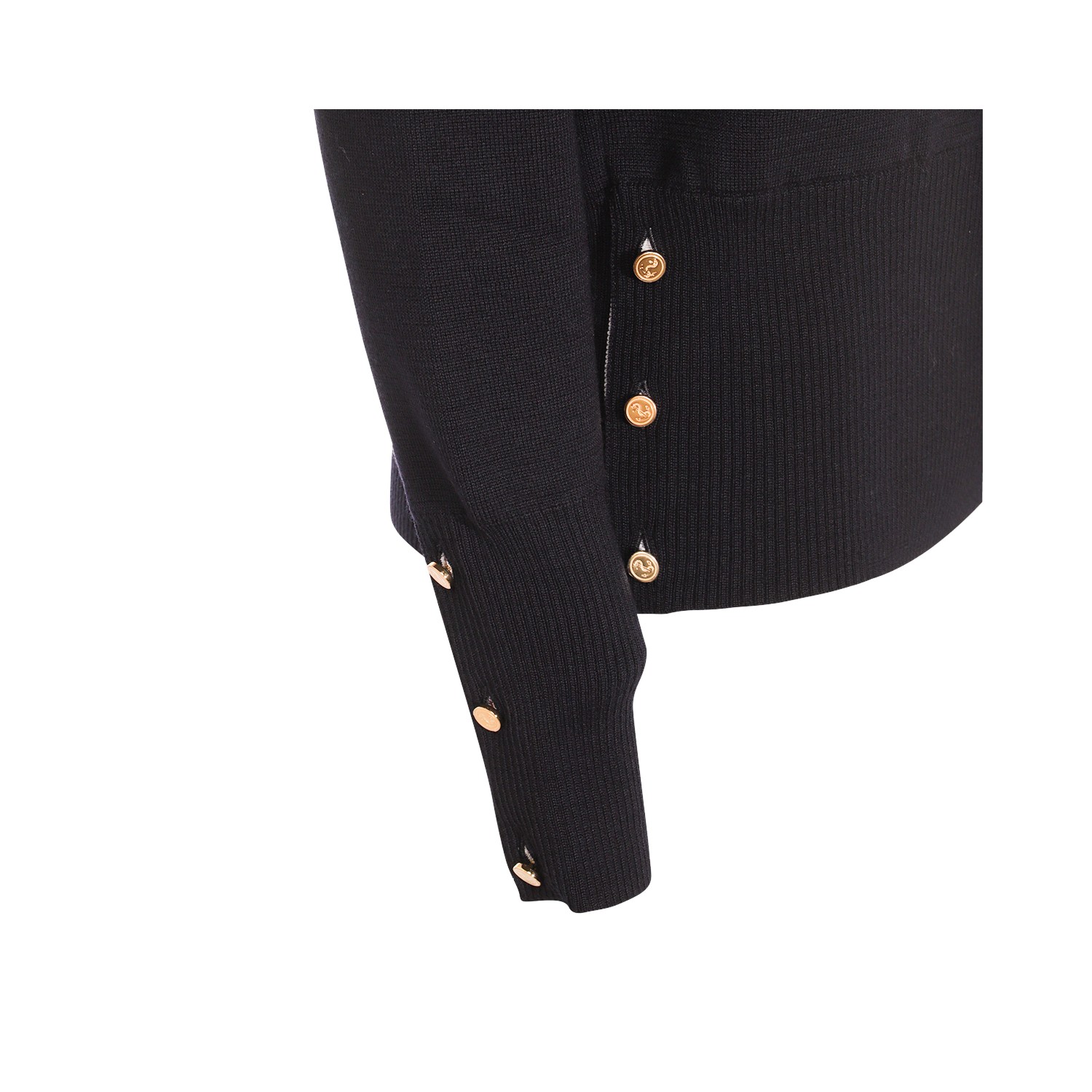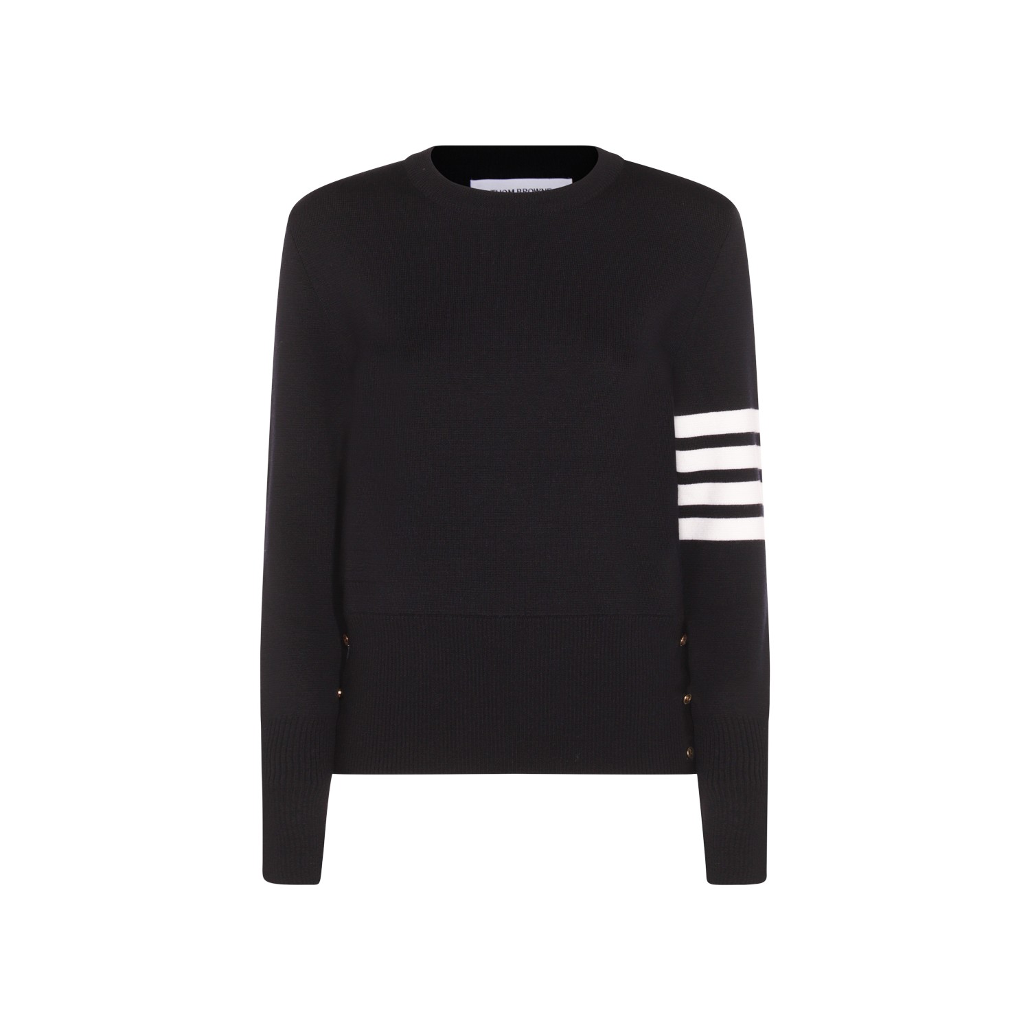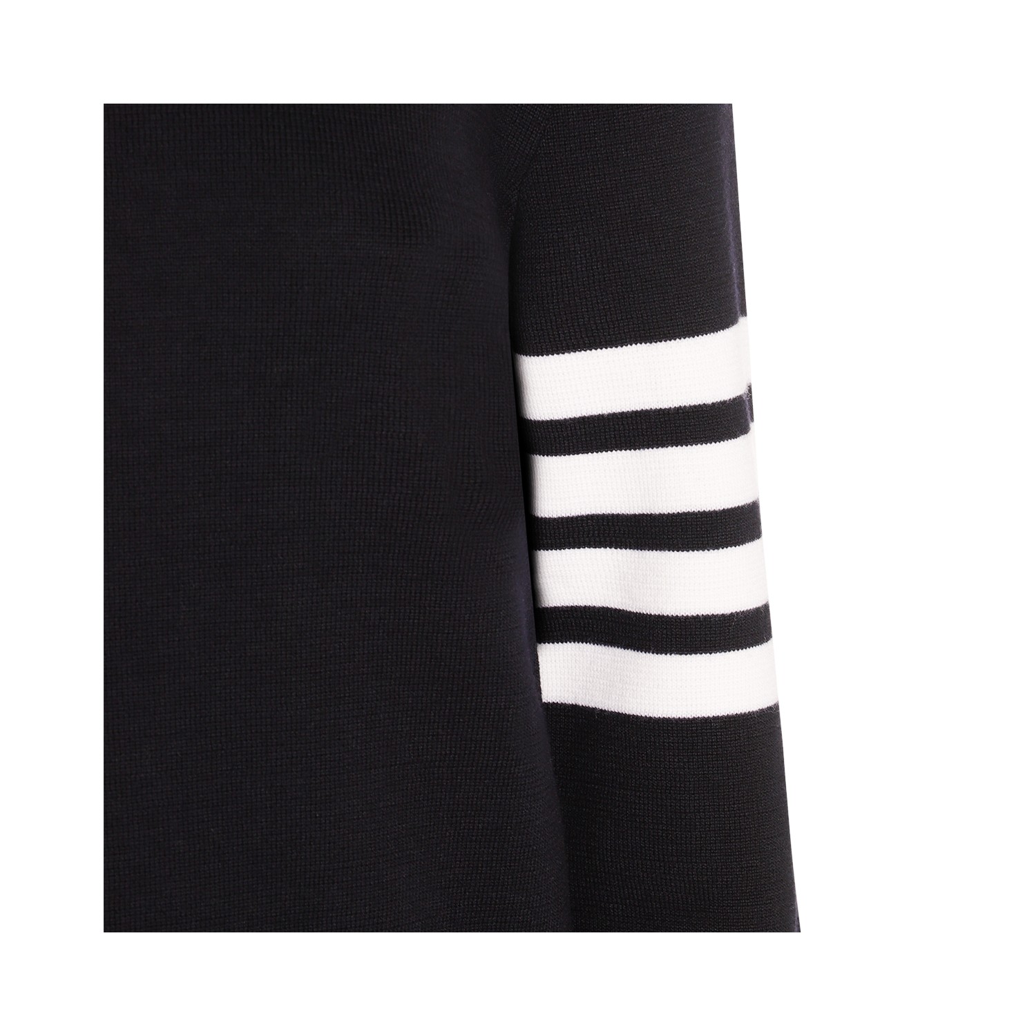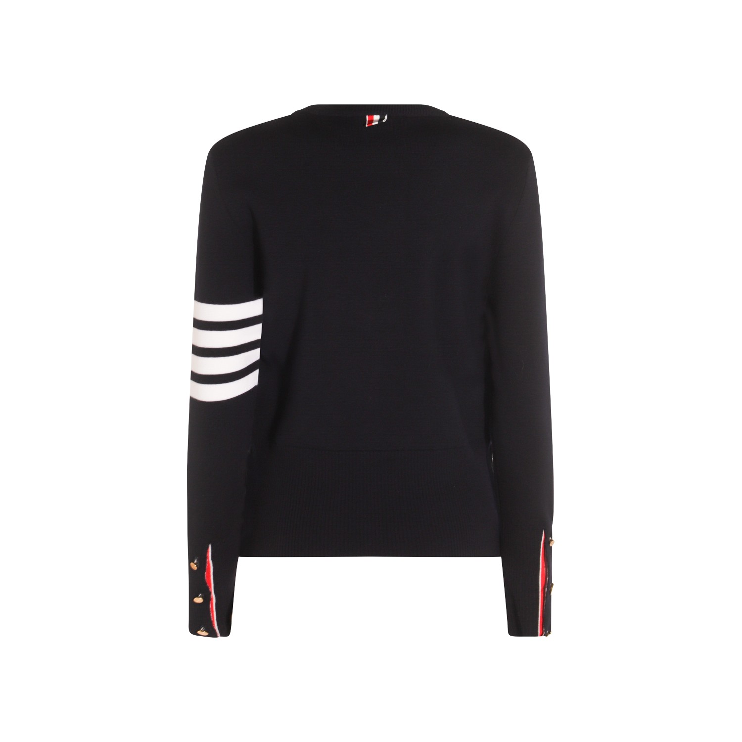 Dark blue wool knitwear from Thom Browne featuring round collar, long sleeves, ribbed cuffs and hem and regular vestibility.