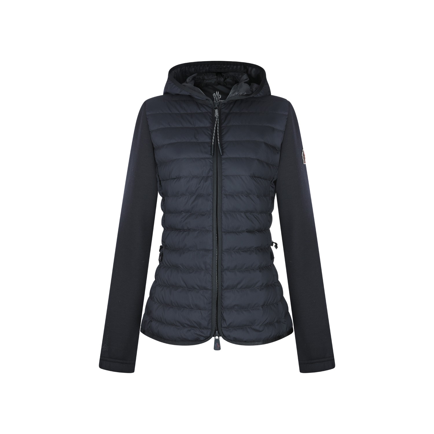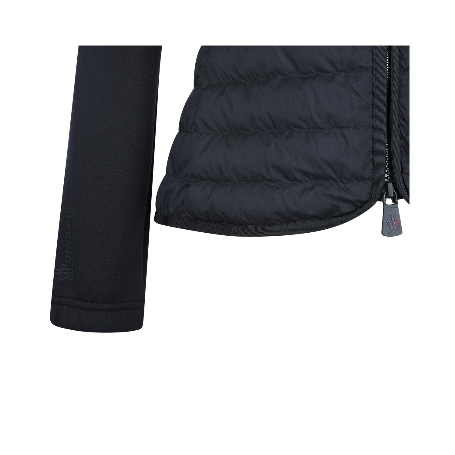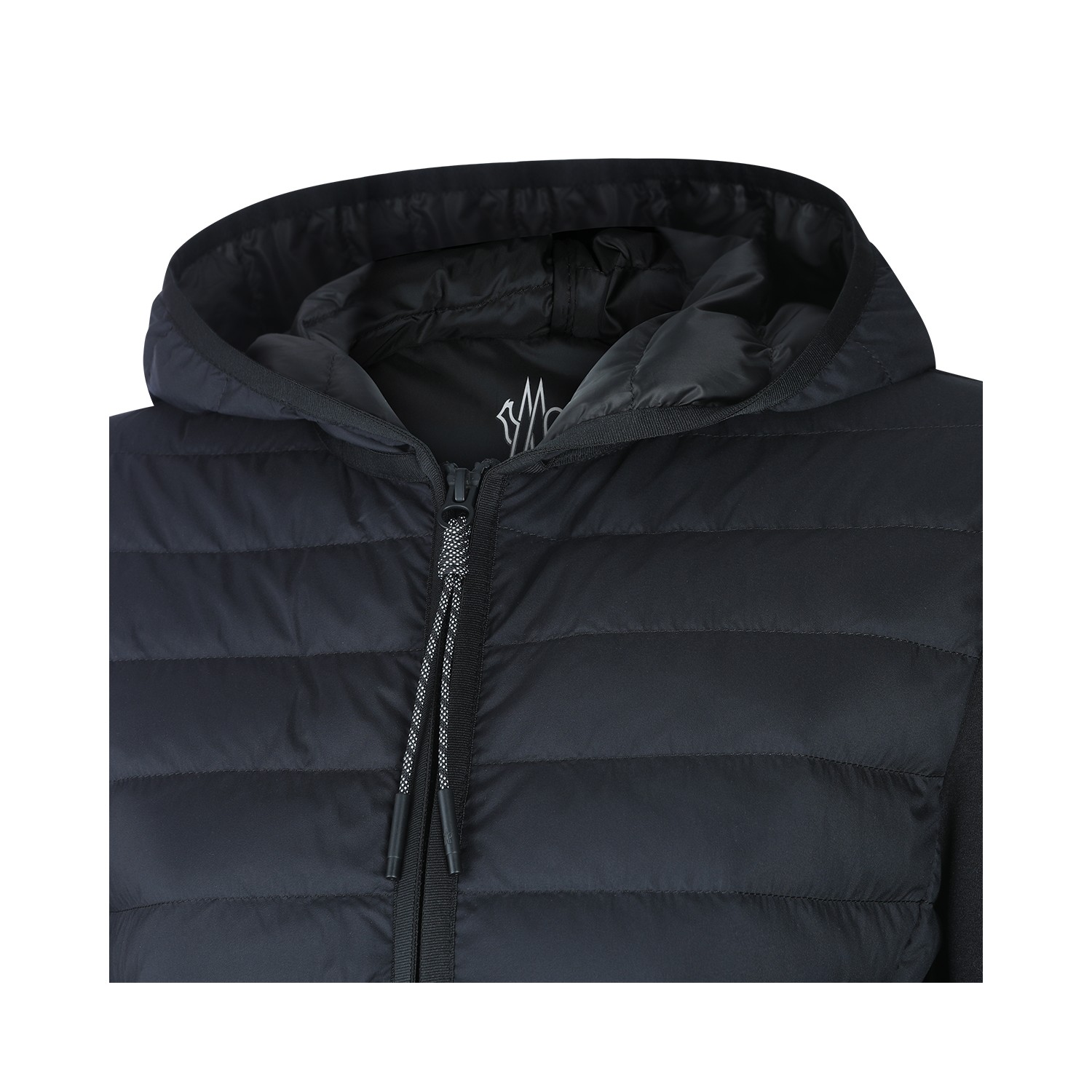 Black knitwear from Moncler Grenoble featuring hood, long sleeves, zip fastening, quilted, curved hem and regular fit.