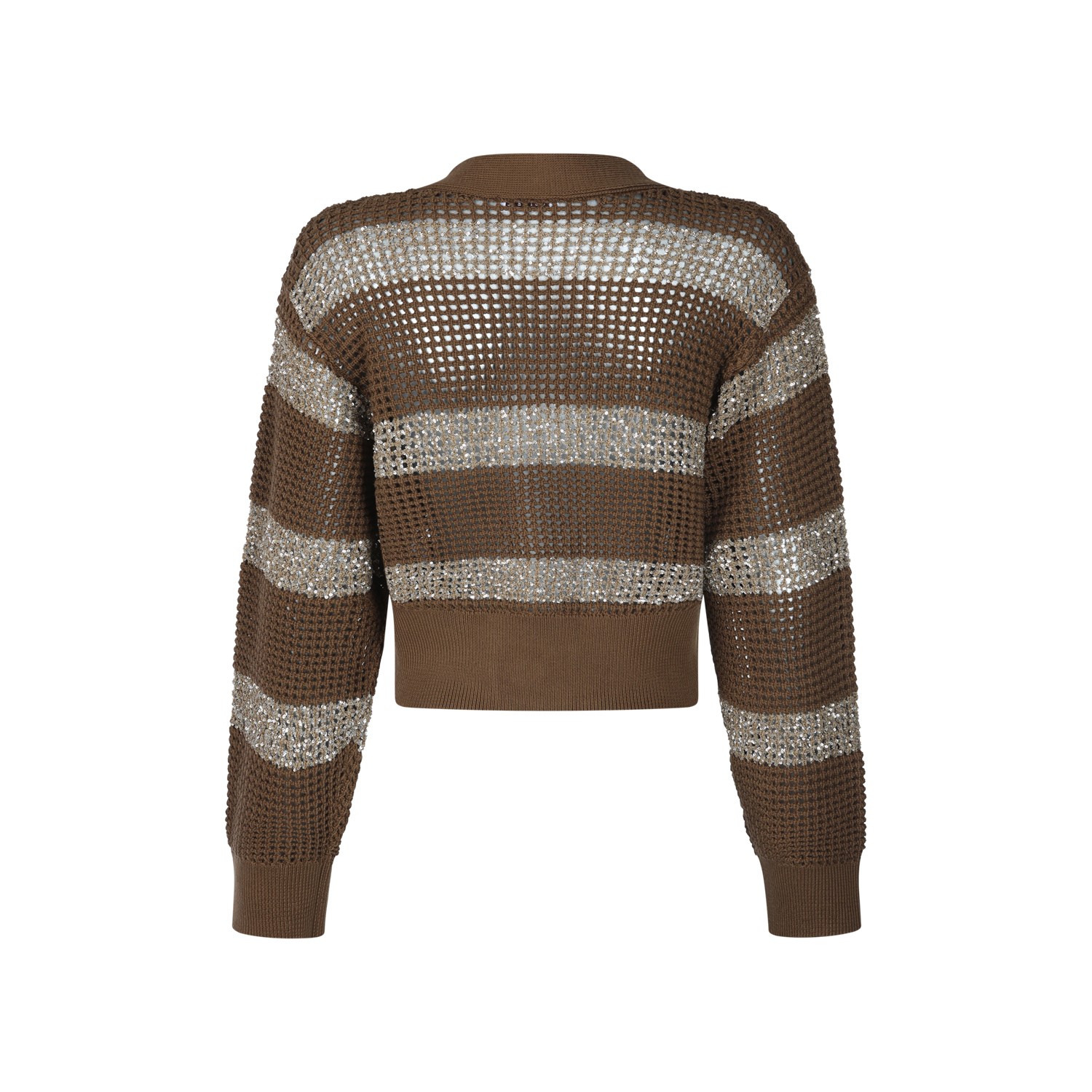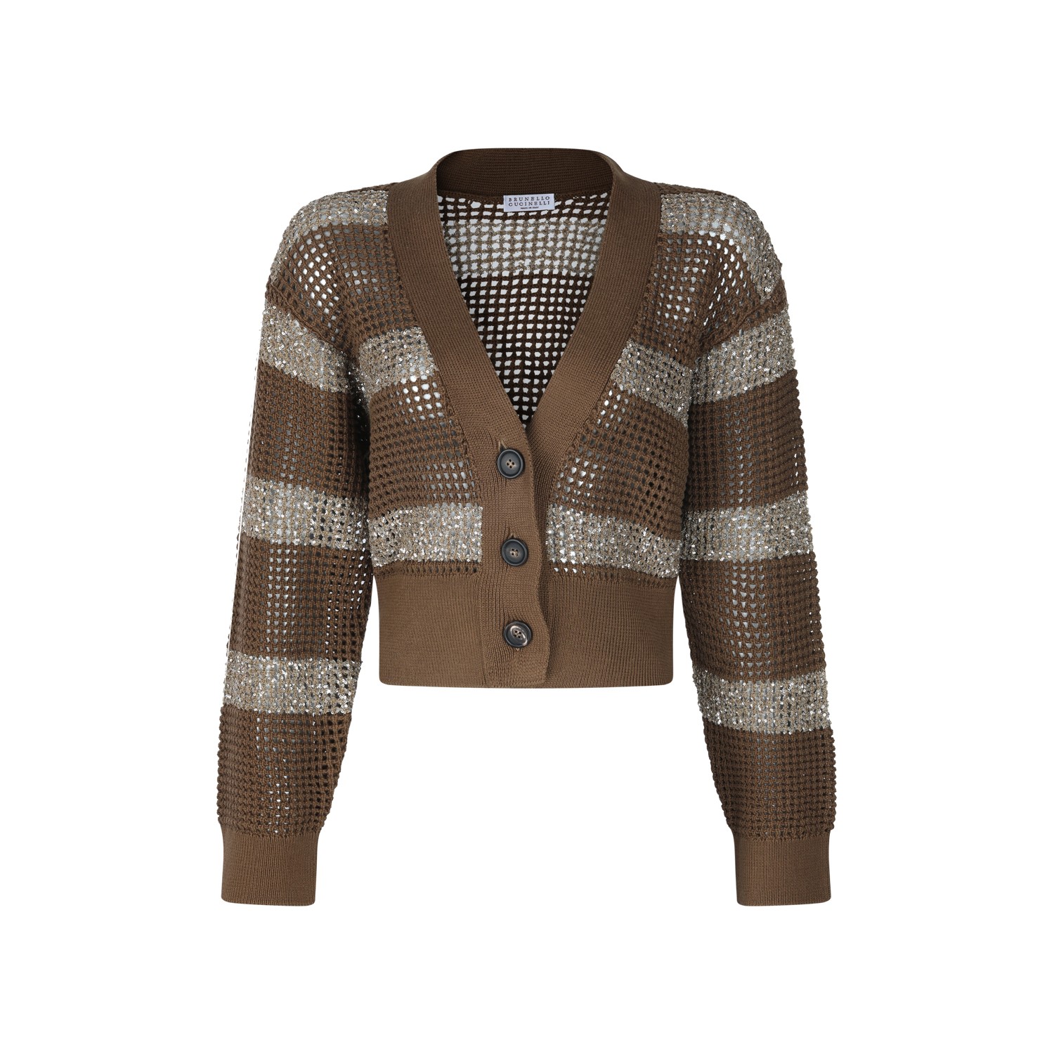 Sesame cotton stripe cardigan from Brunello Cucinelli featuring stripe motif, V neck, button closure, cropped line and ribbed hems.