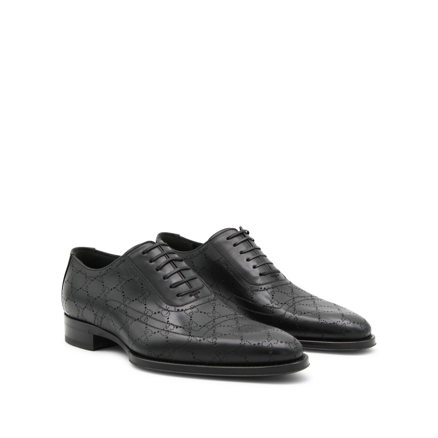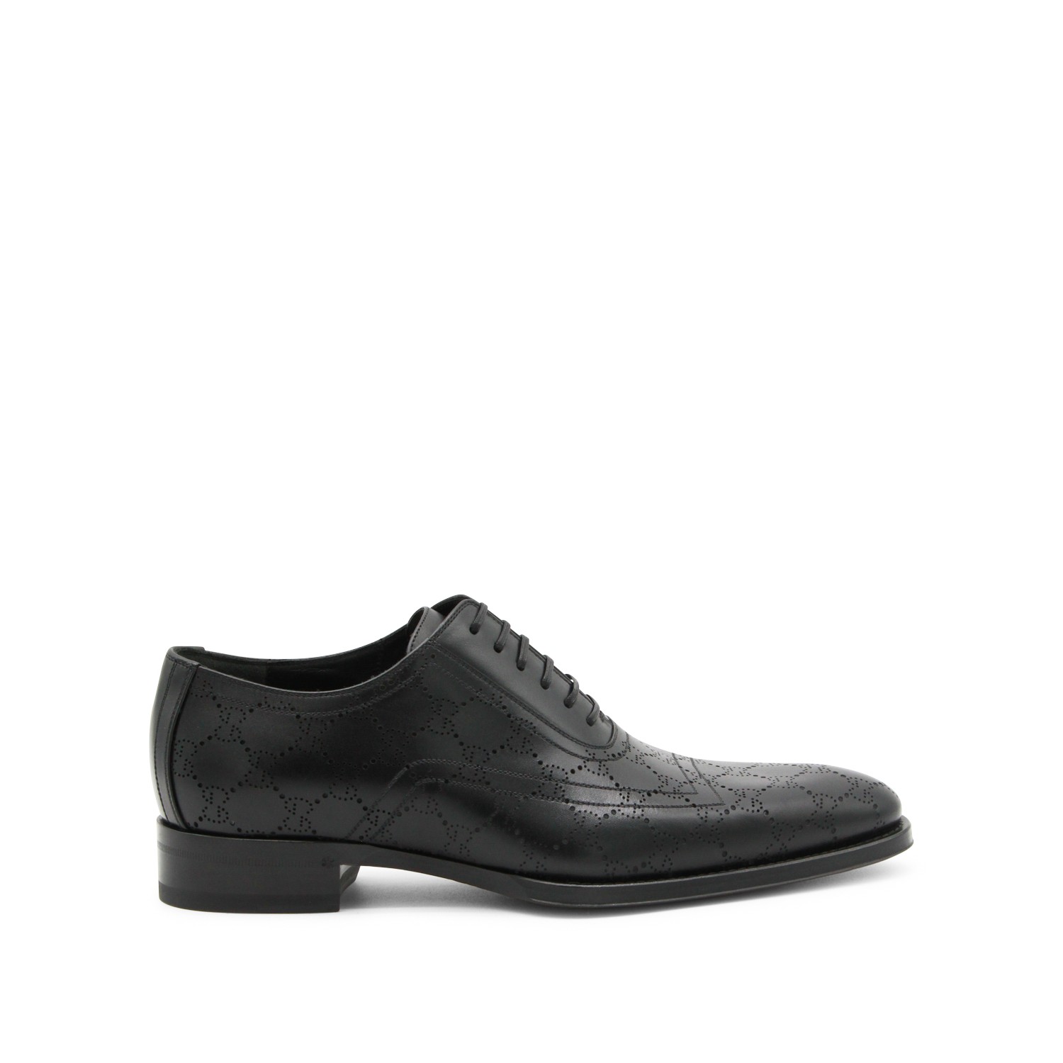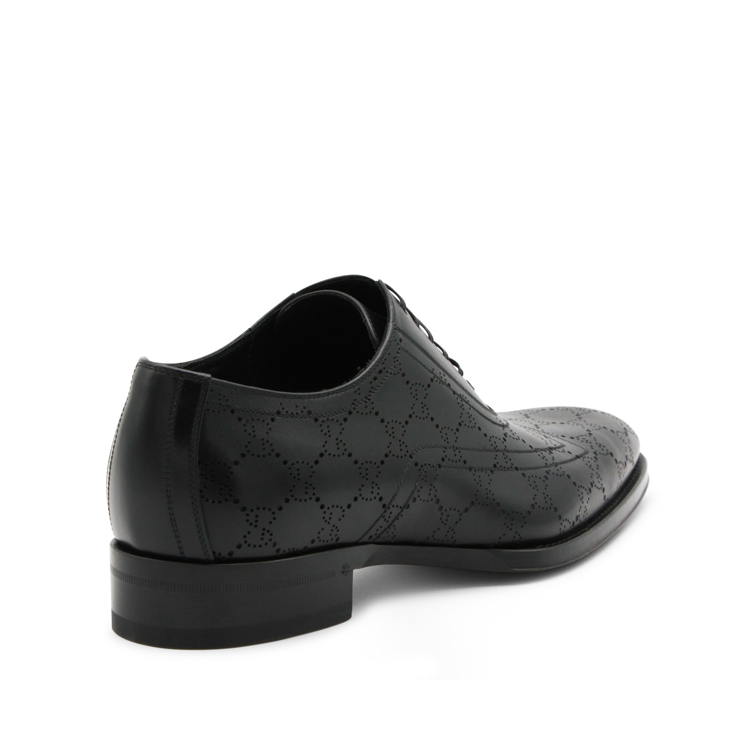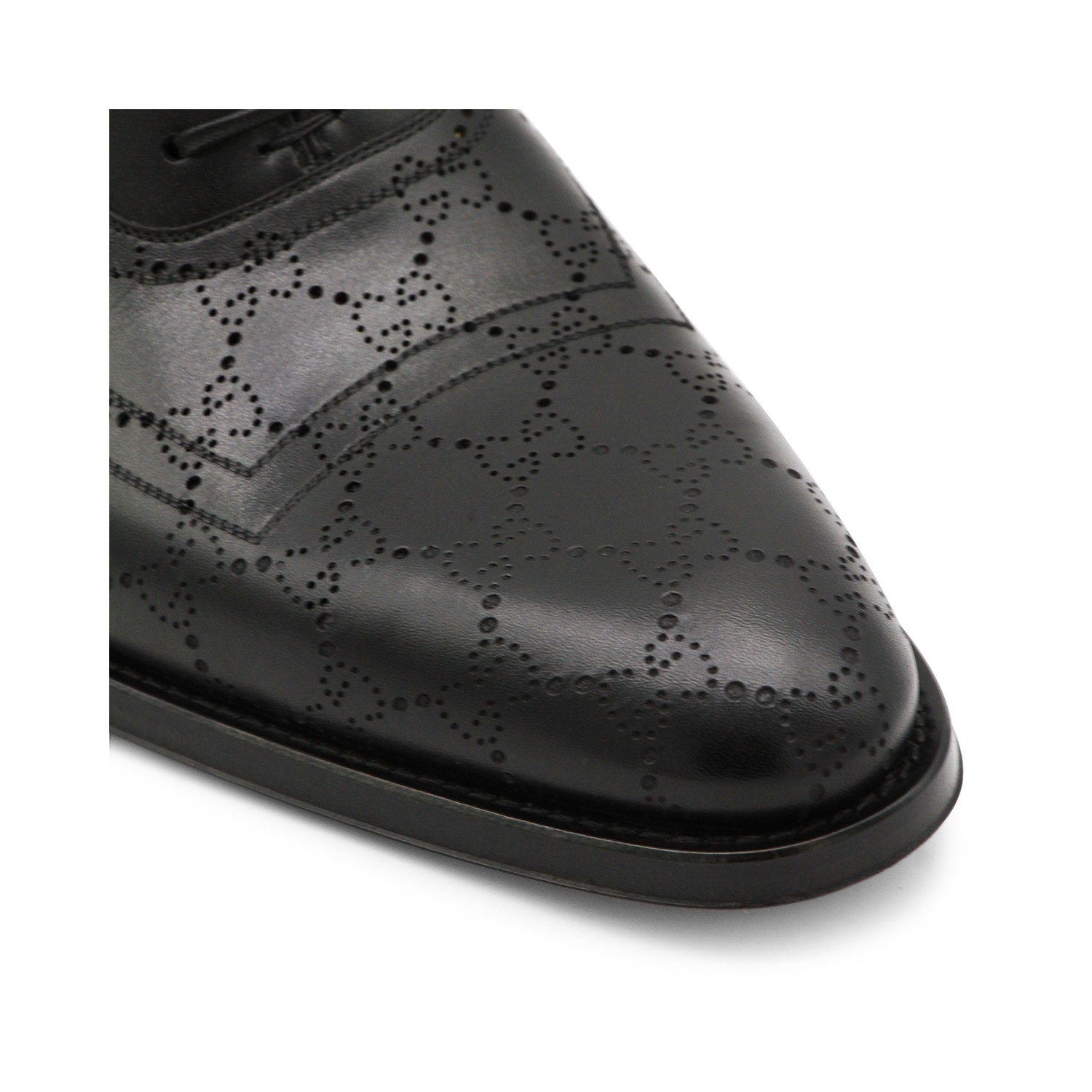 Black leather lace up shoes from Gucci featuring embossed all over GG motif, classic lace up line, square toe and branded insole.