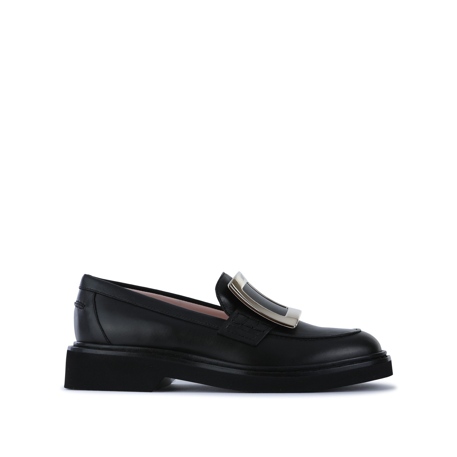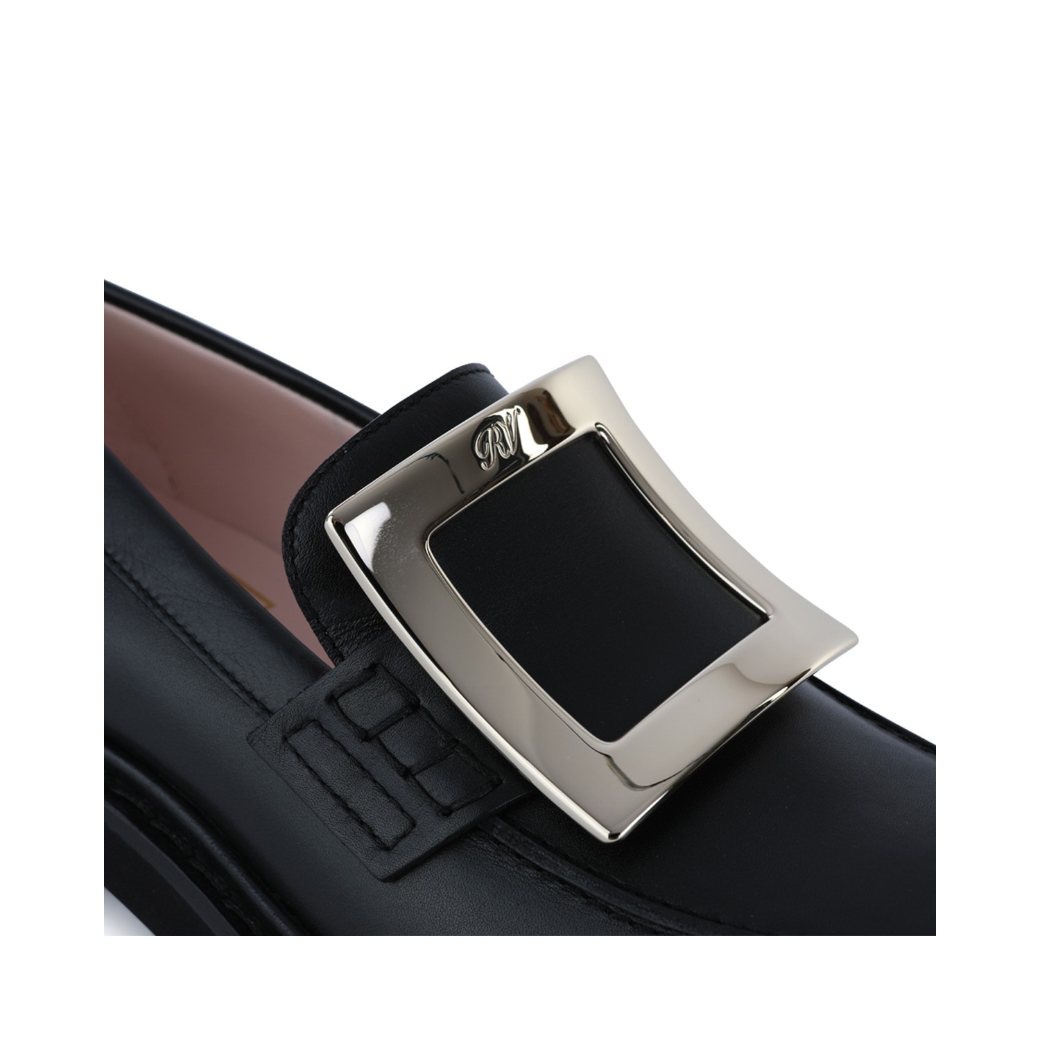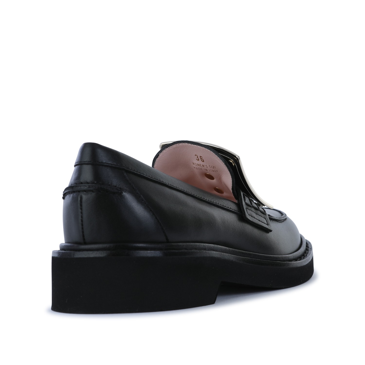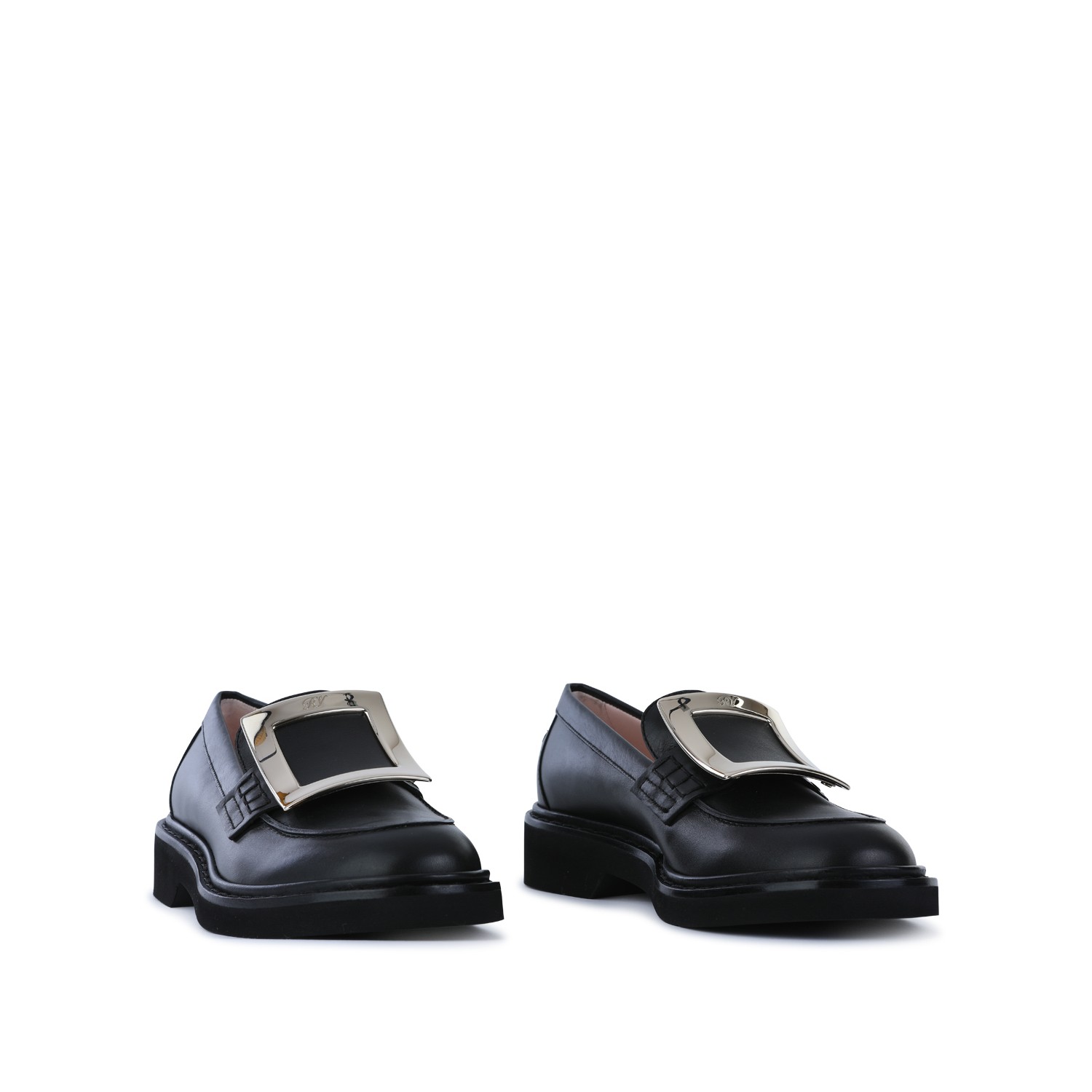 Black leather loafers from Roger Vivier featuring round toe, silver tone metal buckle detail, slip-on style and leather sole.