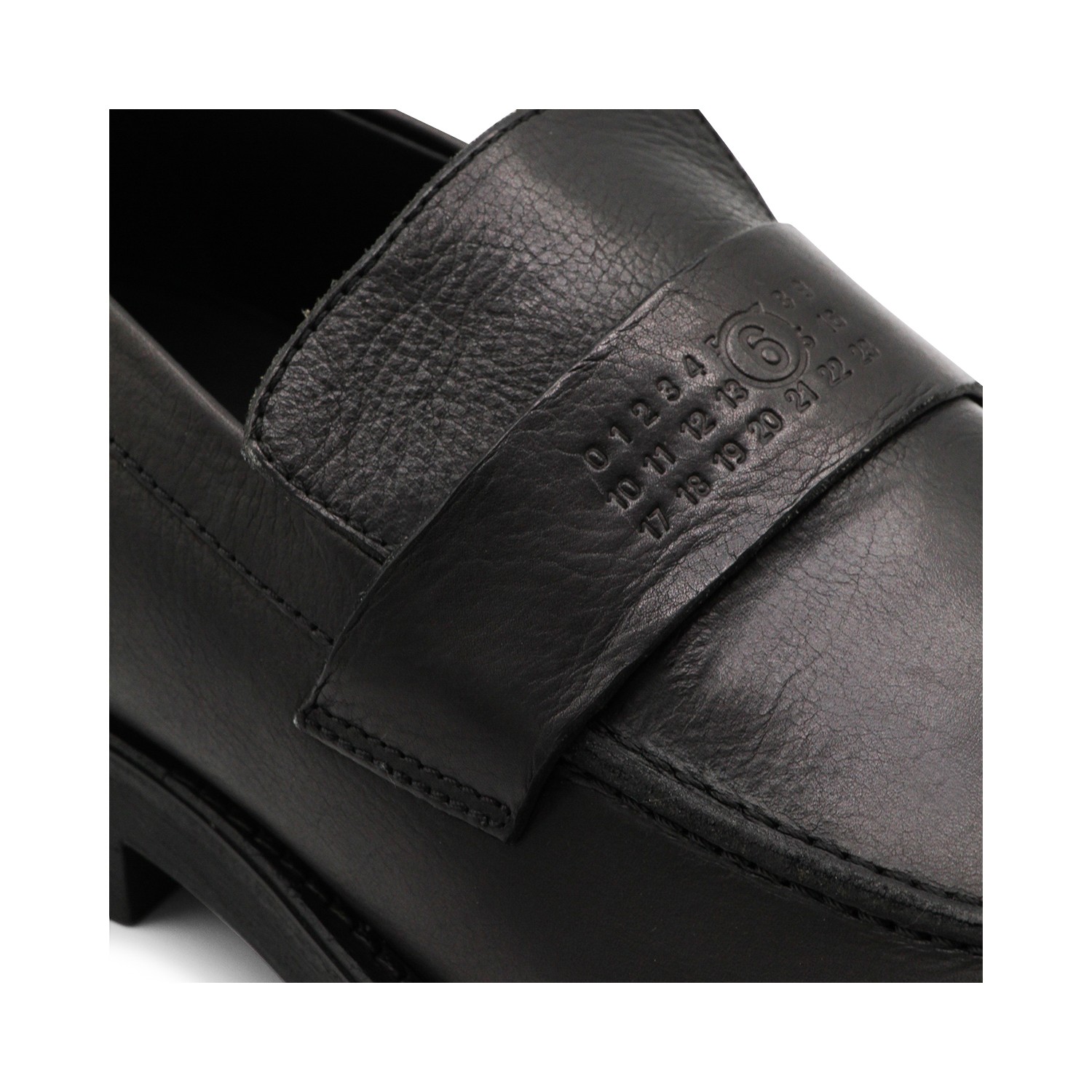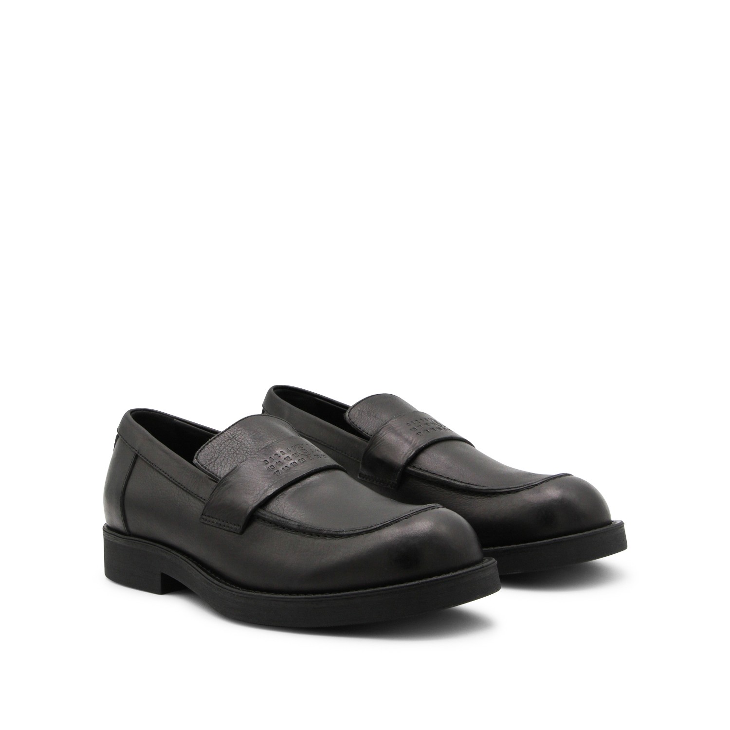 Black leather loafers from MM6 Maison Margiela featuring round toe, slip-on style, frontal logo and rubber sole.
