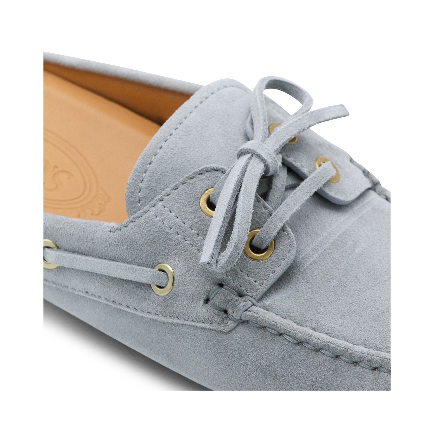 Grey leather loafers from Tod's featuring round toe, slip-on style, open back, lace detail, stitchings and rubber sole.