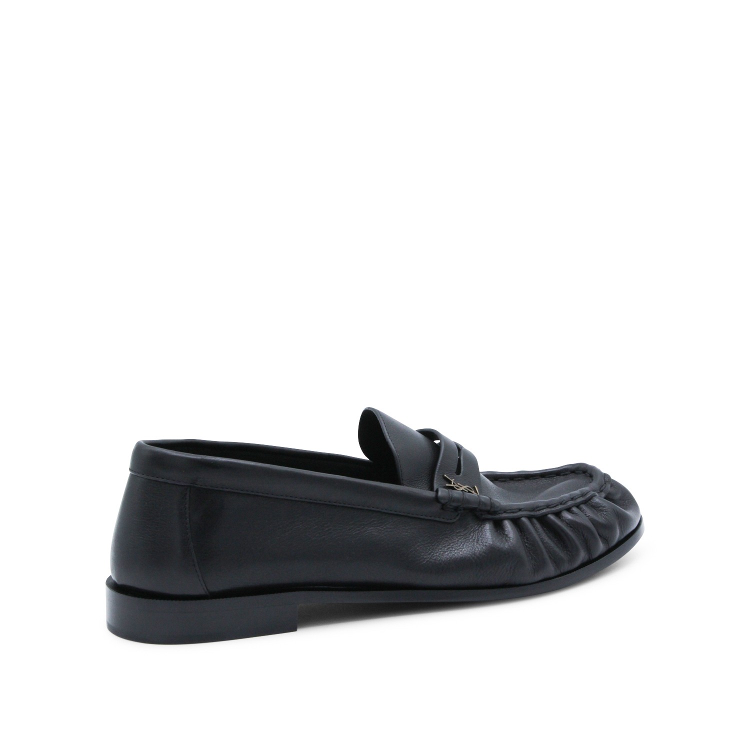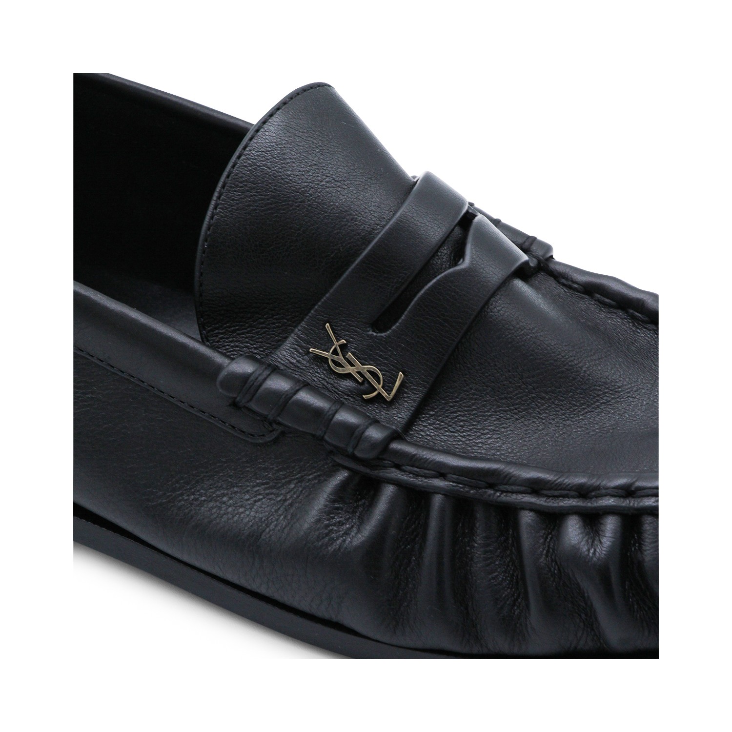 Black leather loafers from Saint Laurent featuring round toe, slip-on style, hand-stitched moc toe, gold tone logo and leather sole.