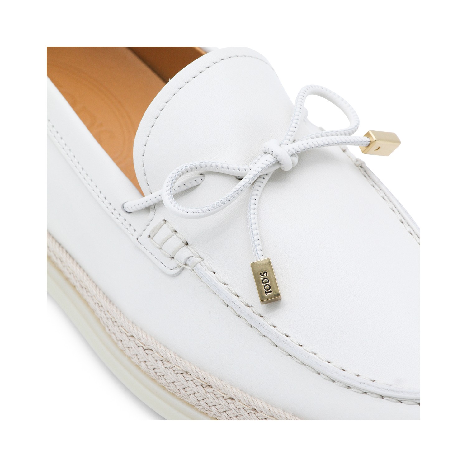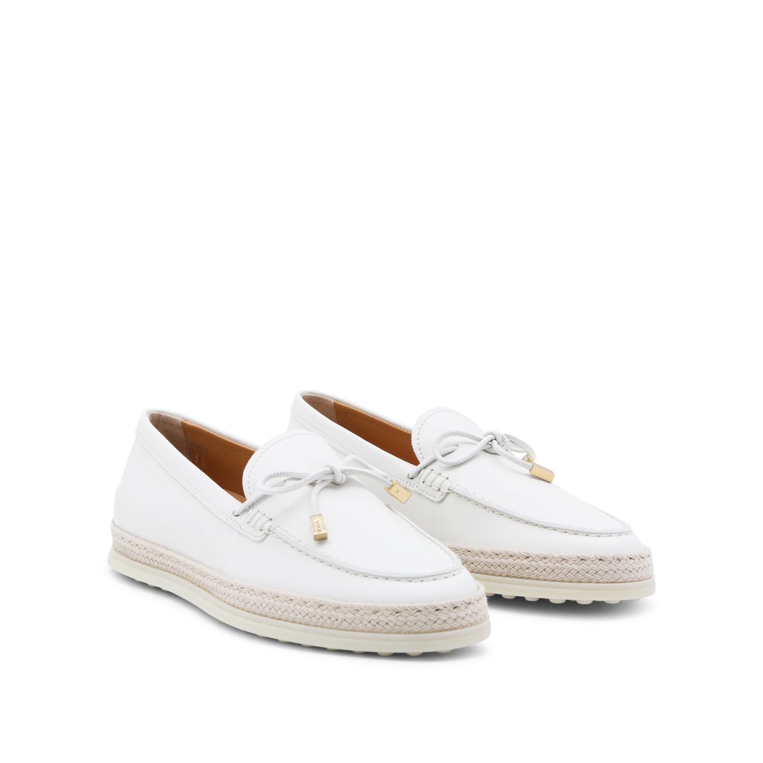 White loafers from Tod's featuring round toe, raffia, leather sole and details.
