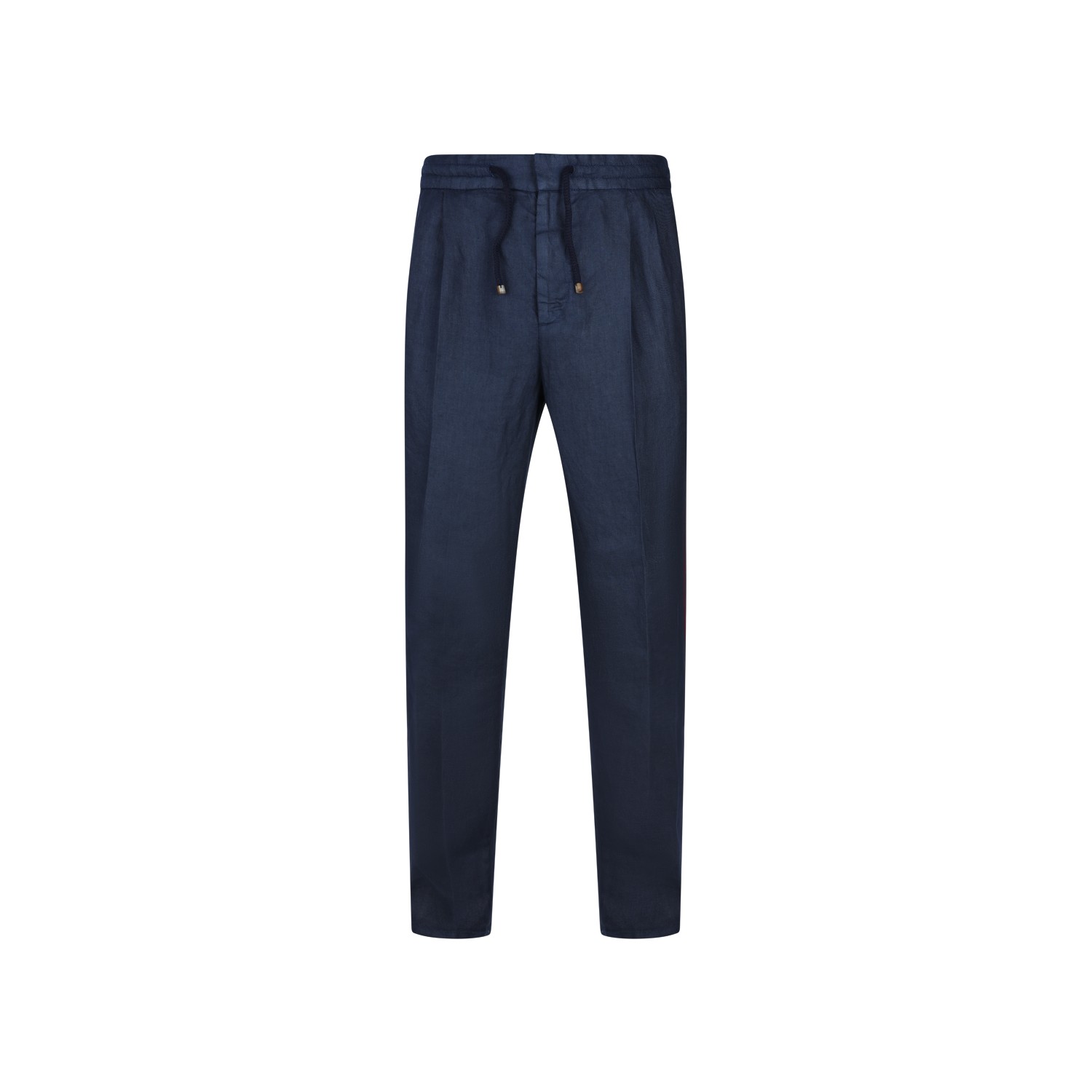 Navy linen pants from Brunello Cucinelli featuring high elasticated waist, cotton laces, back pockets and regular vestibility.