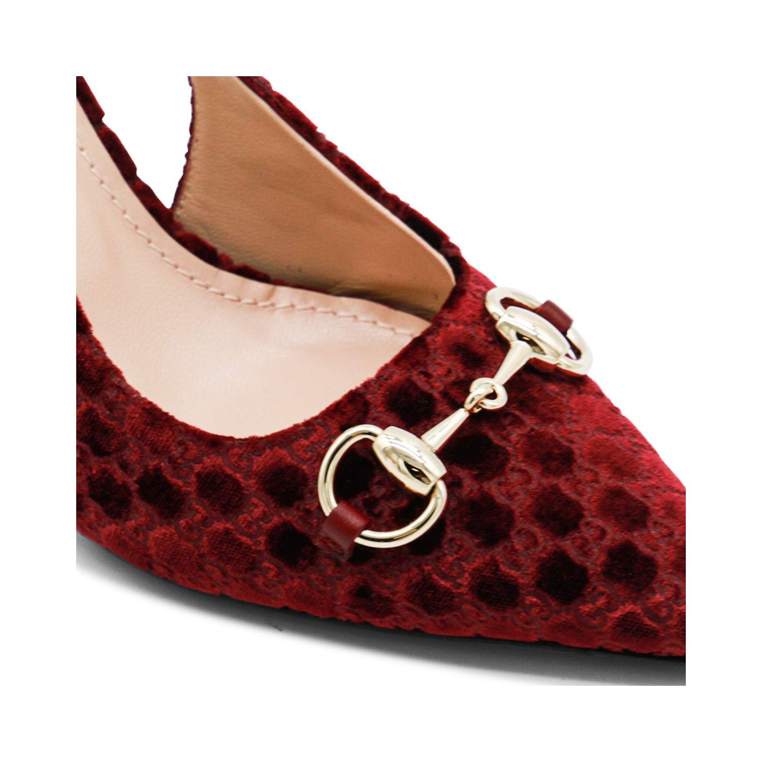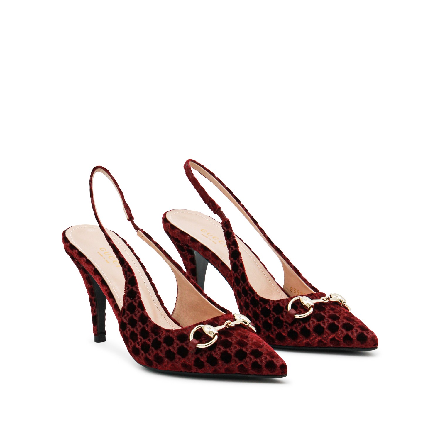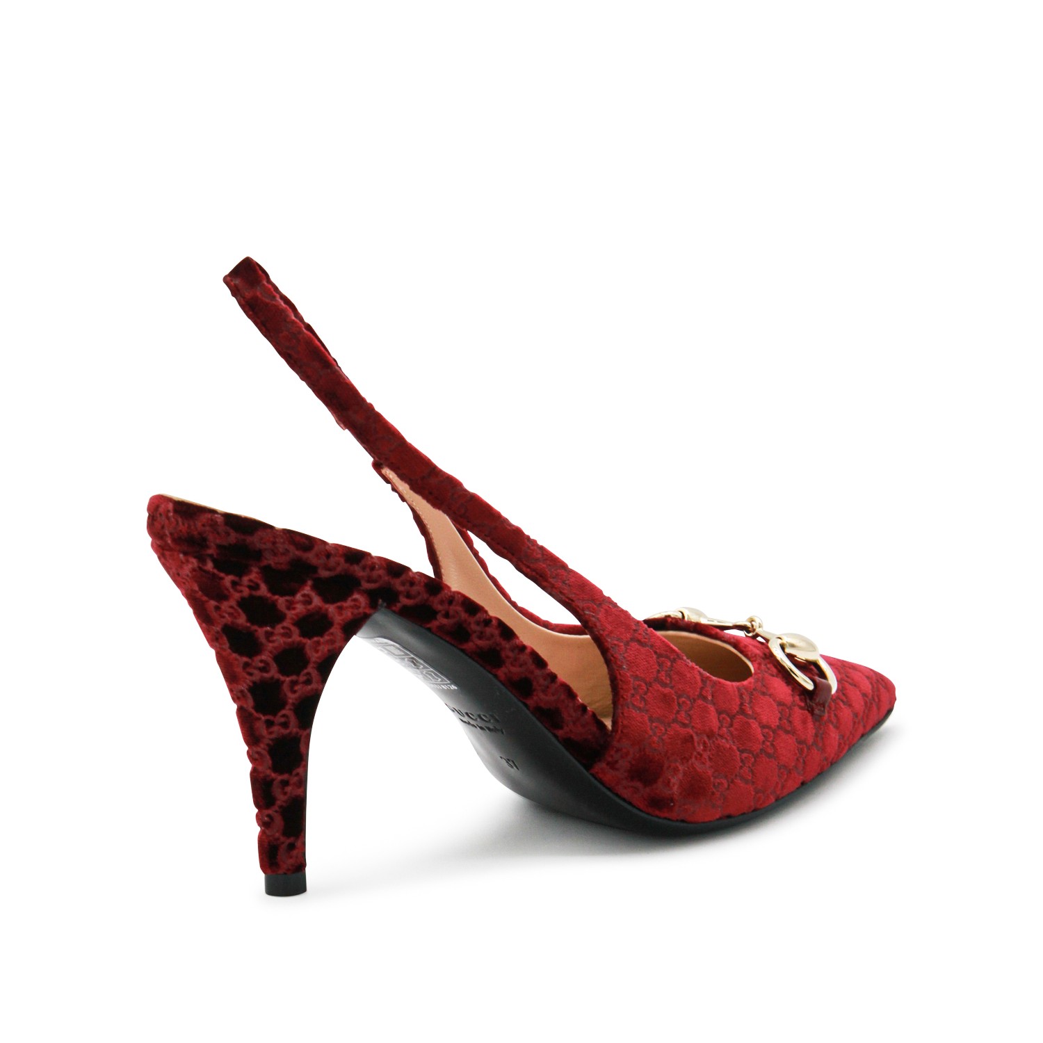Dark red pumps from Gucci featuring pointed toe, stiletto heel, silver tone hardware and open back.