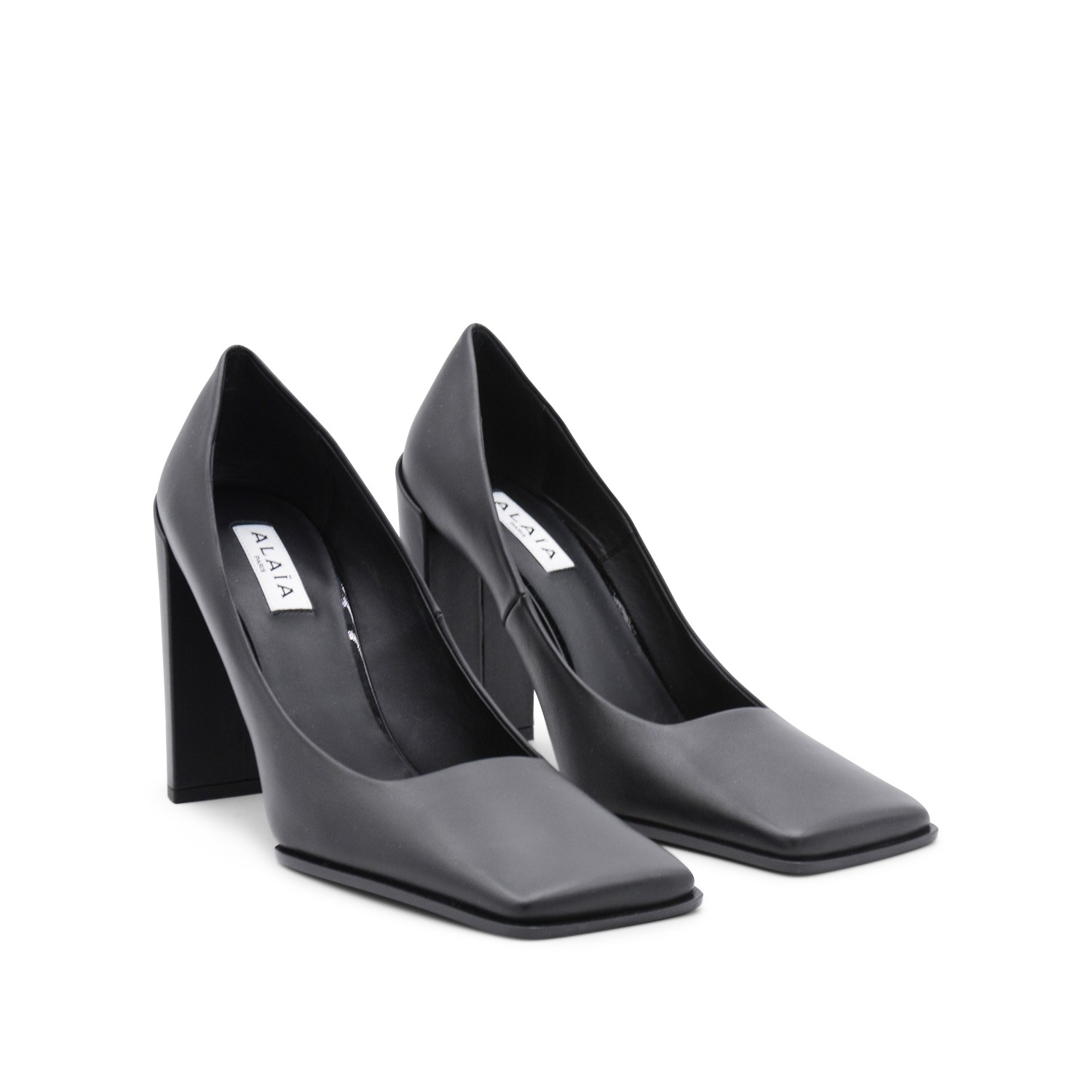 Black leather pumps from Alaia featuring square toe, slip-on style and mid block heel.