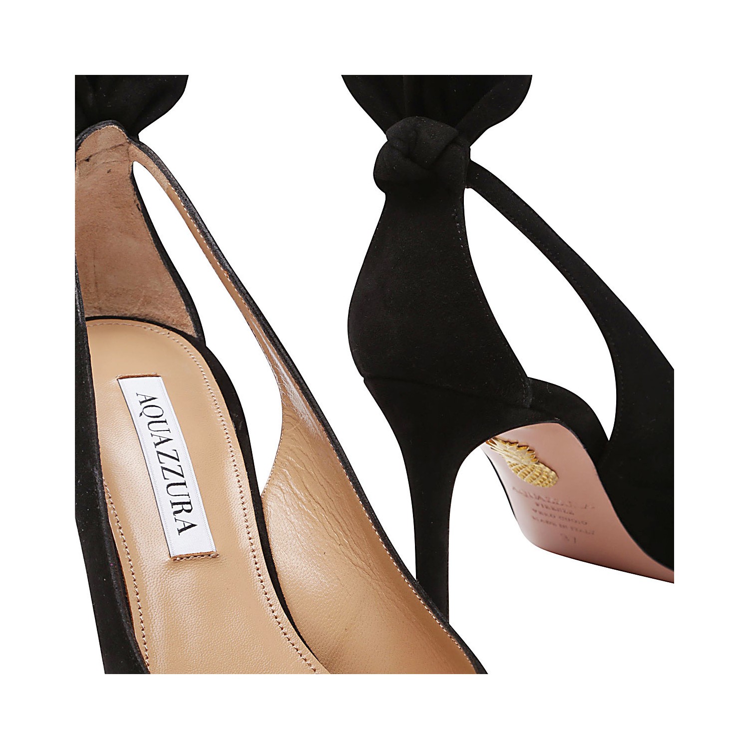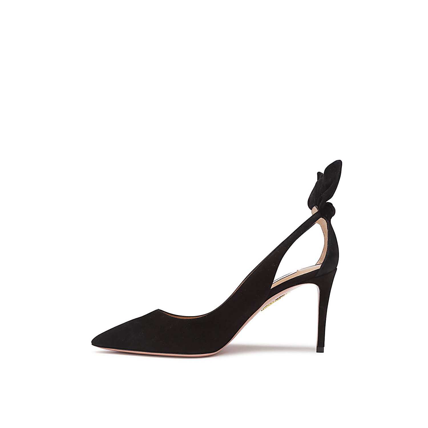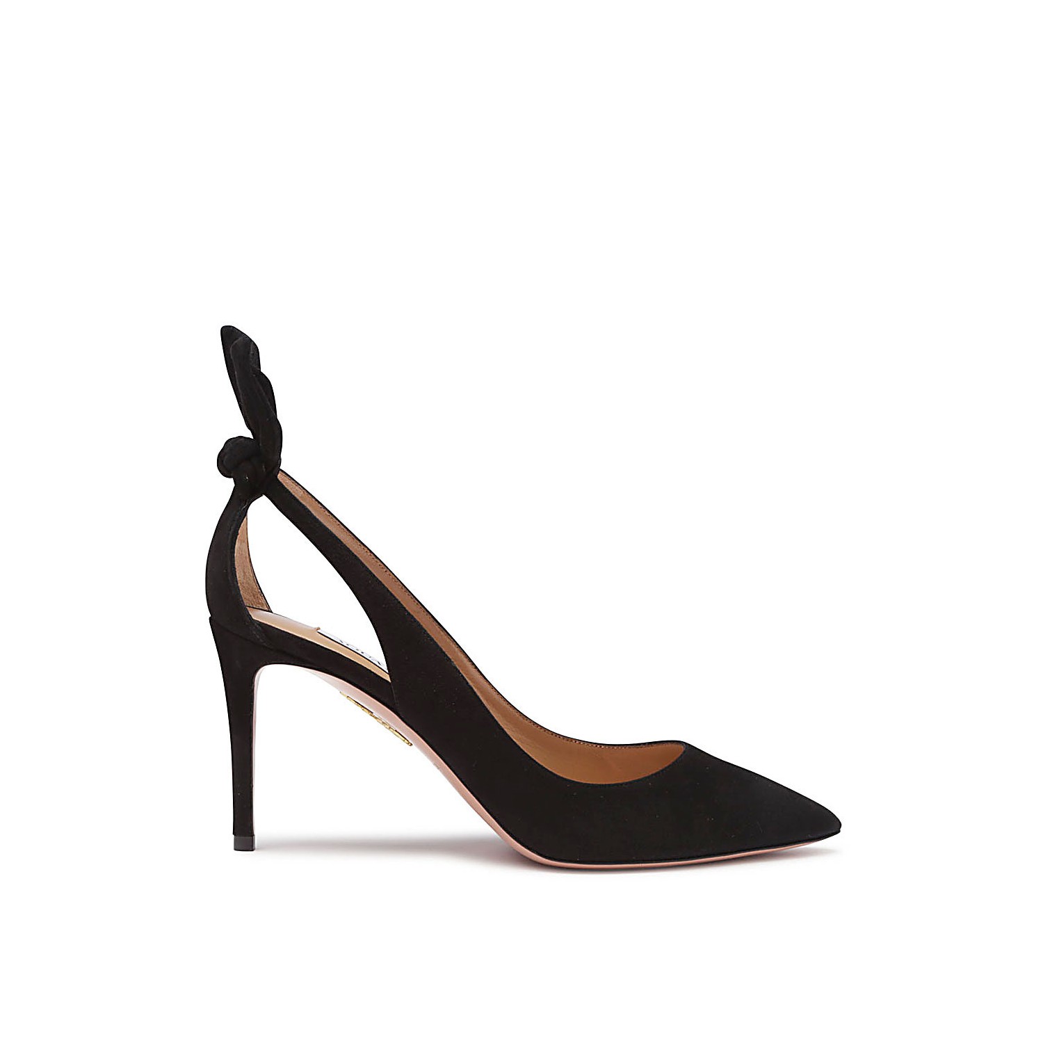 Black suede Bow Tie pumps from Aquazzura featuring pointed toe, bow detail, leather sole, branded insole and high stiletto heel.