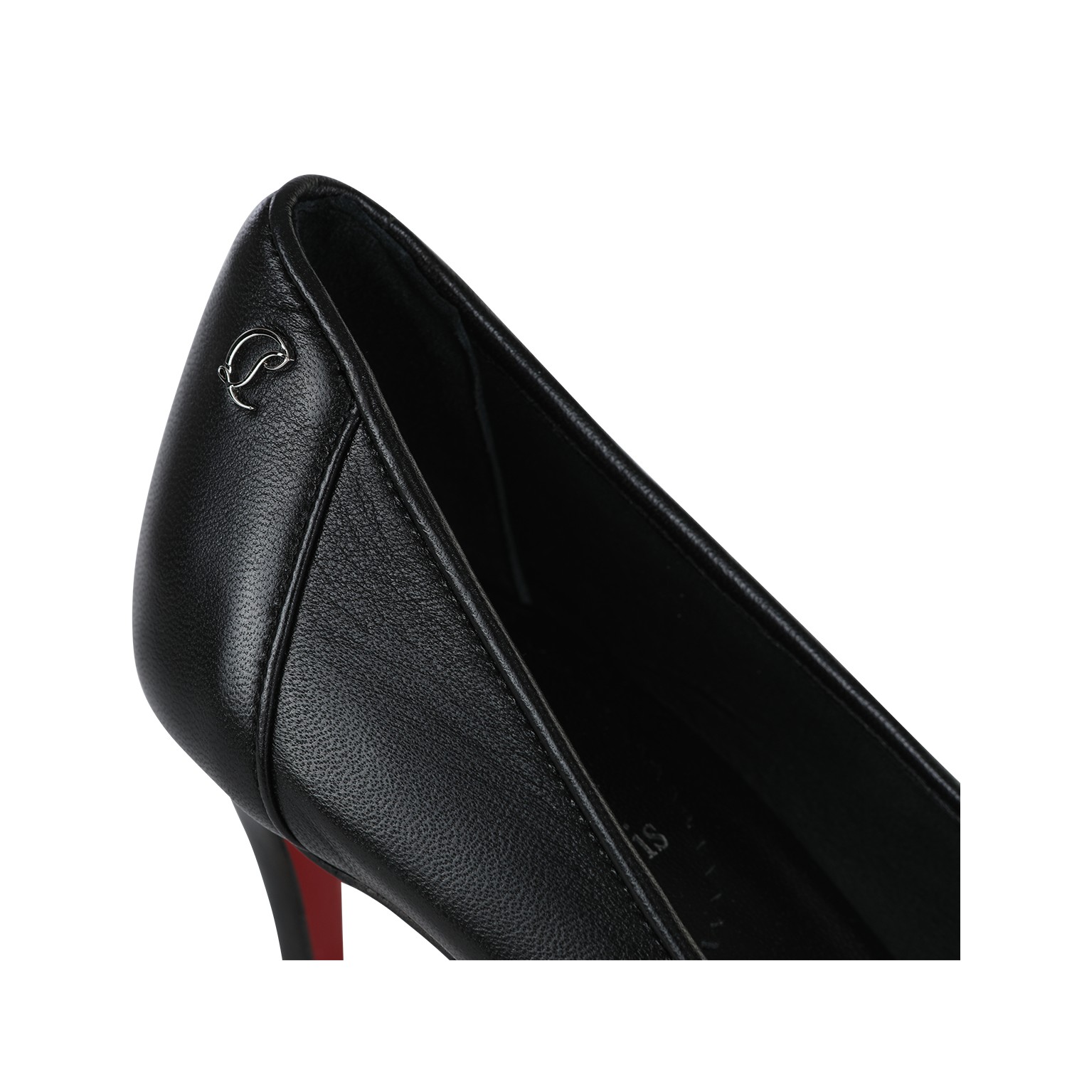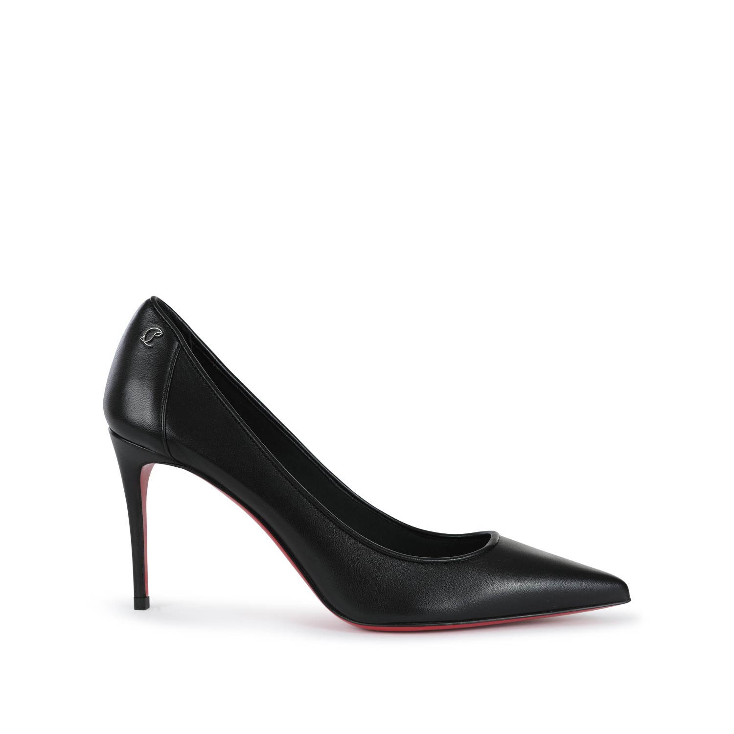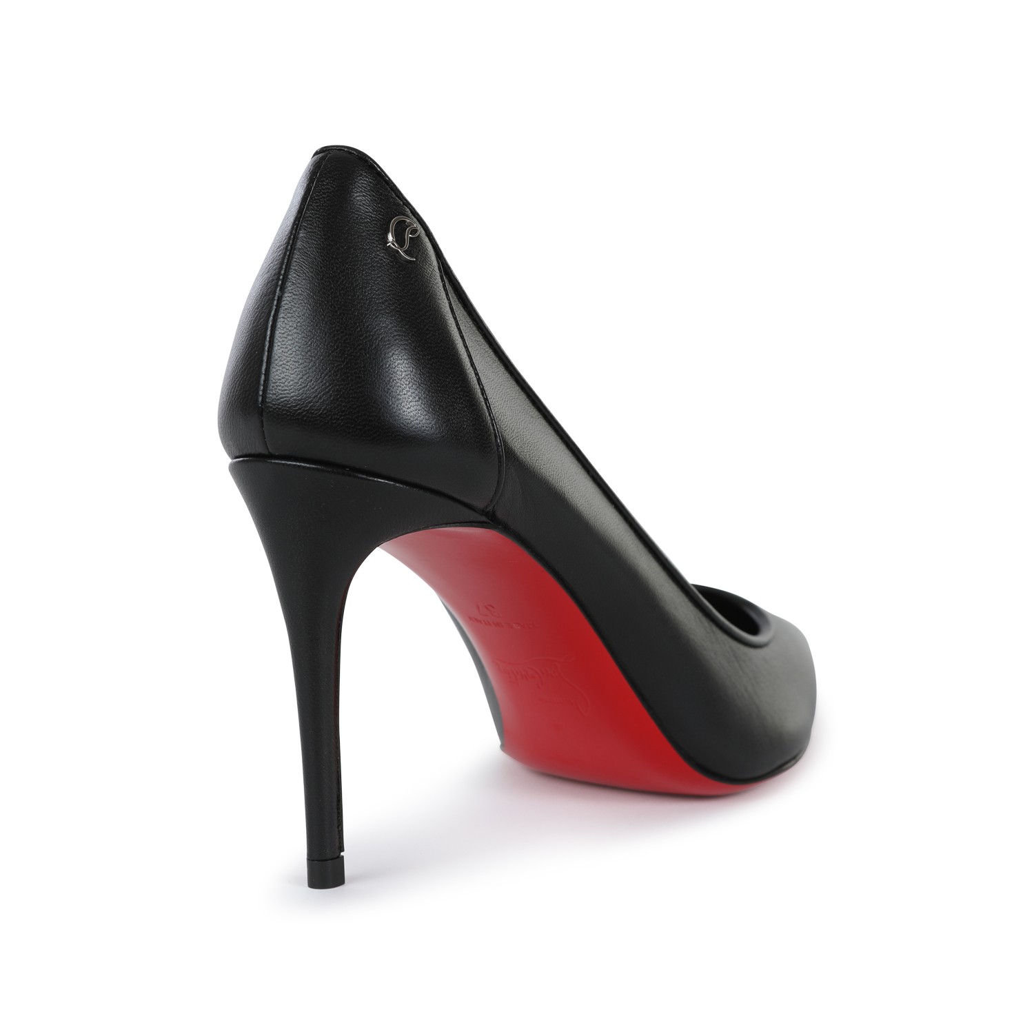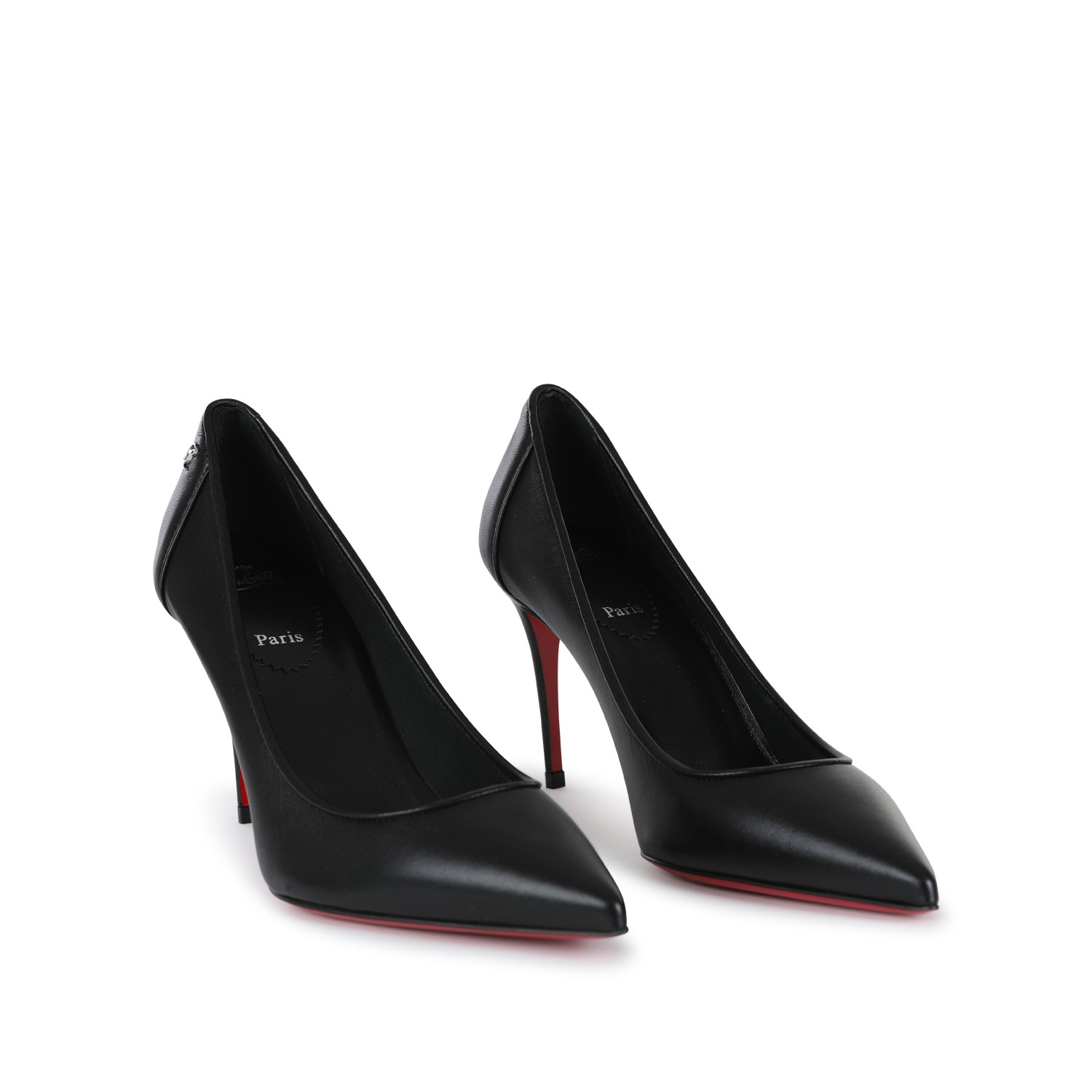 Black leather Sporty Kate 85 pumps from Christian Louboutin featuring pointed toe, stiletto heel and logo.