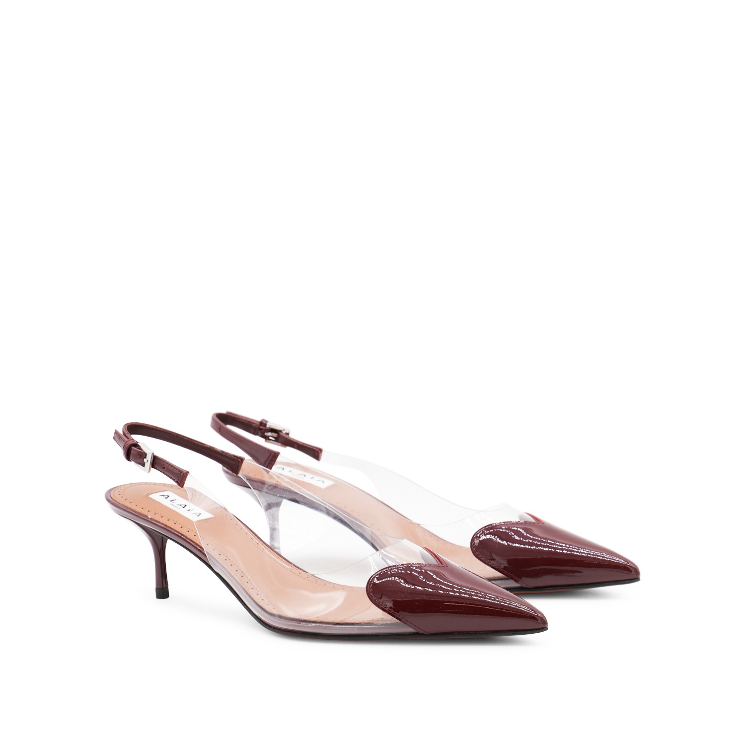 Dark red and trasparent pumps from Alaia featuring pointed toe, stiletto heel, buckle fastening and leather sole.