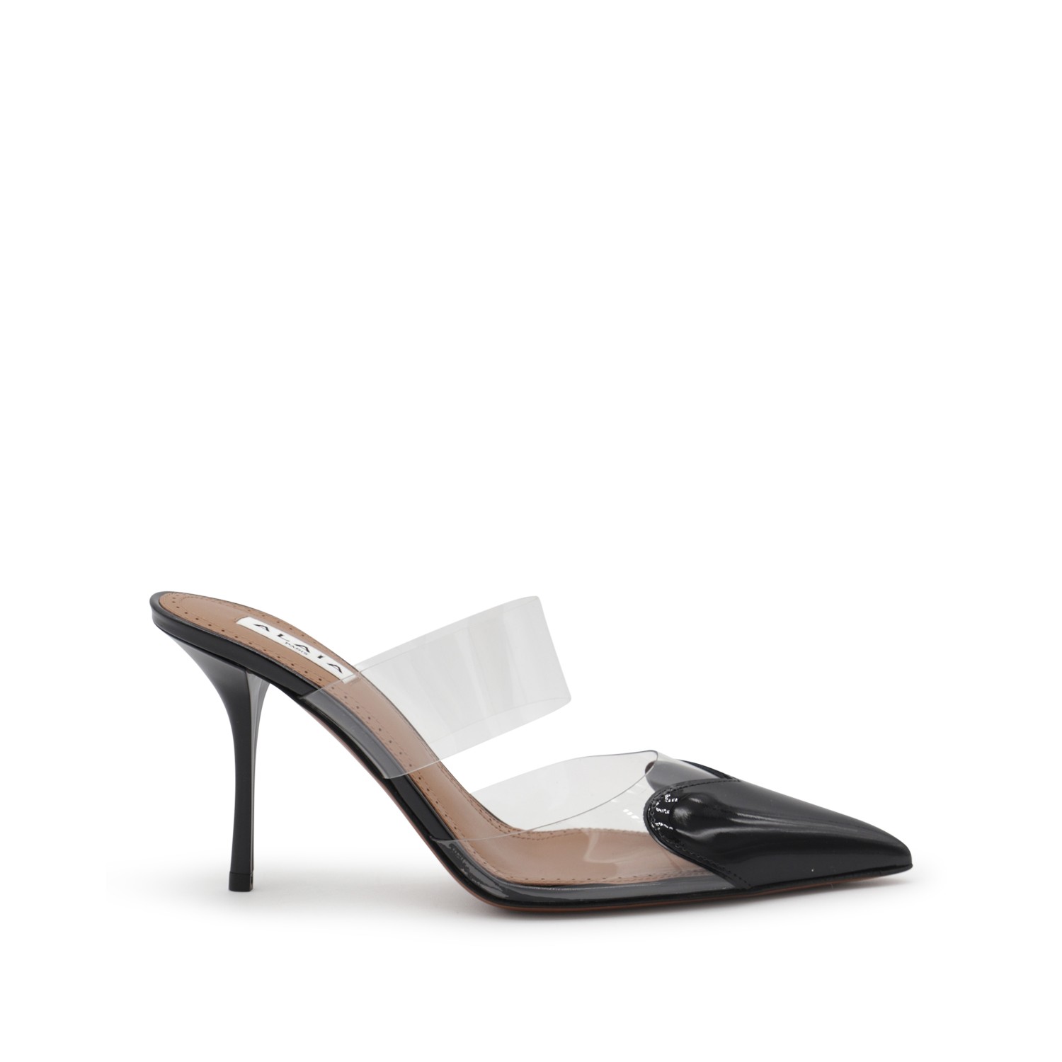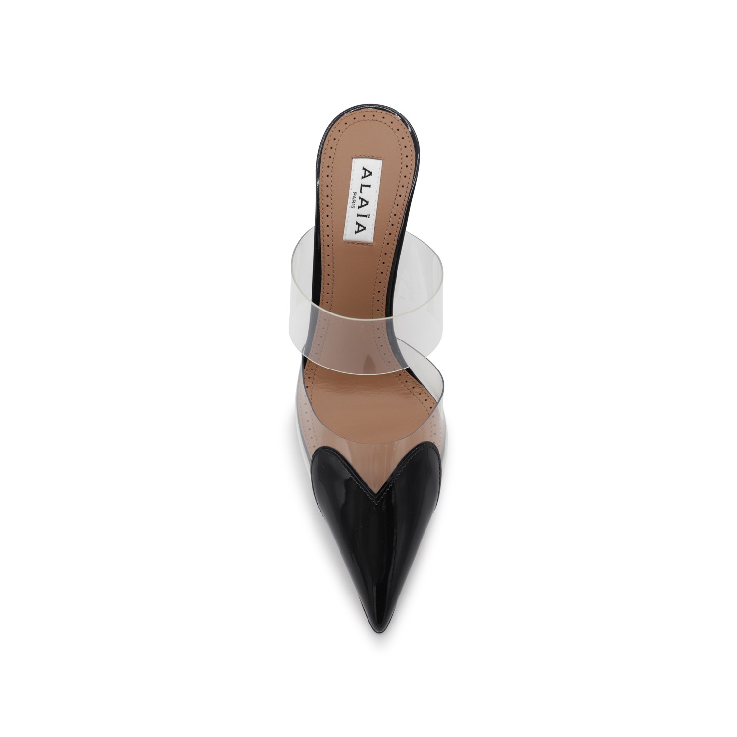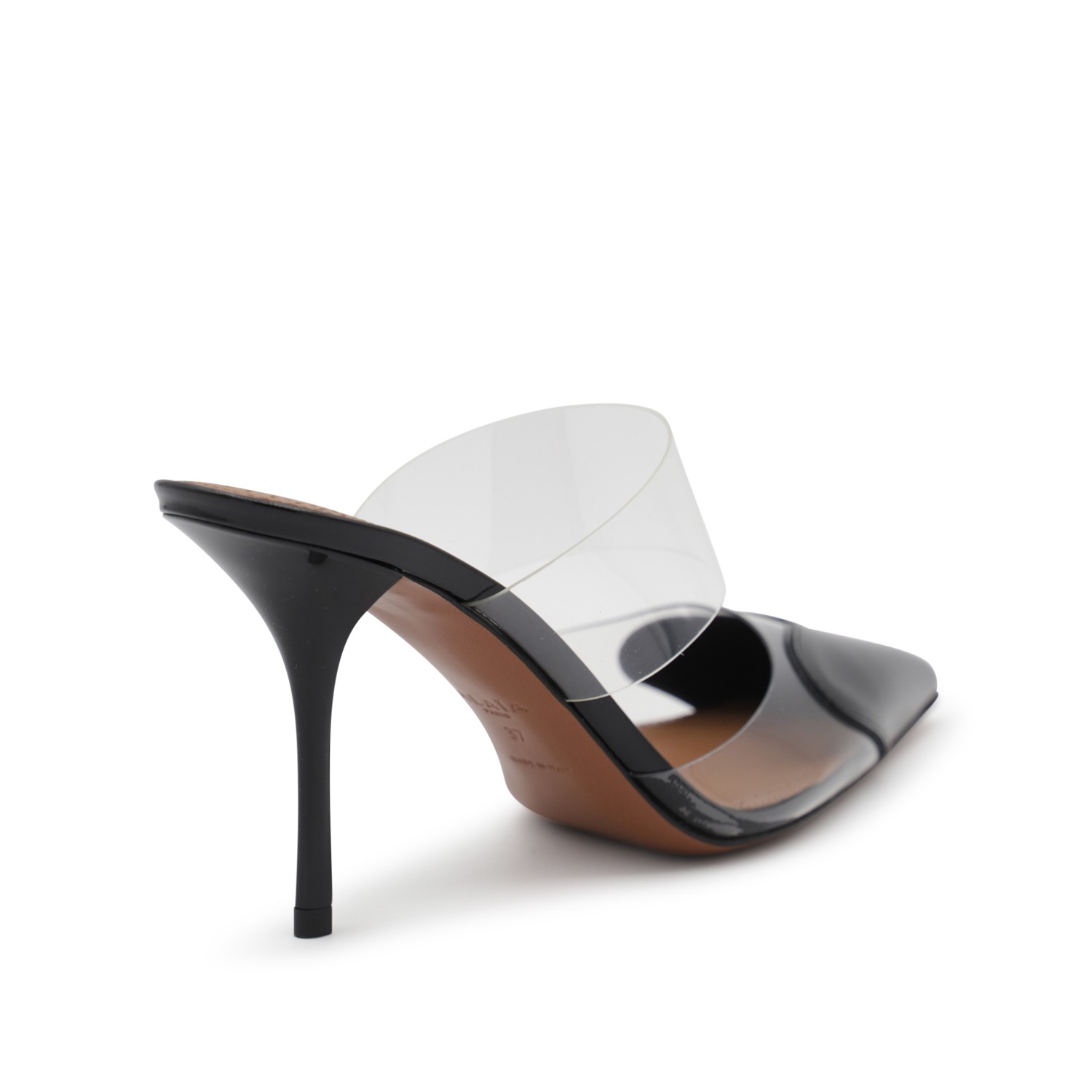 Black Mules 90 pumps from Alaia featuring pointed toe, trasparence details, stiletto heel and open back.