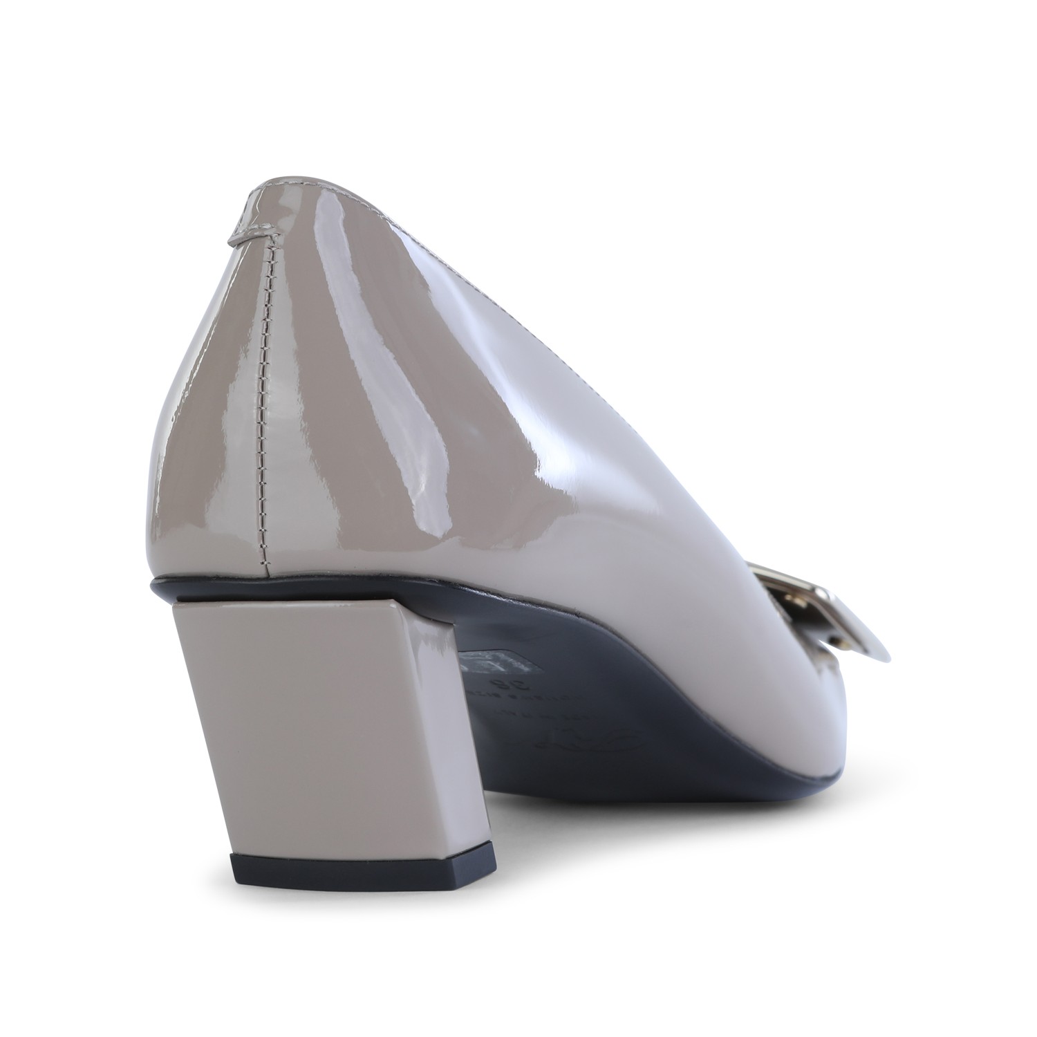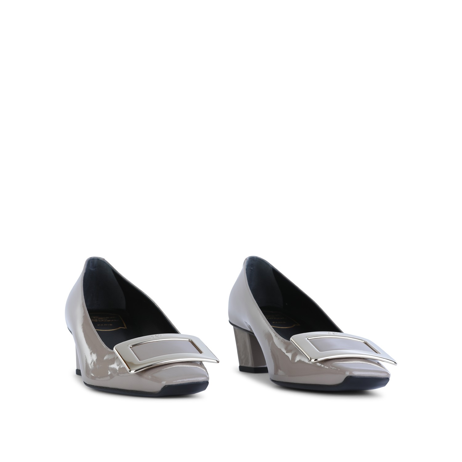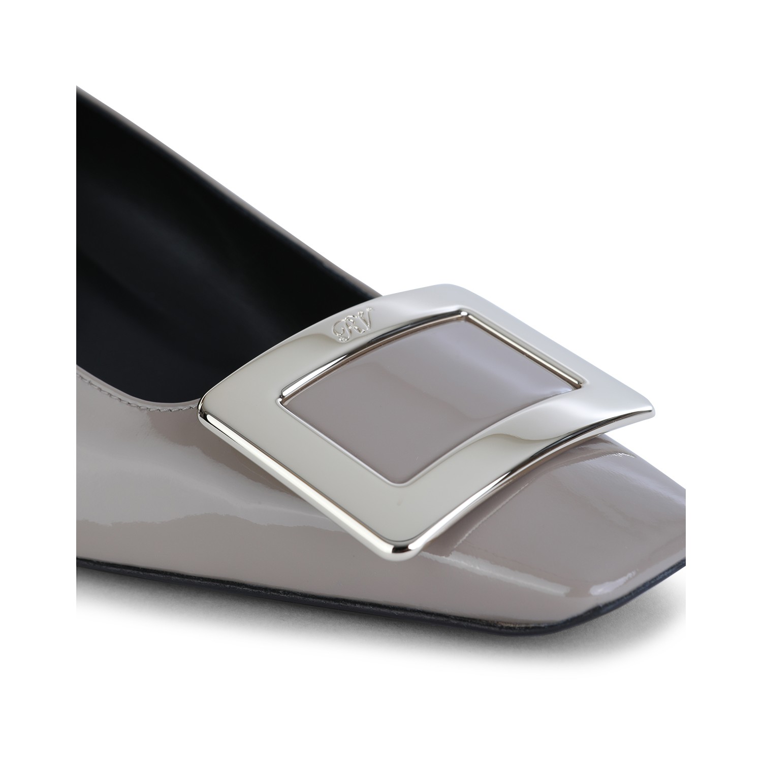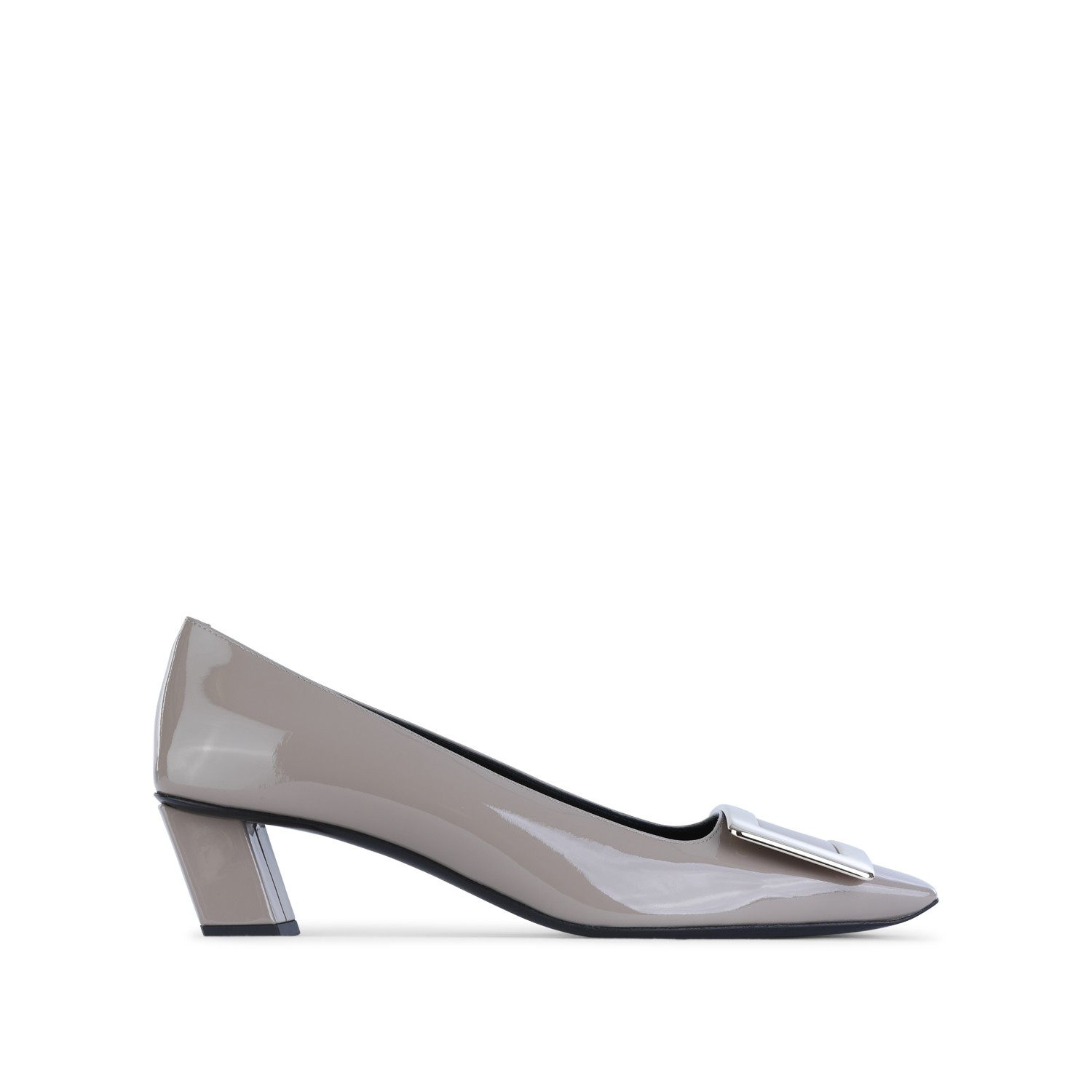 Grey leather pumps from Roger Vivier featuring square toe, square heel, frontal detail, lucid finishes and leather sole.
