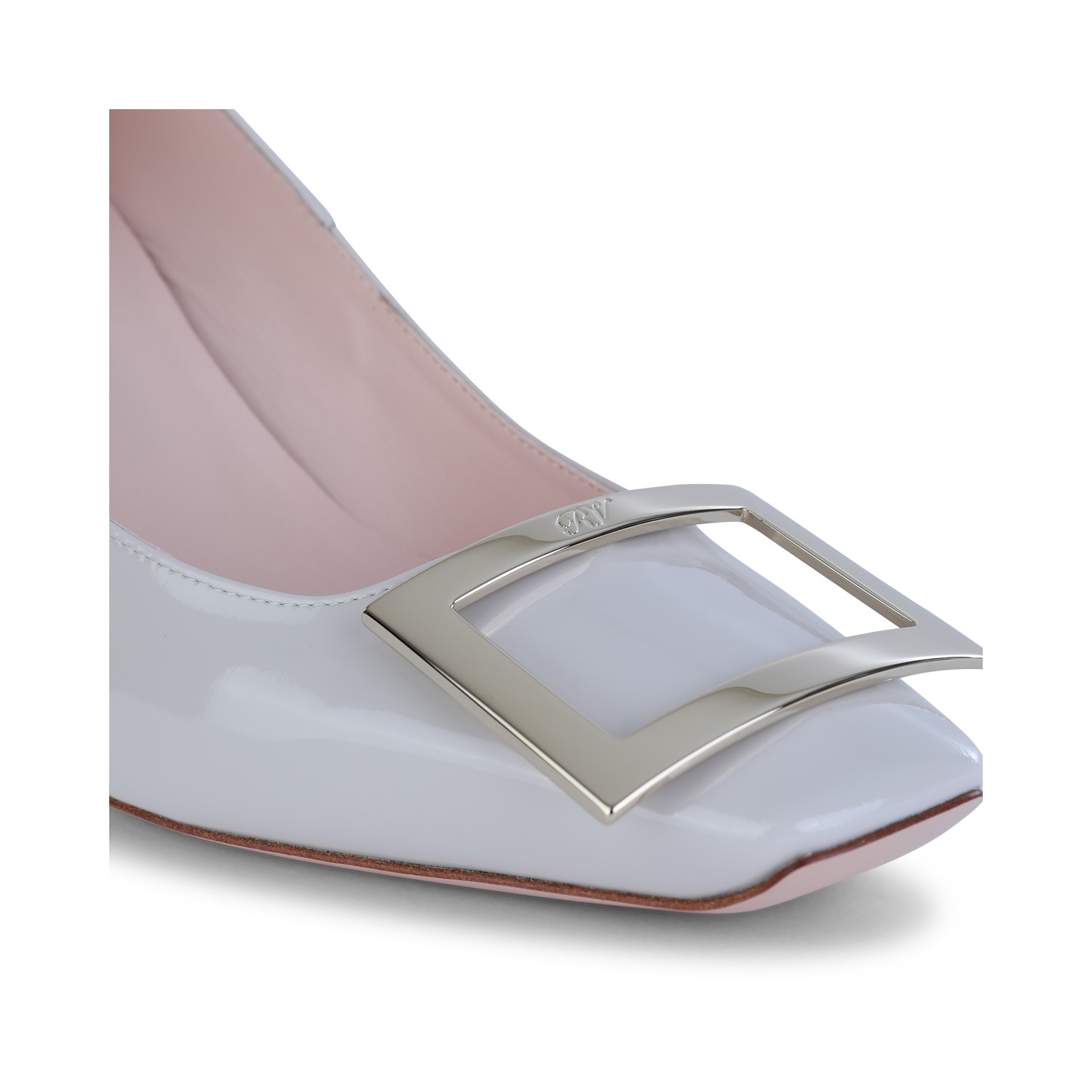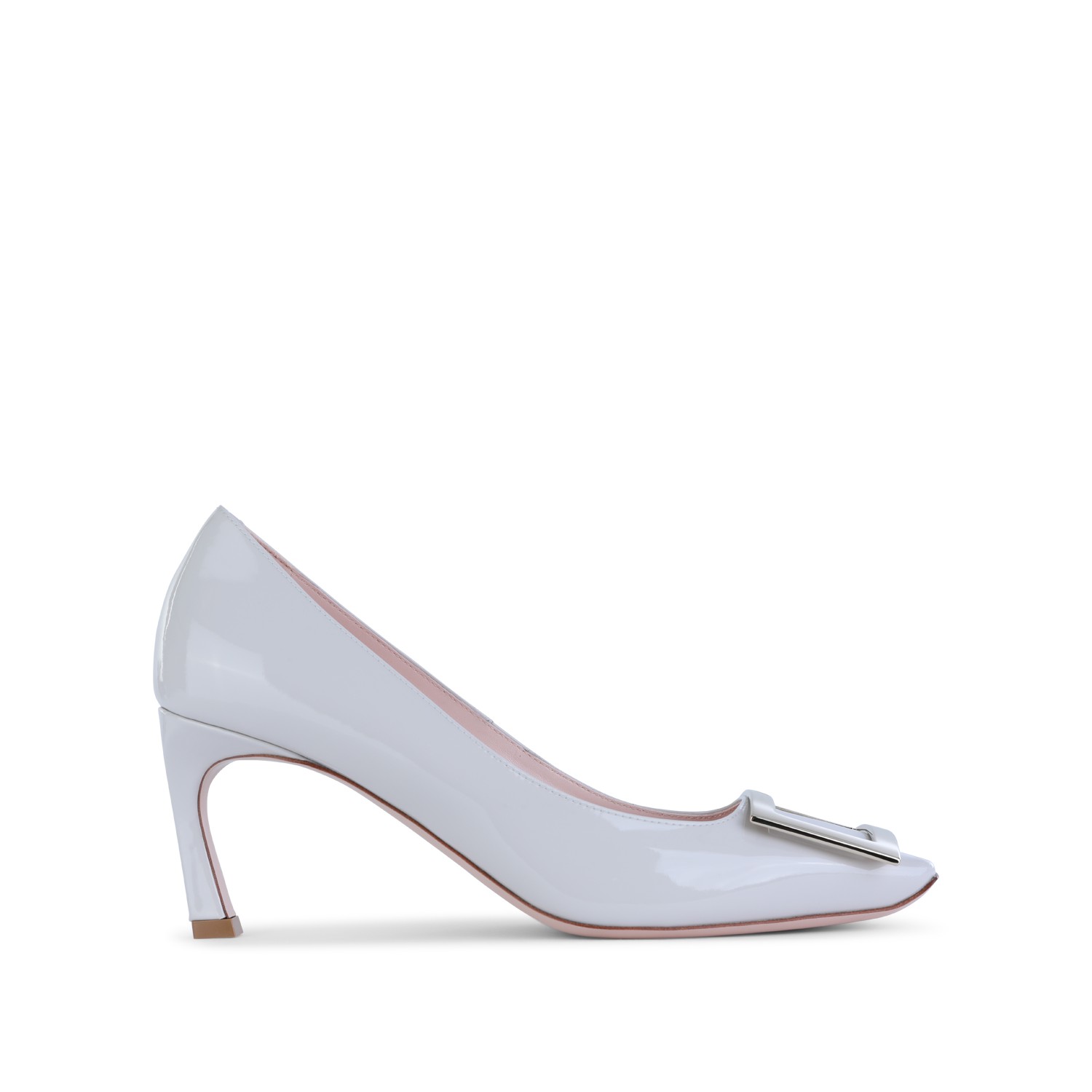 White leather pumps from Roger Vivier featuring square toe, square heel, frontal detail, lucid finishes and leather sole.